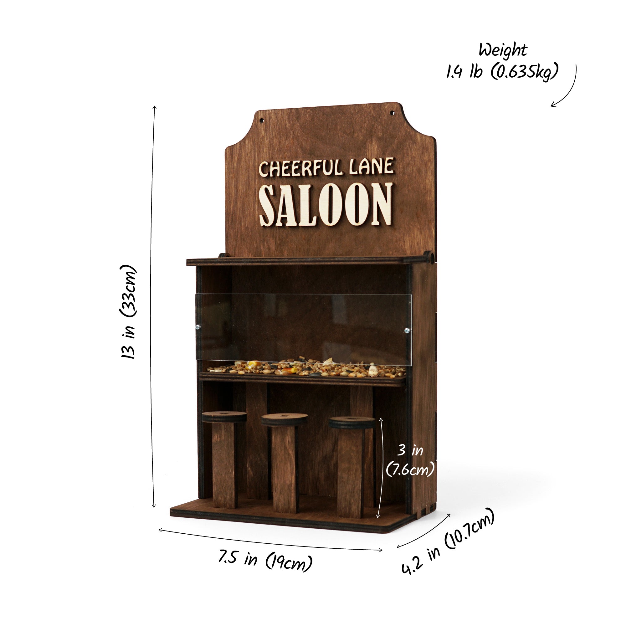 This bird feeder can be customized with your own short text instead of the 'Cheerful Lane Saloon'.