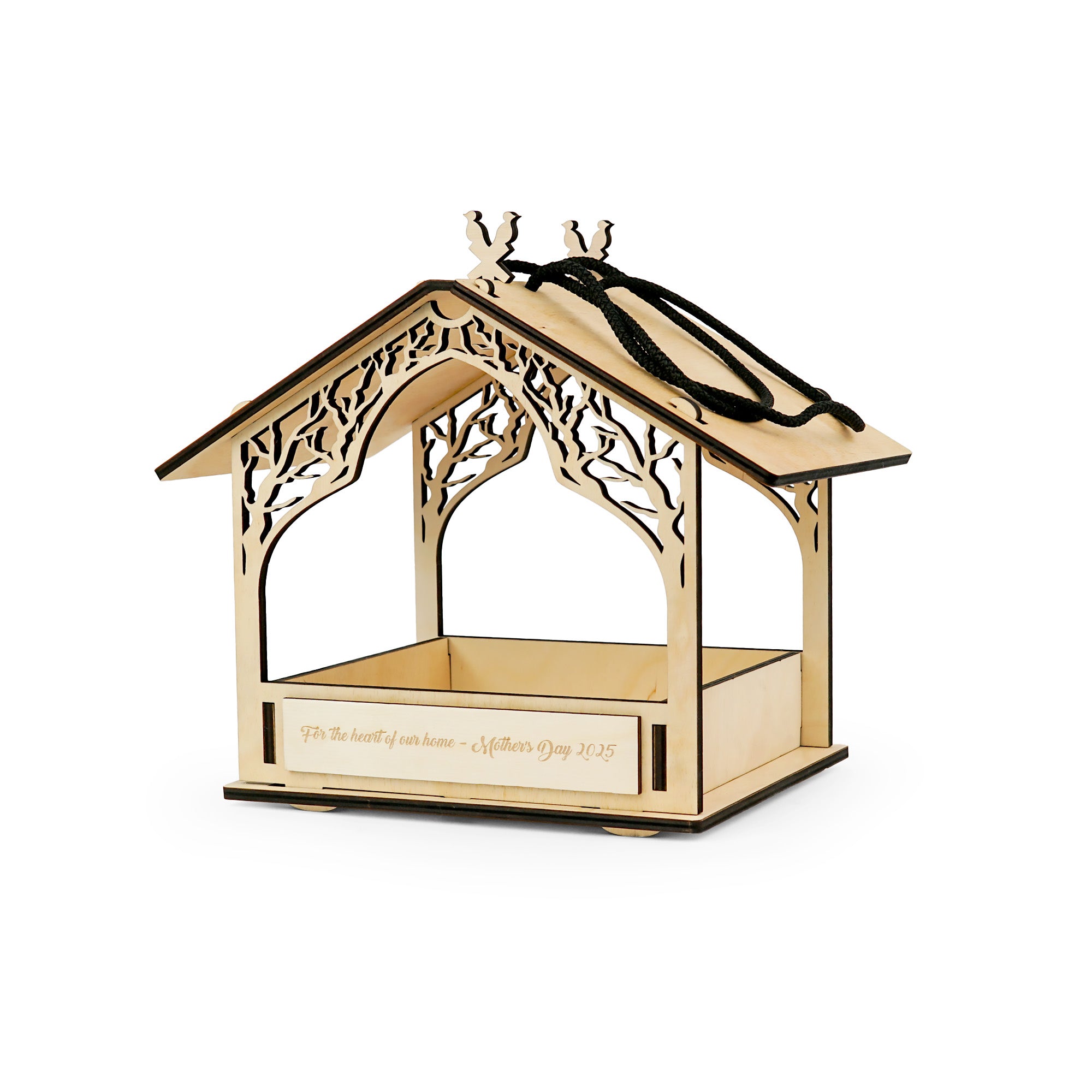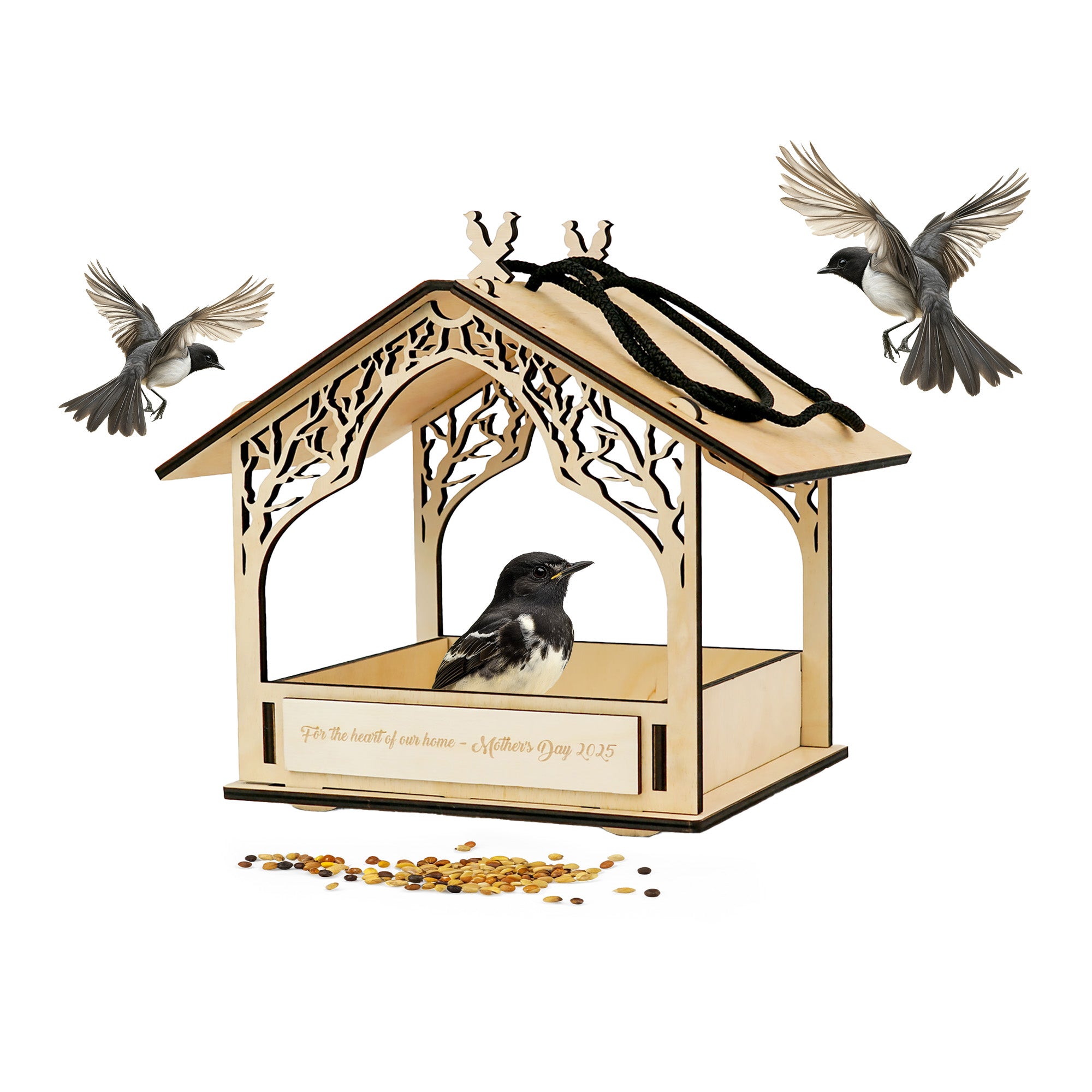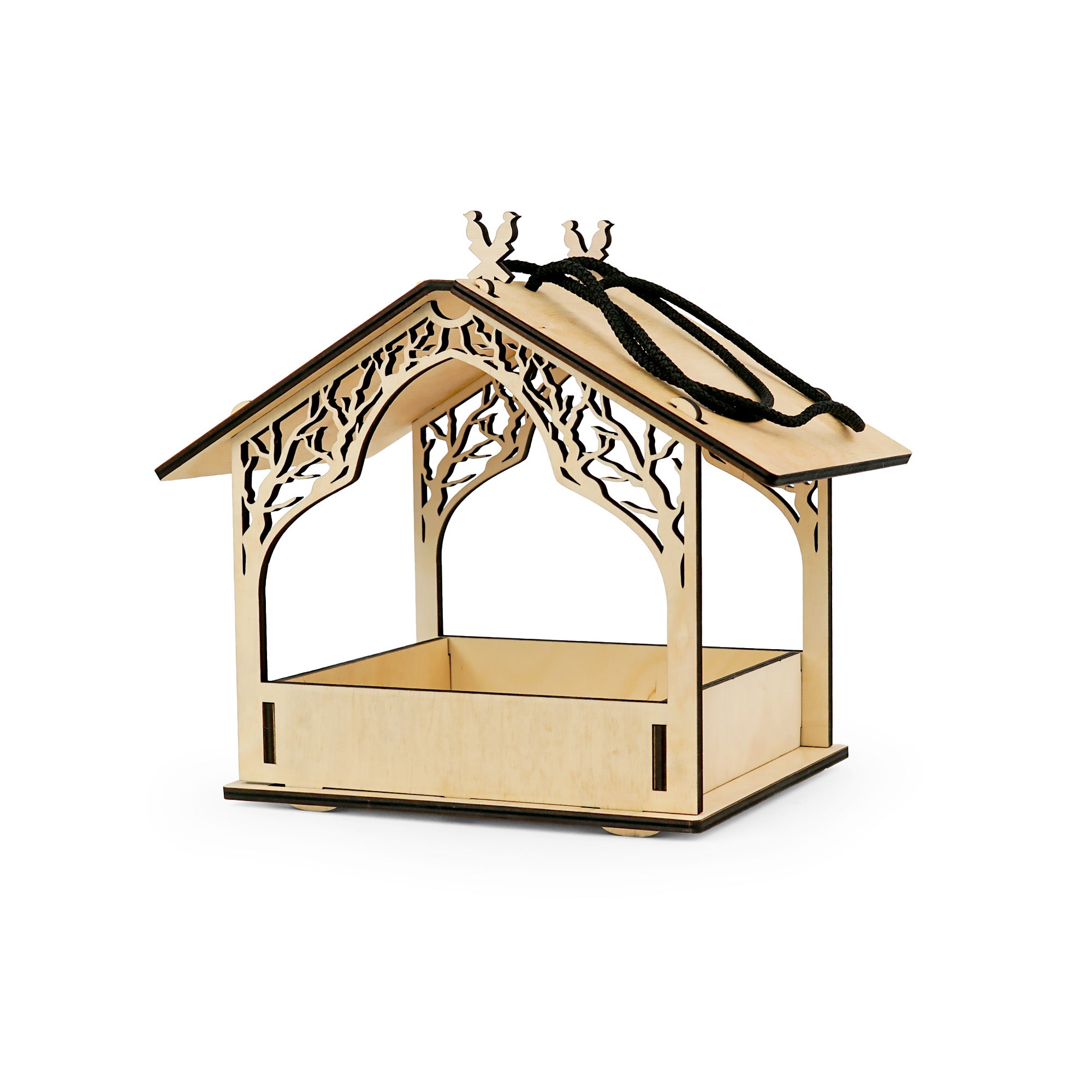 This wooden bird feeder is a handcrafted piece made from durable birch plywood, featuring a clean, modern design. Built to be both functional and decorative, it fits seamlessly into any outdoor space. Its natural wood finish adds a subtle rustic touch, making it a solid addition to gardens, porches, balconies, or yards. Use it to attract wild birds like finches, sparrows, or chickadees, and fill it with sunflower seeds, suet, or mixed bird seed. Whether used as a feeder or a piece of outdoor decor, it offers a straightforward, effective solution for everyday bird feeding.
