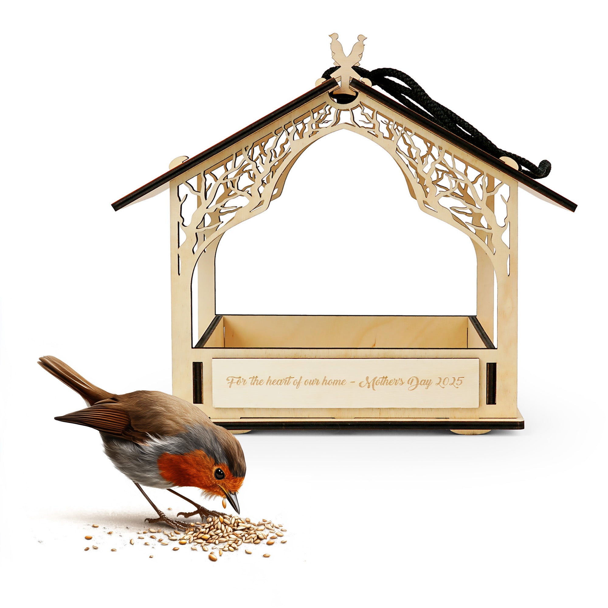 - Design: Open feeder style with an elegant tree motif and perched bird details