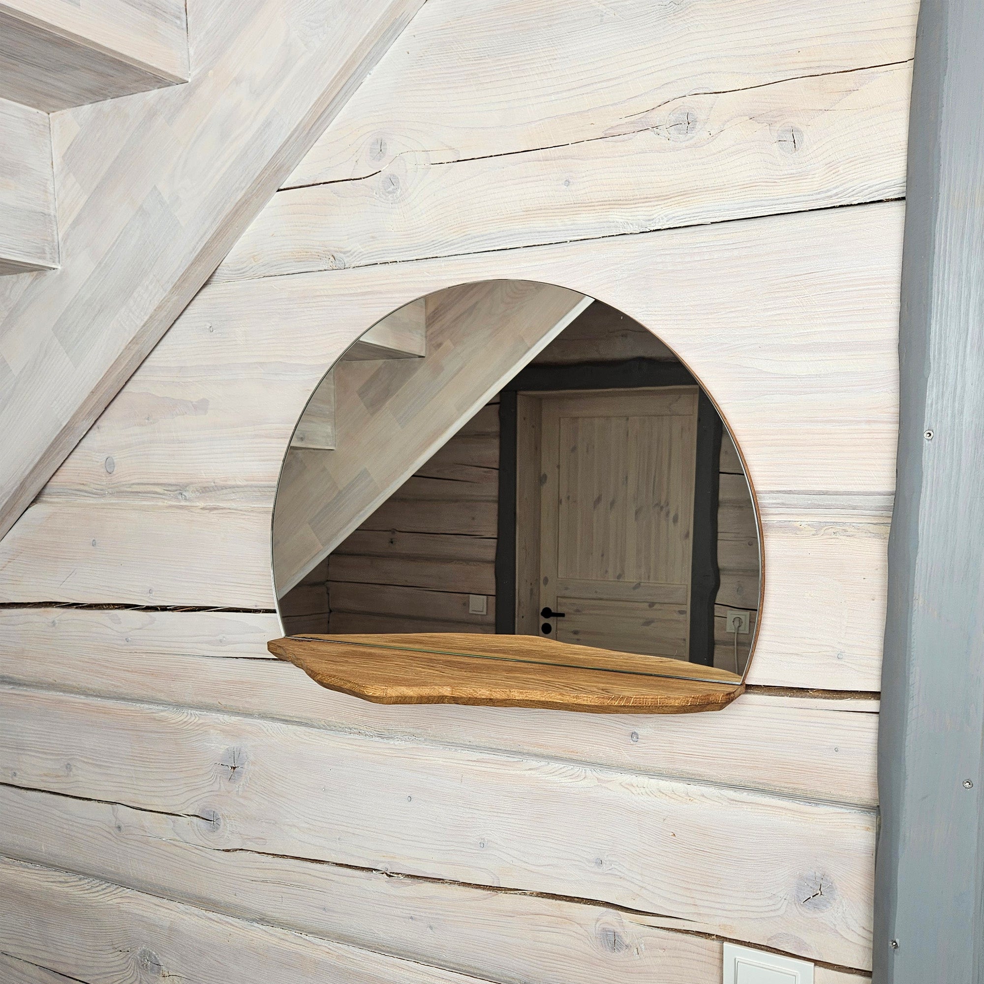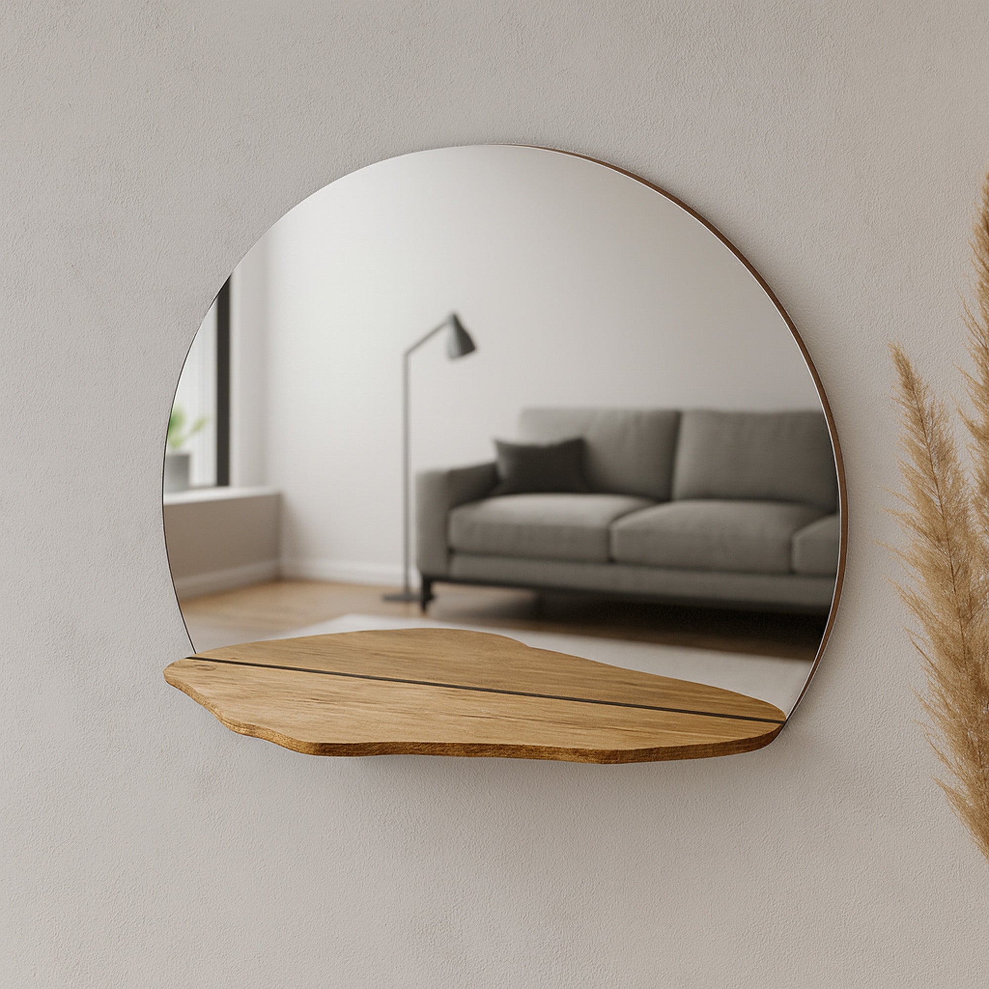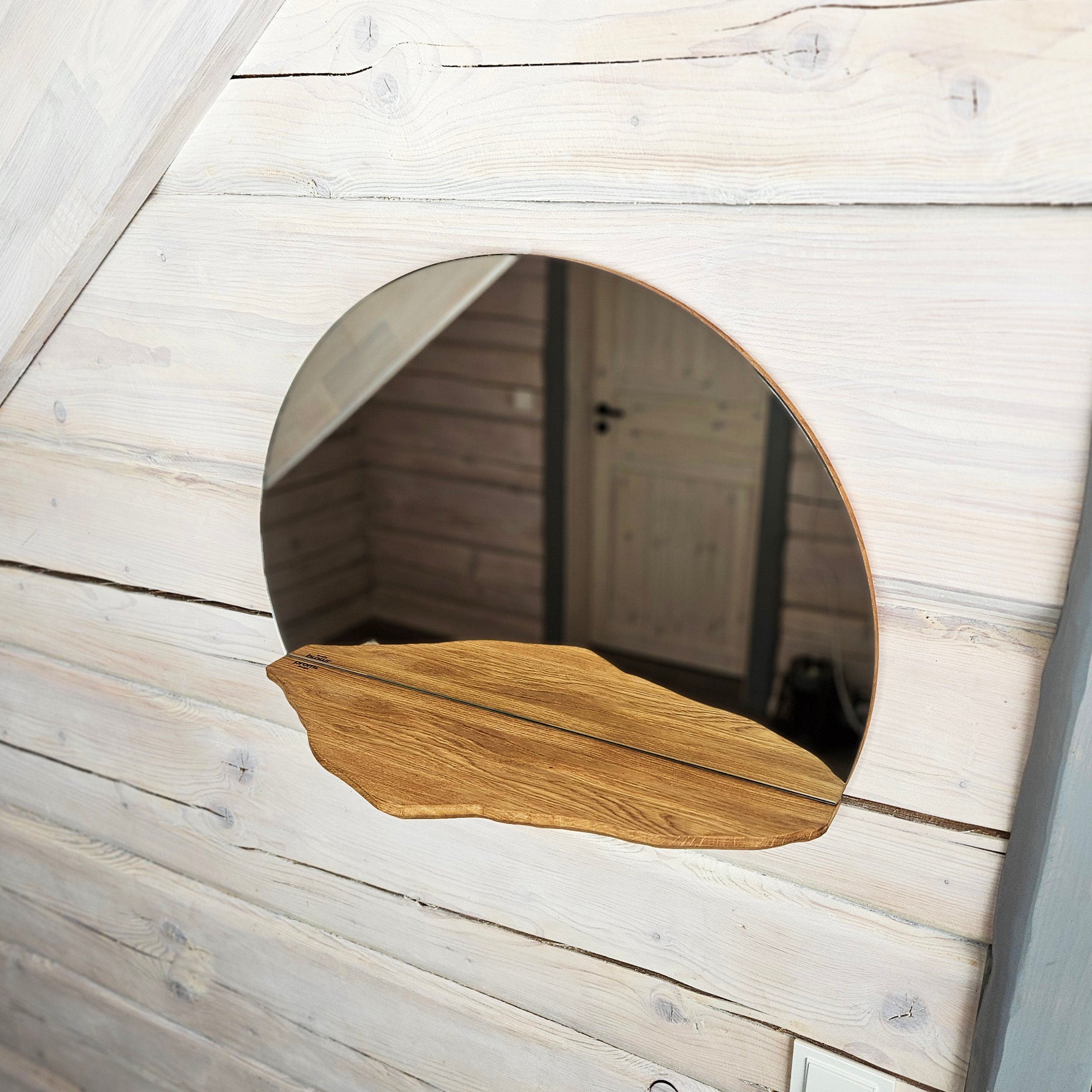 A wood wall mirror with shelf crafted from solid oak for a clean, timeless look. Ideal as an entryway mirror, bathroom mirror, or bedroom mirror, it adds both function and warmth to any space. Perfect for modern, Scandinavian, or minimalist decor, this handmade wall mirror makes a beautiful home gift or decor accent.