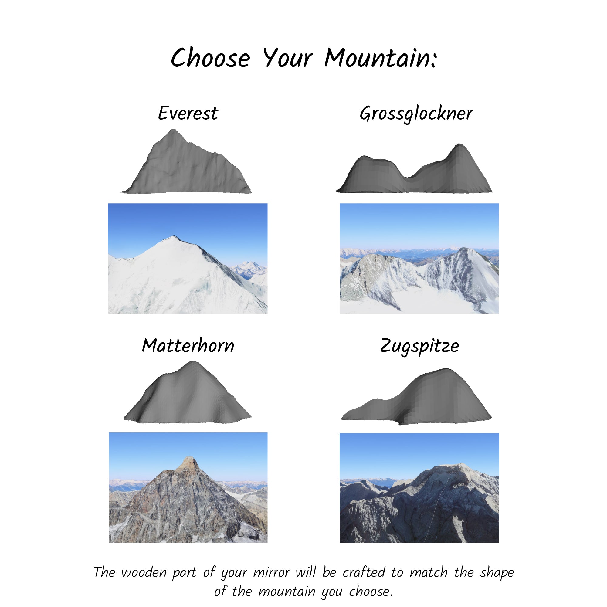 - Authentic Mountain Shape: Each mirror follows the real topography of an iconic peak for a truly unique look.