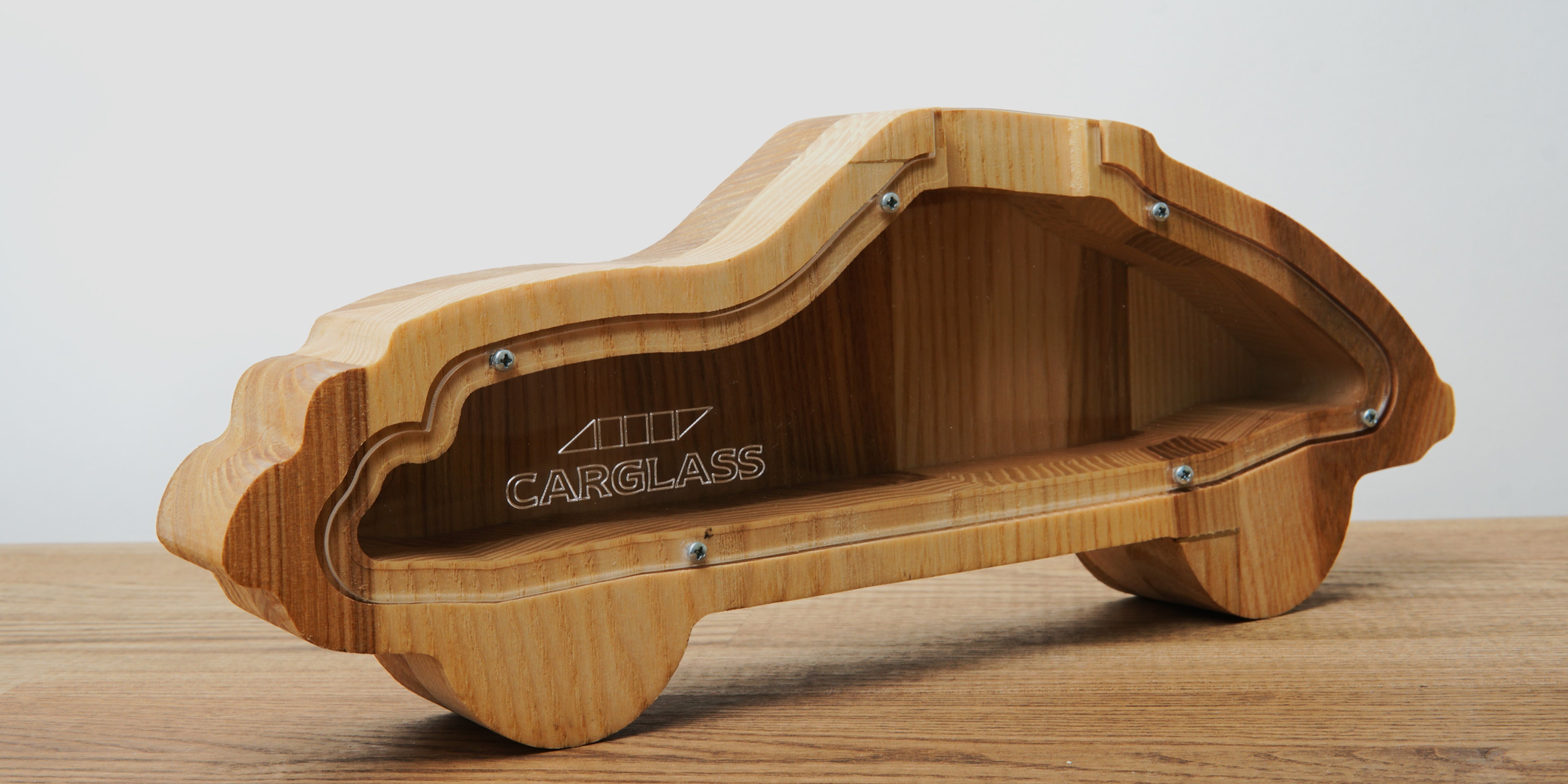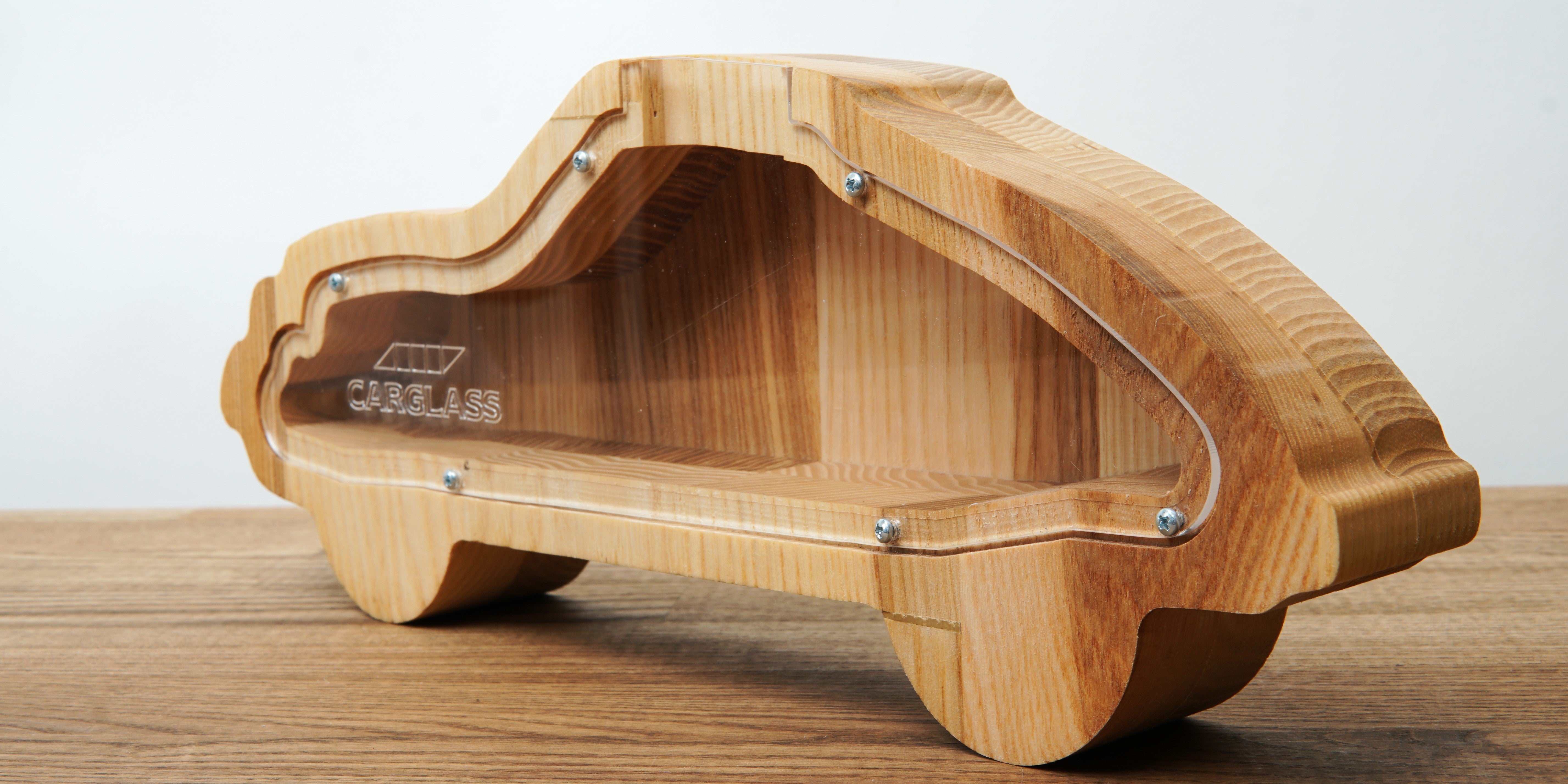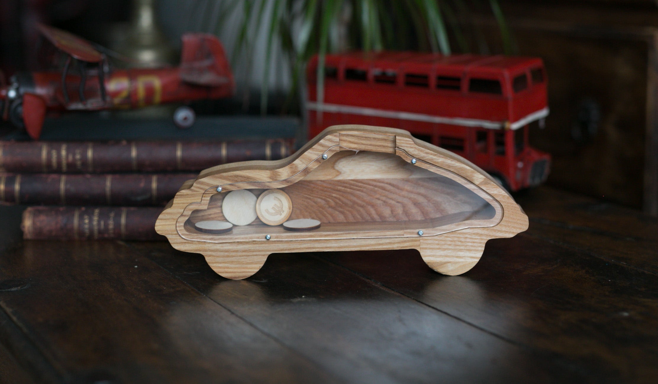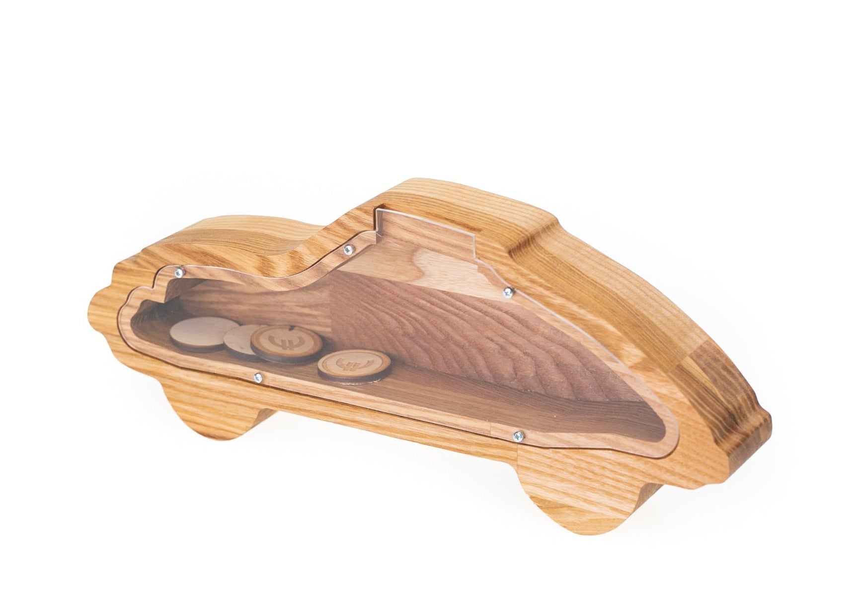 Wooden piggy bank made in a car shape. Crafted from solid wood with a simple, smooth finish. Suitable for storing coins and small bills. Can be used as a functional savings bank or as a decorative item for a shelf or desk.