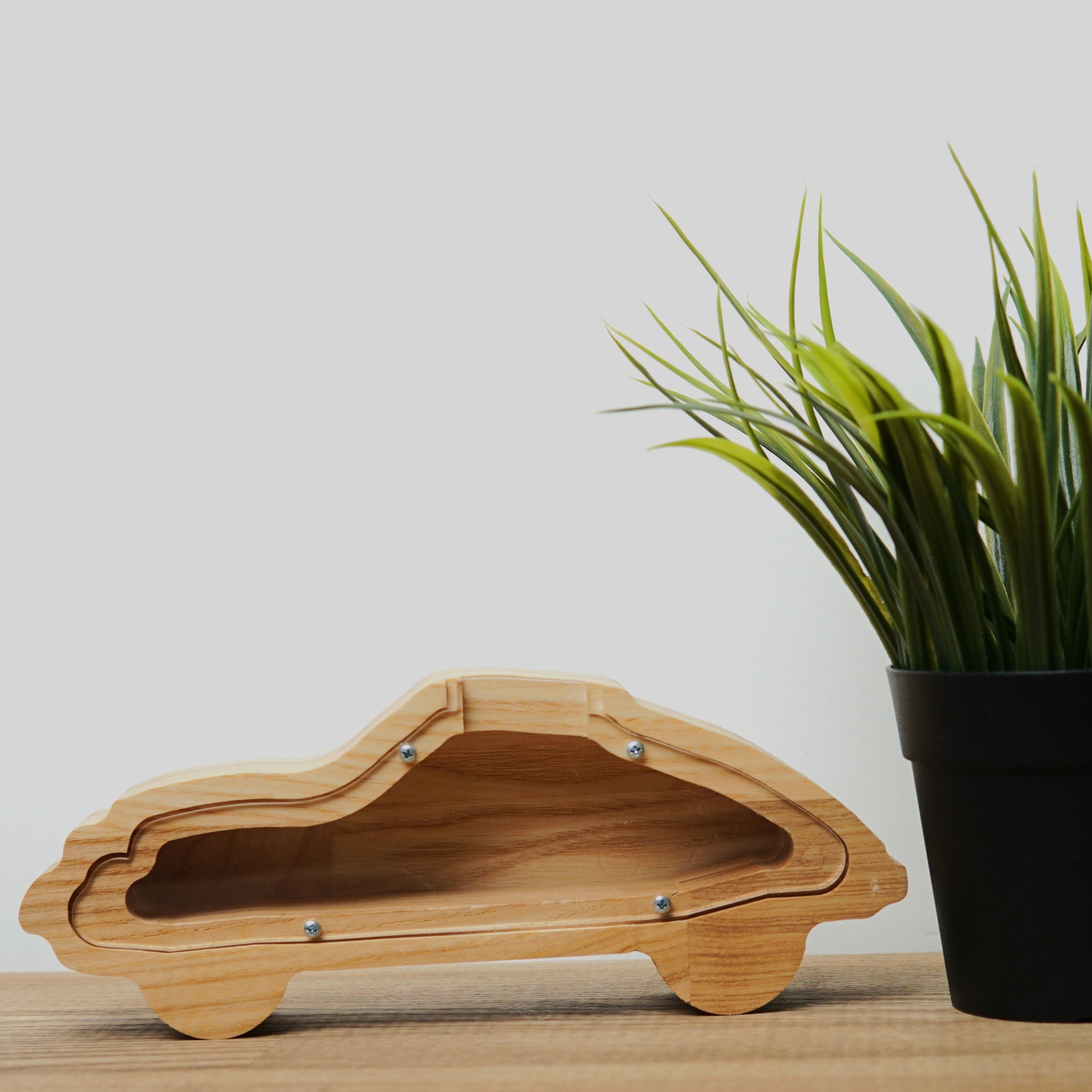 Wooden Car Piggy Bank, Handcrafted Coin Savings Box, Minimalist Nursery Decor, Gift for Kids
