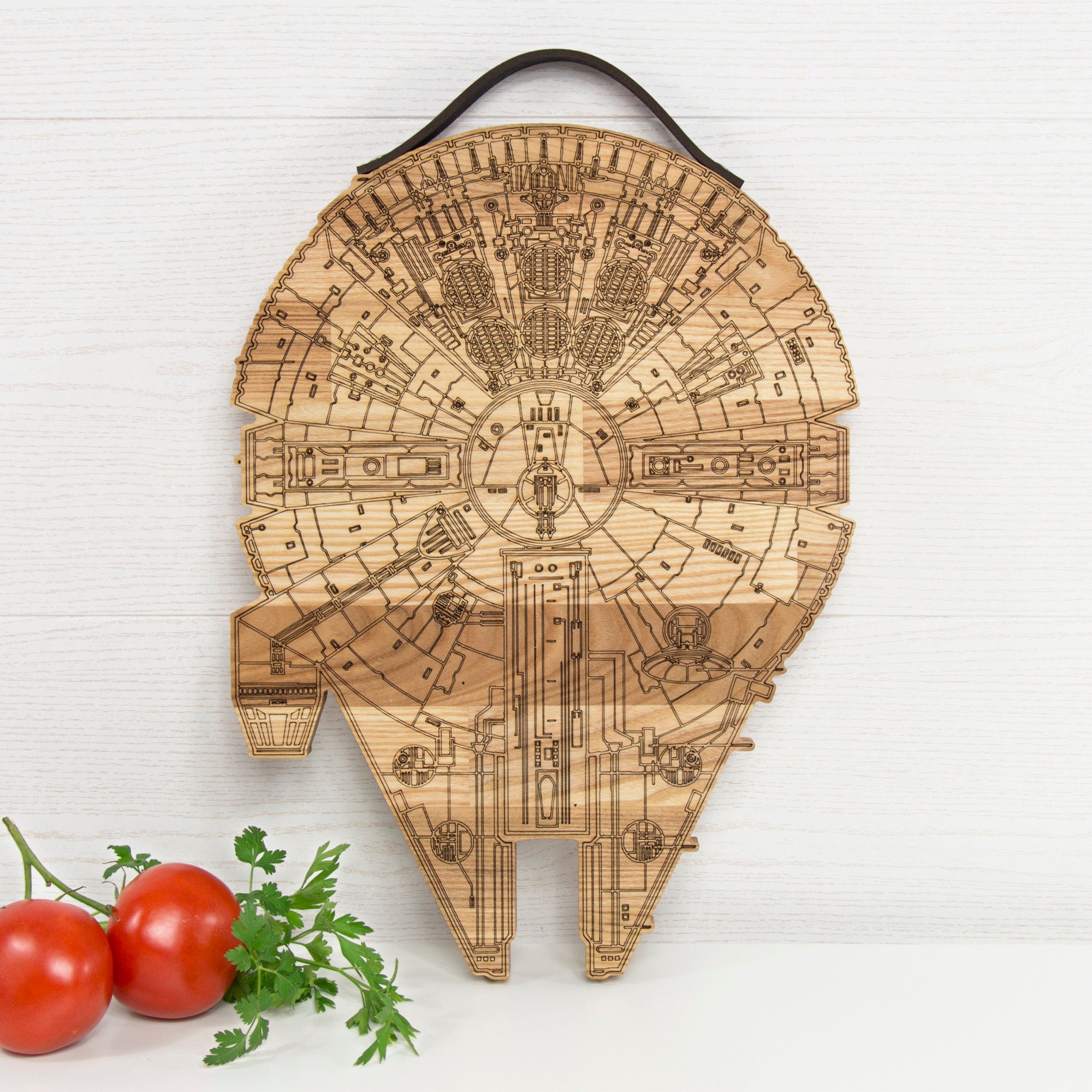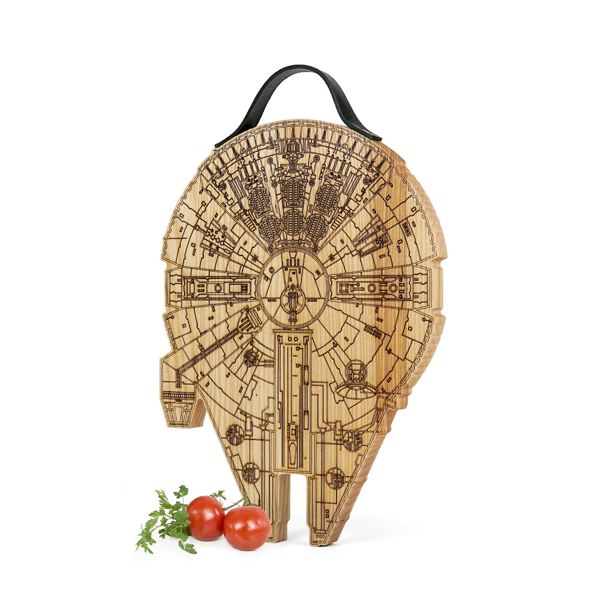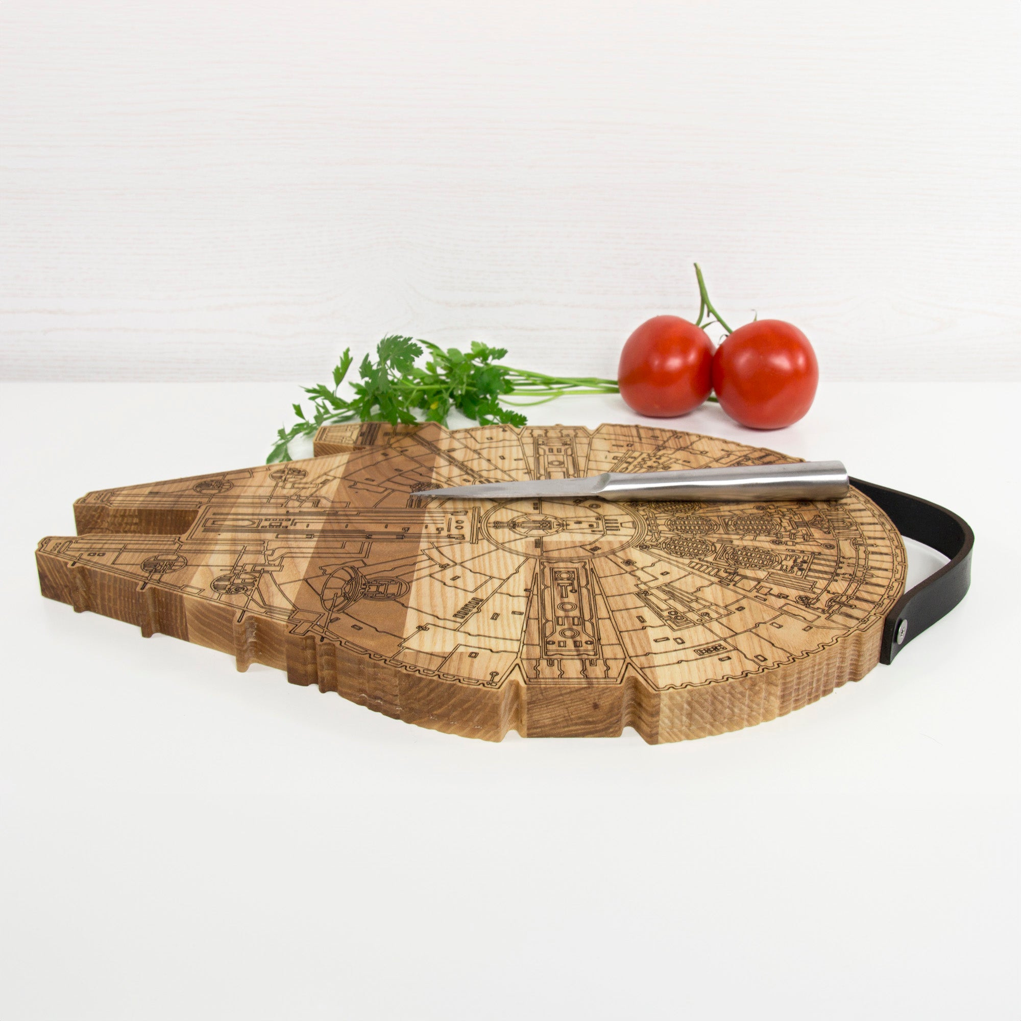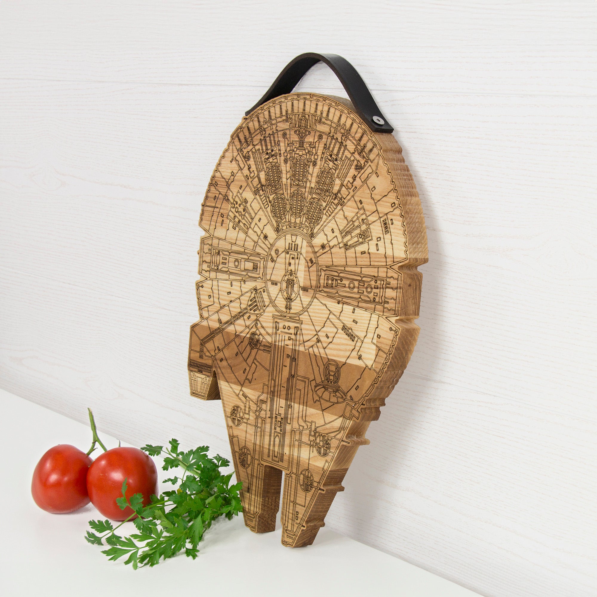 Millennium Falcon cutting board with a rustic engraved design, perfect for Star Wars fans and cooking enthusiasts. Made from solid wood with a natural leather handle secured by screws, it is functional for chopping while adding a unique touch to your kitchen. Ideal as a gift for housewarmings, weddings, Christmas, Father’s Day, or for anyone who loves distinctive kitchen accessories.
