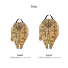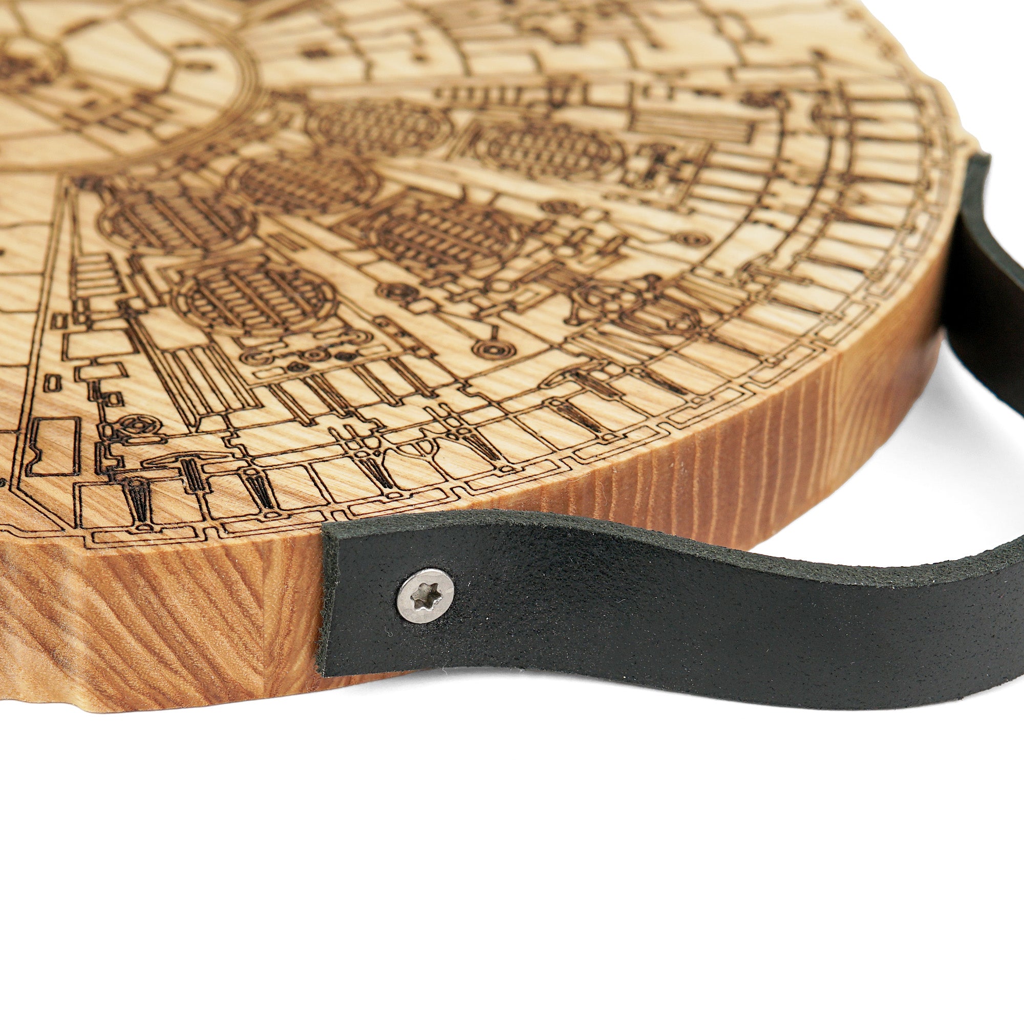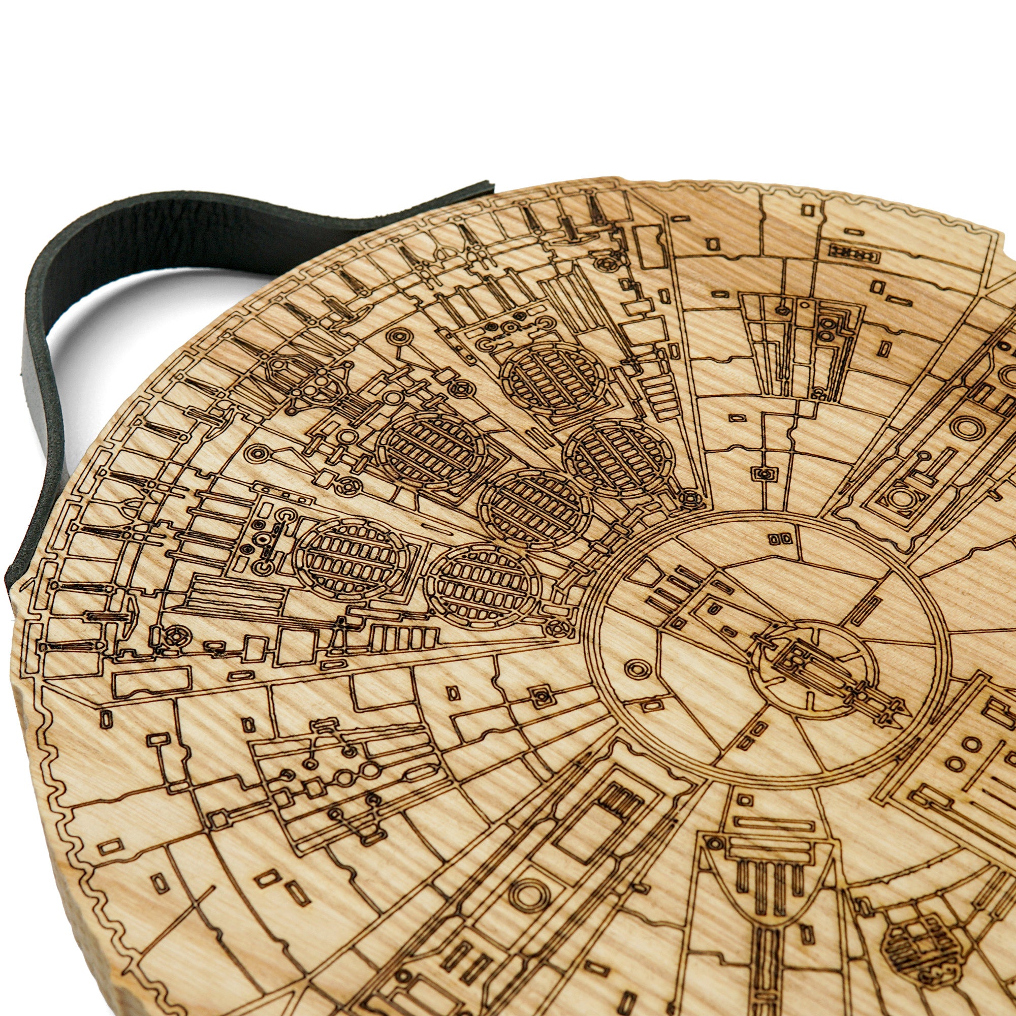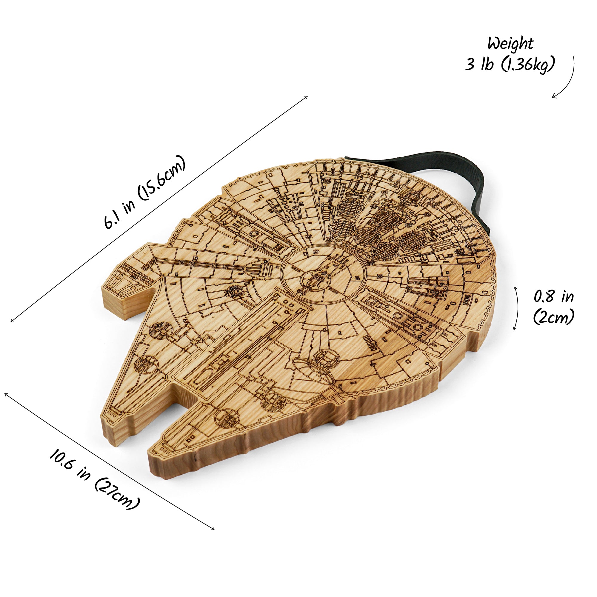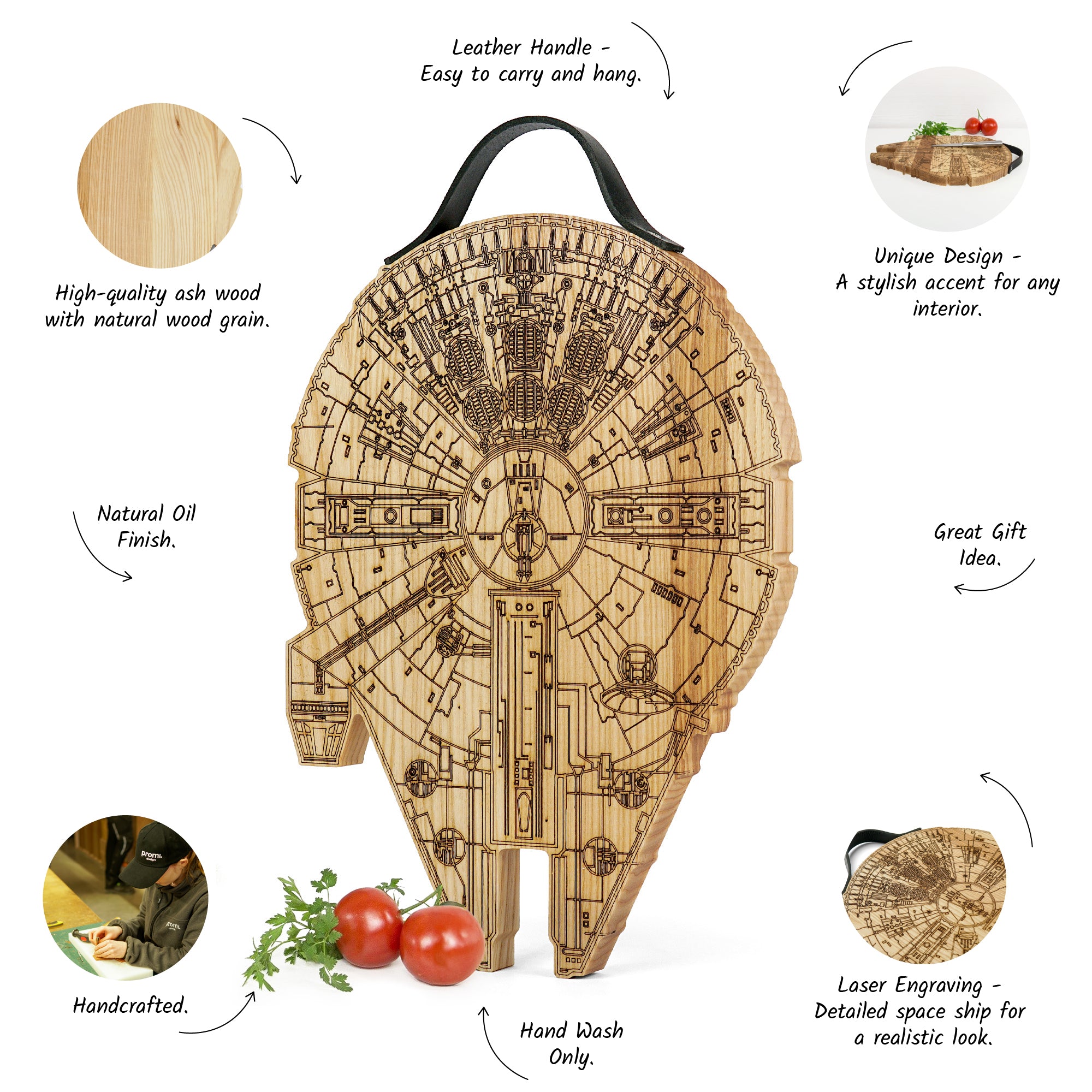 Millennium Falcon cutting board with a rustic engraved design, perfect for Star Wars fans and cooking enthusiasts. Made from solid wood with a natural leather handle secured by screws, it is functional for chopping while adding a unique touch to your kitchen. Ideal as a gift for housewarmings, weddings, Christmas, Father’s Day, or for anyone who loves distinctive kitchen accessories.