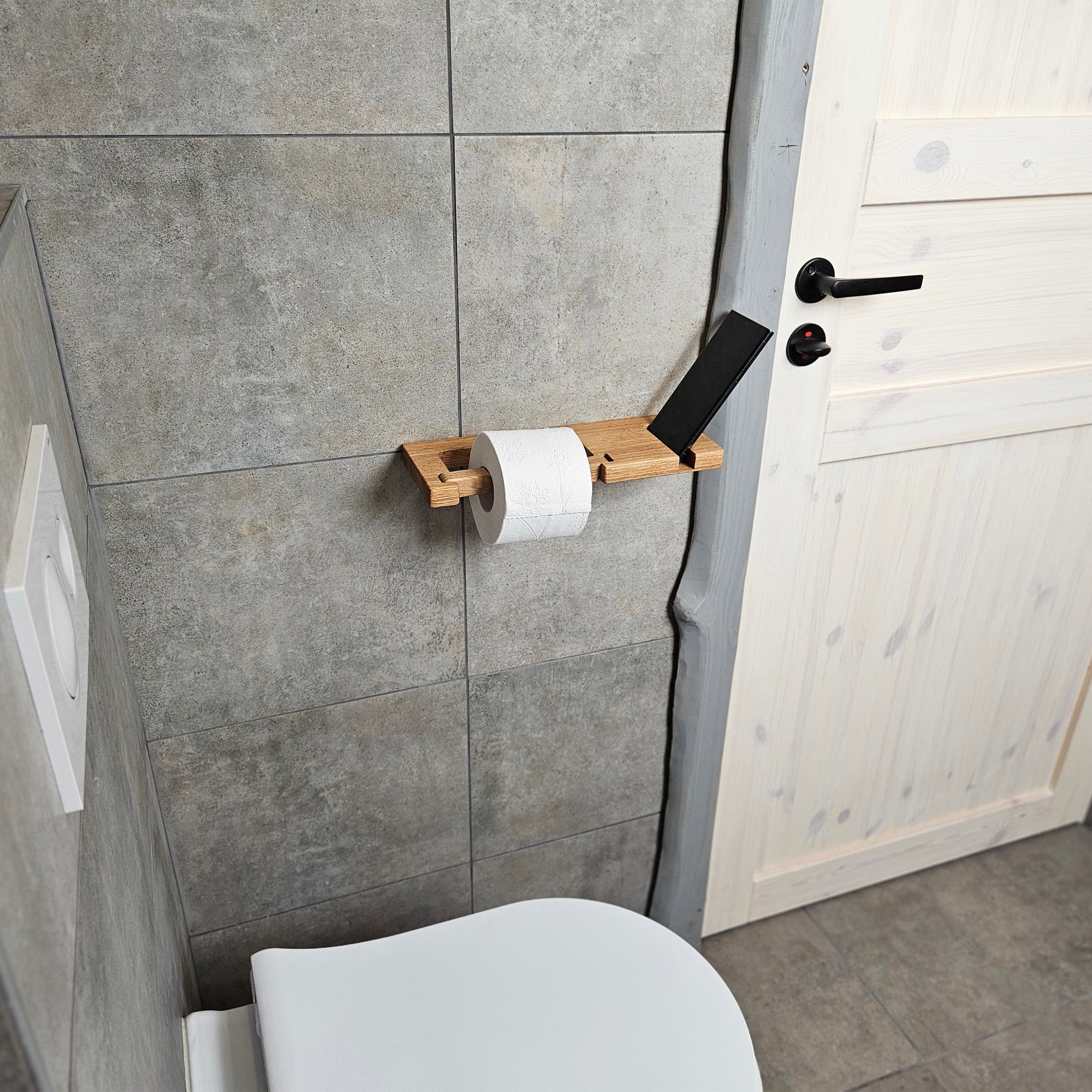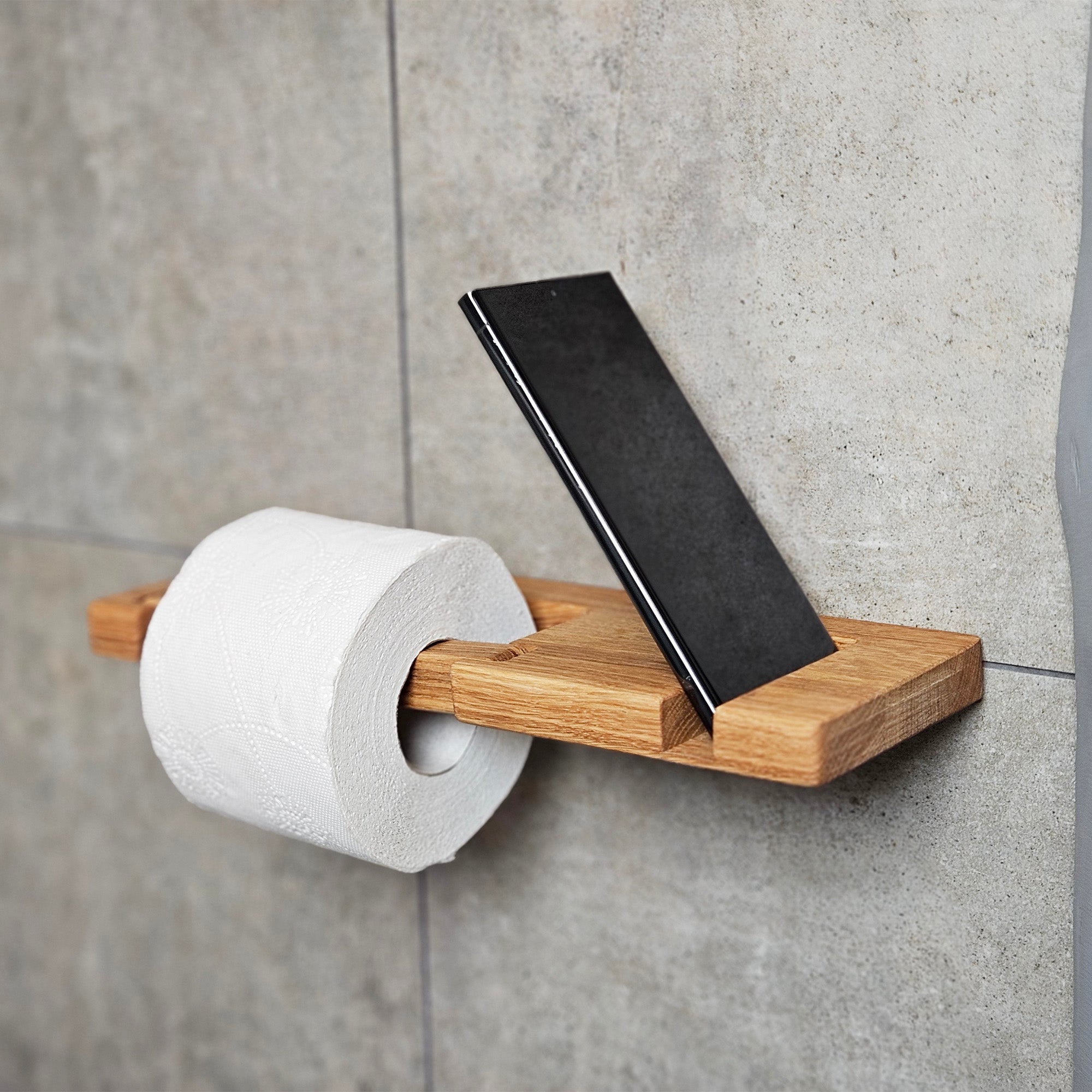 Wood Toilet Paper Holder with Phone Shelf, Wall Mounted Oak Roll Holder for Bathroom, Minimalist Toilet Paper Storage