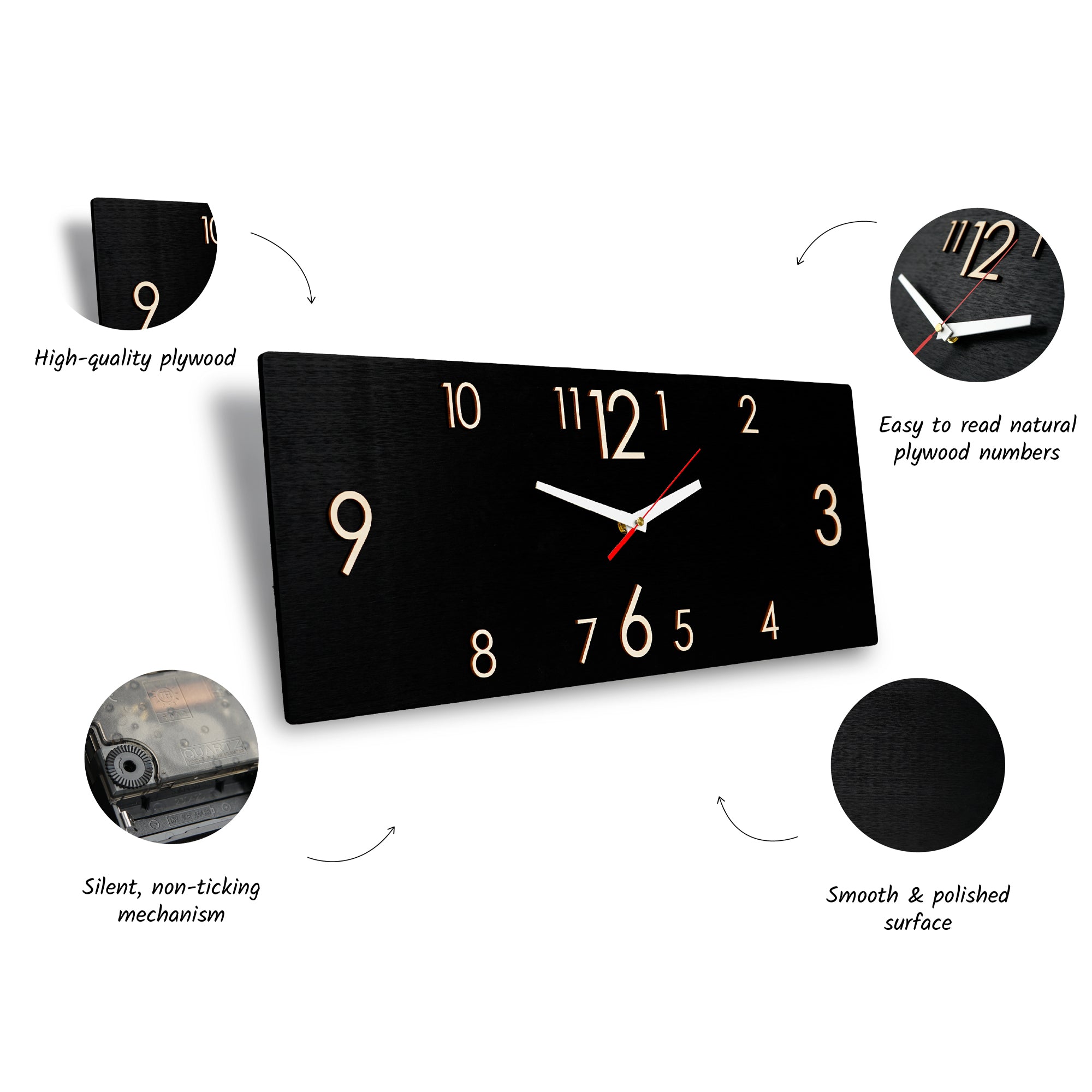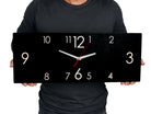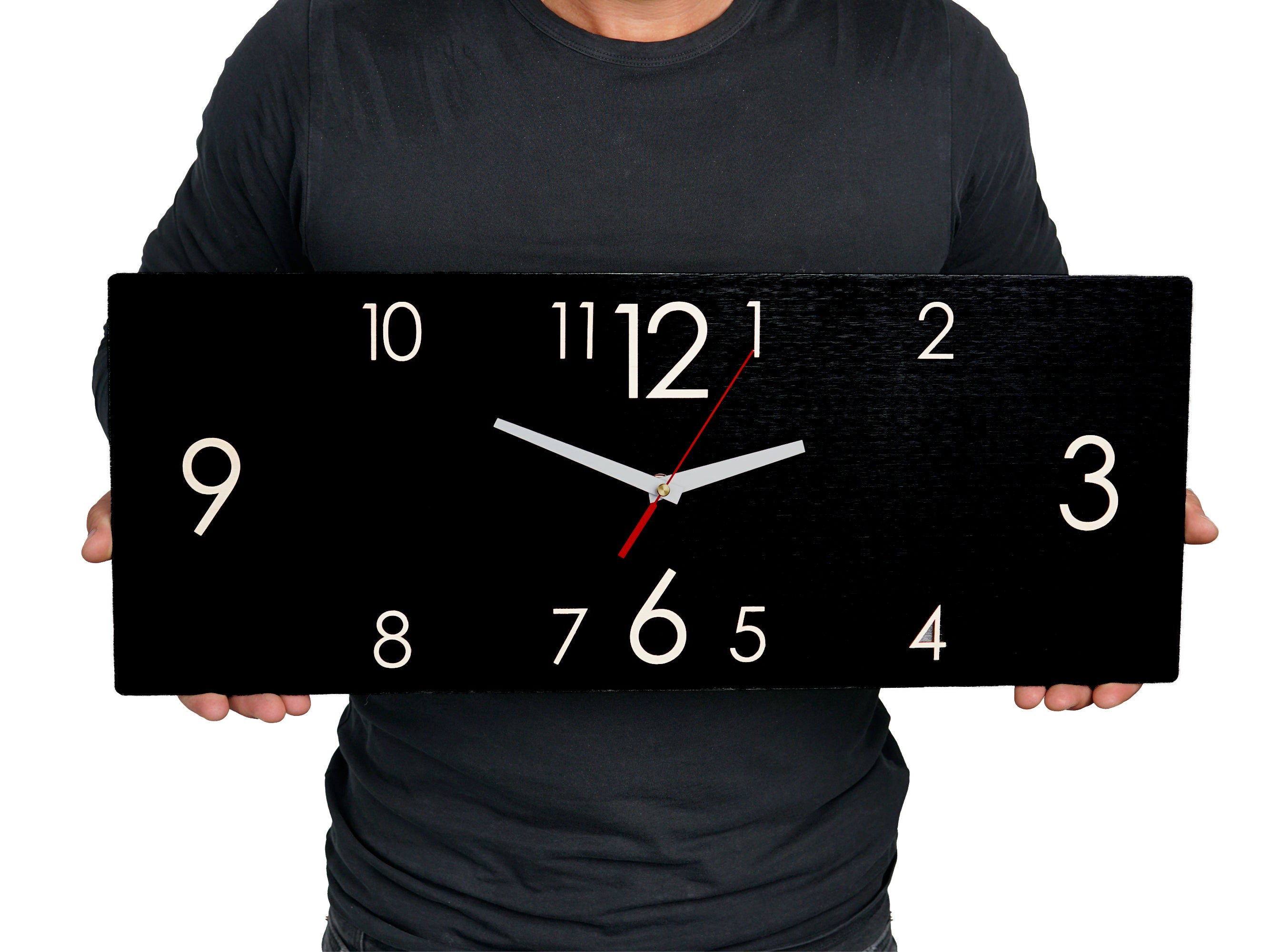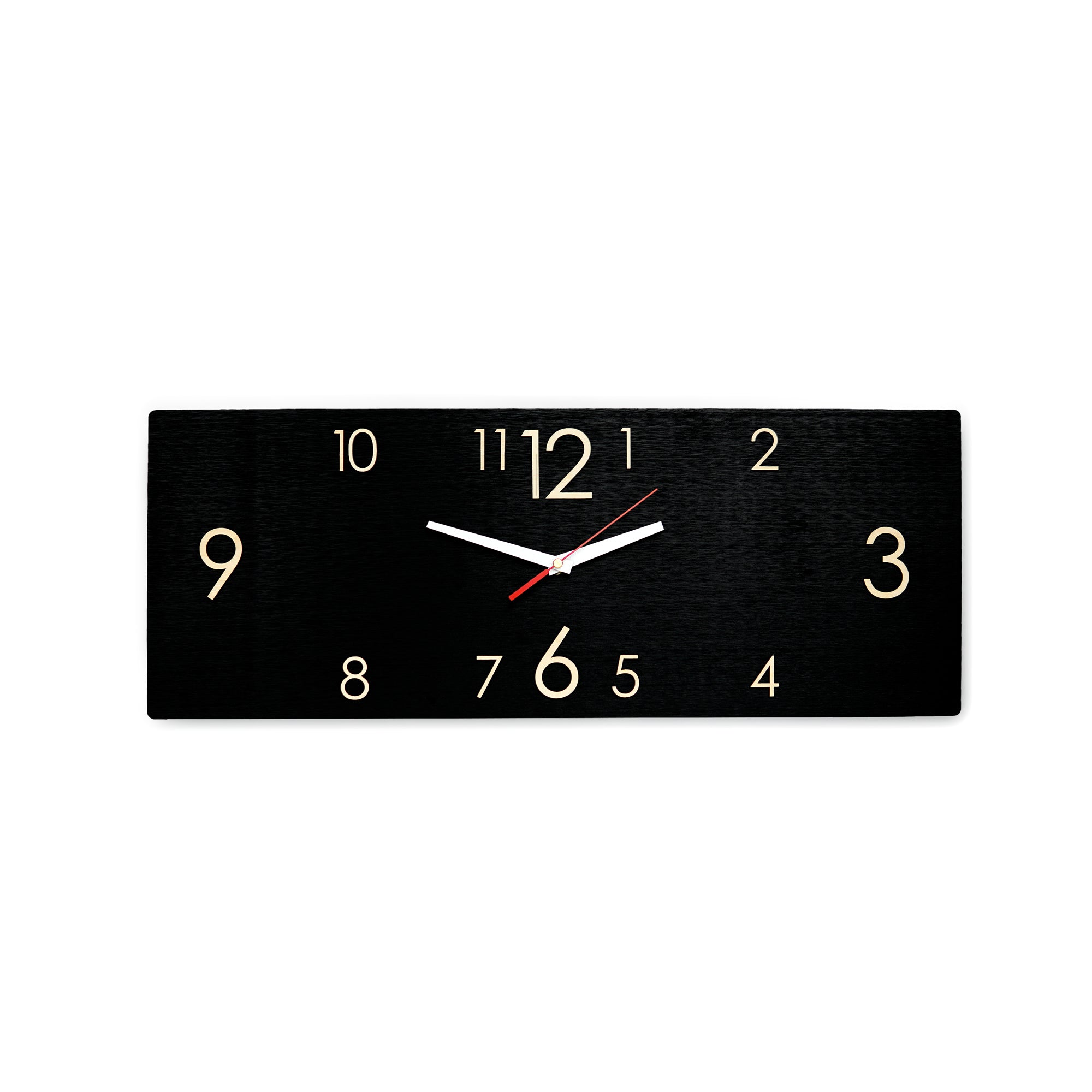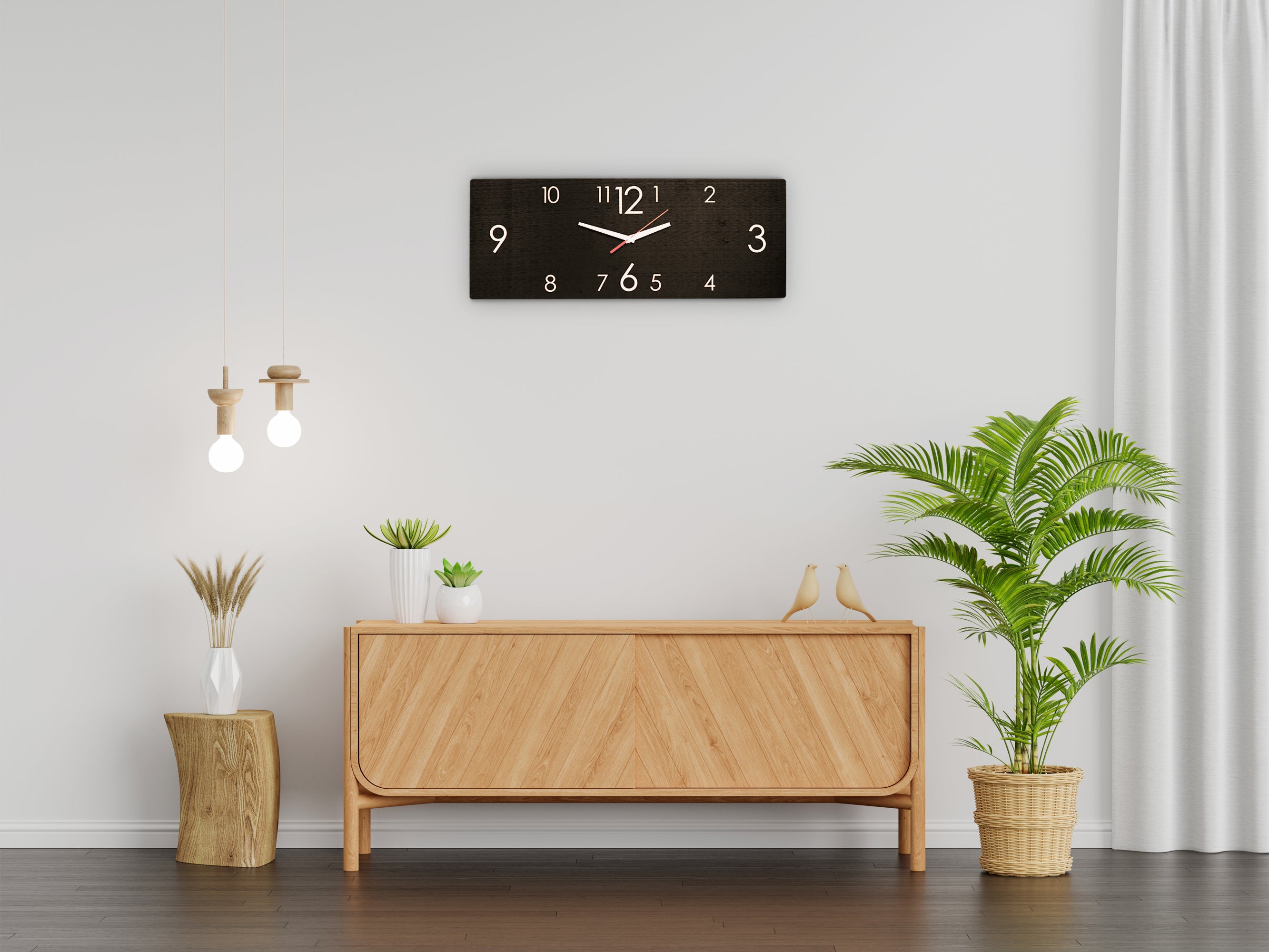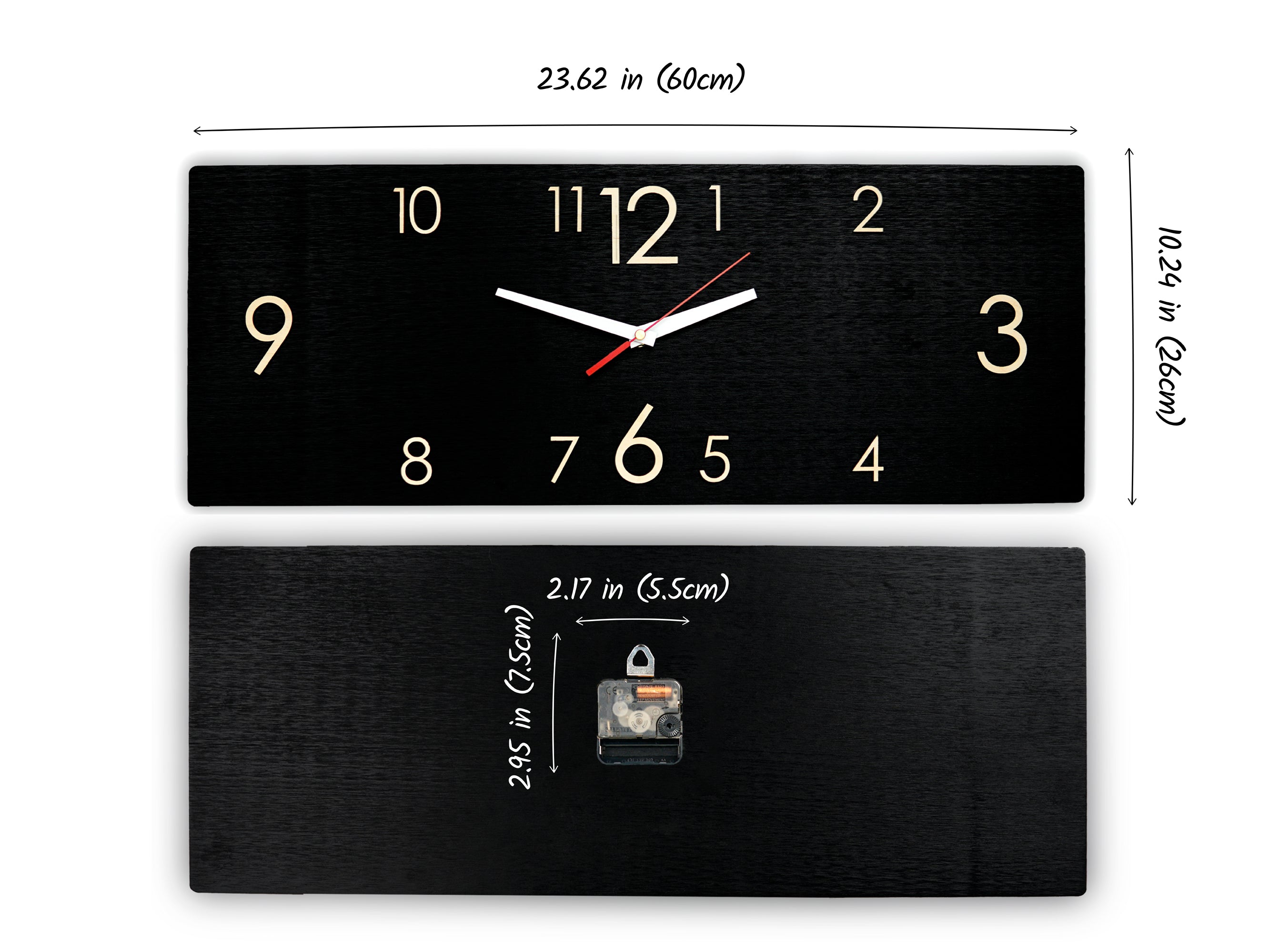 Measuring a generous 60x26 centimeters, this clock demands attention with its impressive size. It becomes not only a practical timekeeping tool but also a captivating piece of wall art. The black clock face provides a bold backdrop that enhances the visual impact.