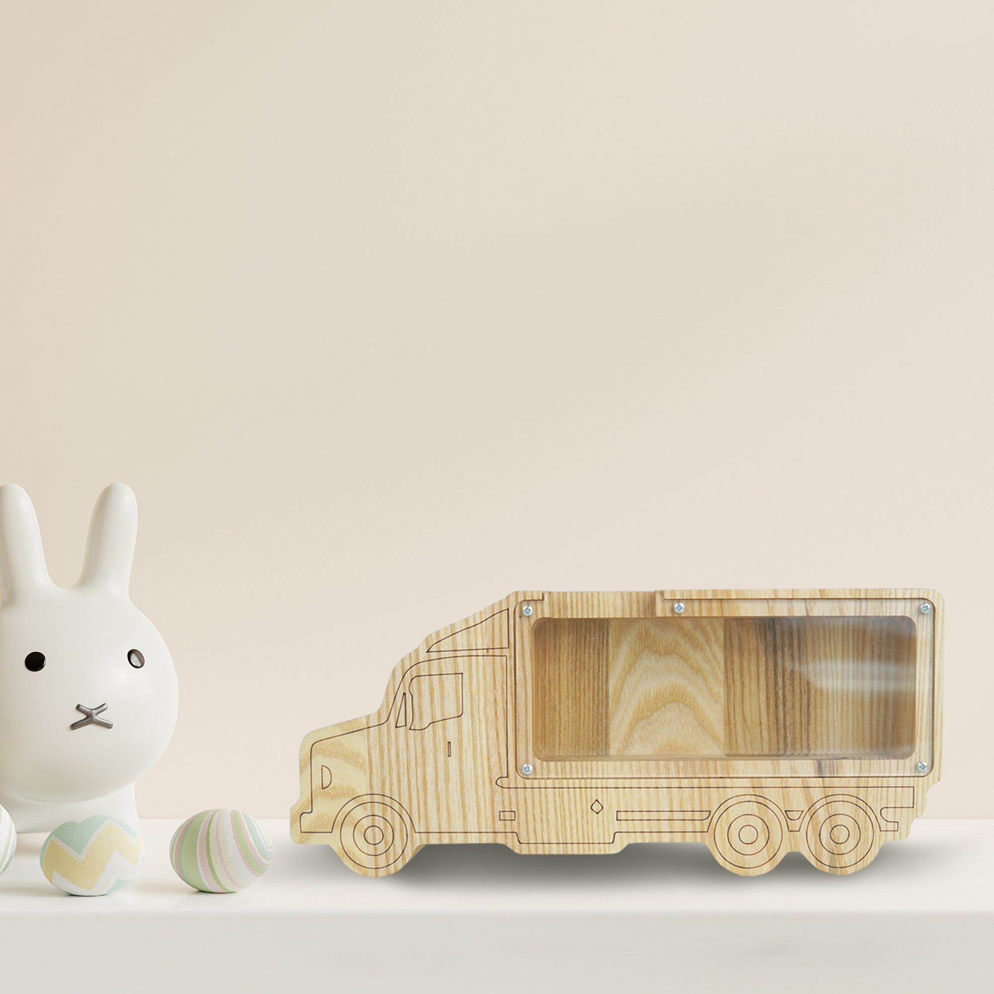 Truck-shaped wooden coin bank made from solid ash wood with a clear, screw-on plexiglass front for easy access to savings. Safe and sturdy, it’s a fun way for kids or adults to save money. A great gift for birthdays, truck enthusiasts, or anyone who appreciates unique wooden décor.