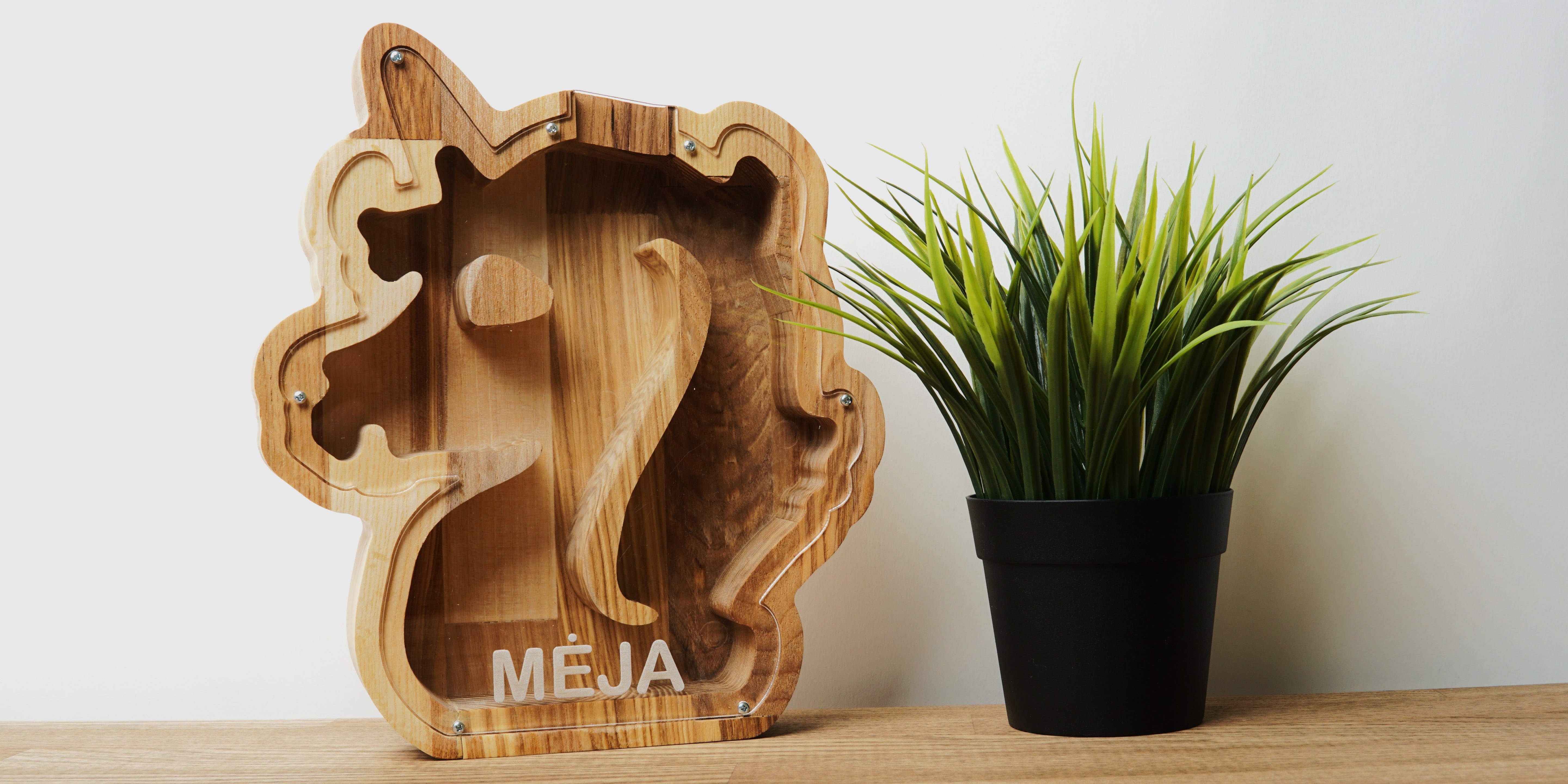Beautiful Unicorn shaped piggy bank, made from natural wood and glass. Your kid will absolutely love this new addition to their room, which will have both practical uses and work as a room decoration too. We can engrave your kid's name on the glass to make it a memorable and unique gift.