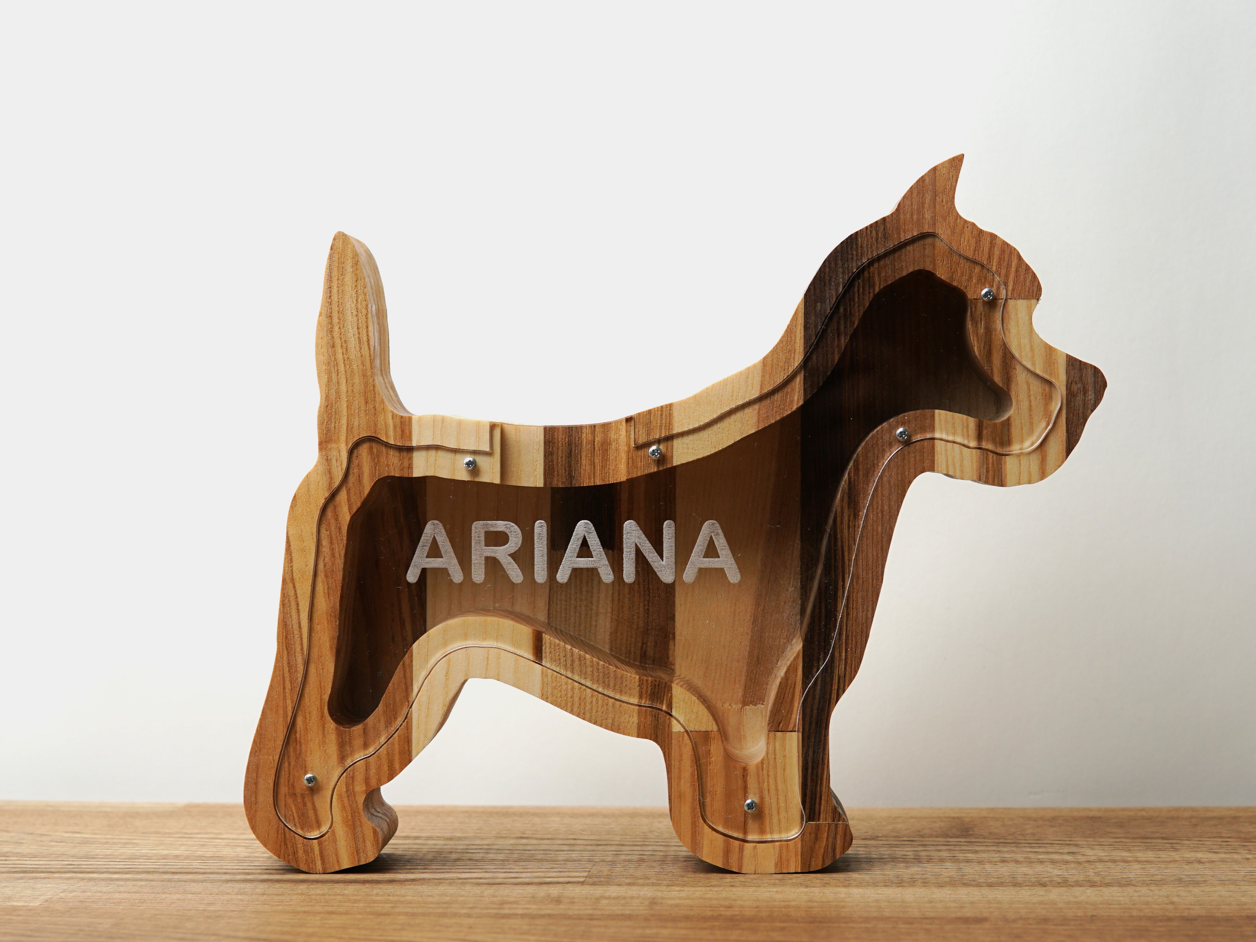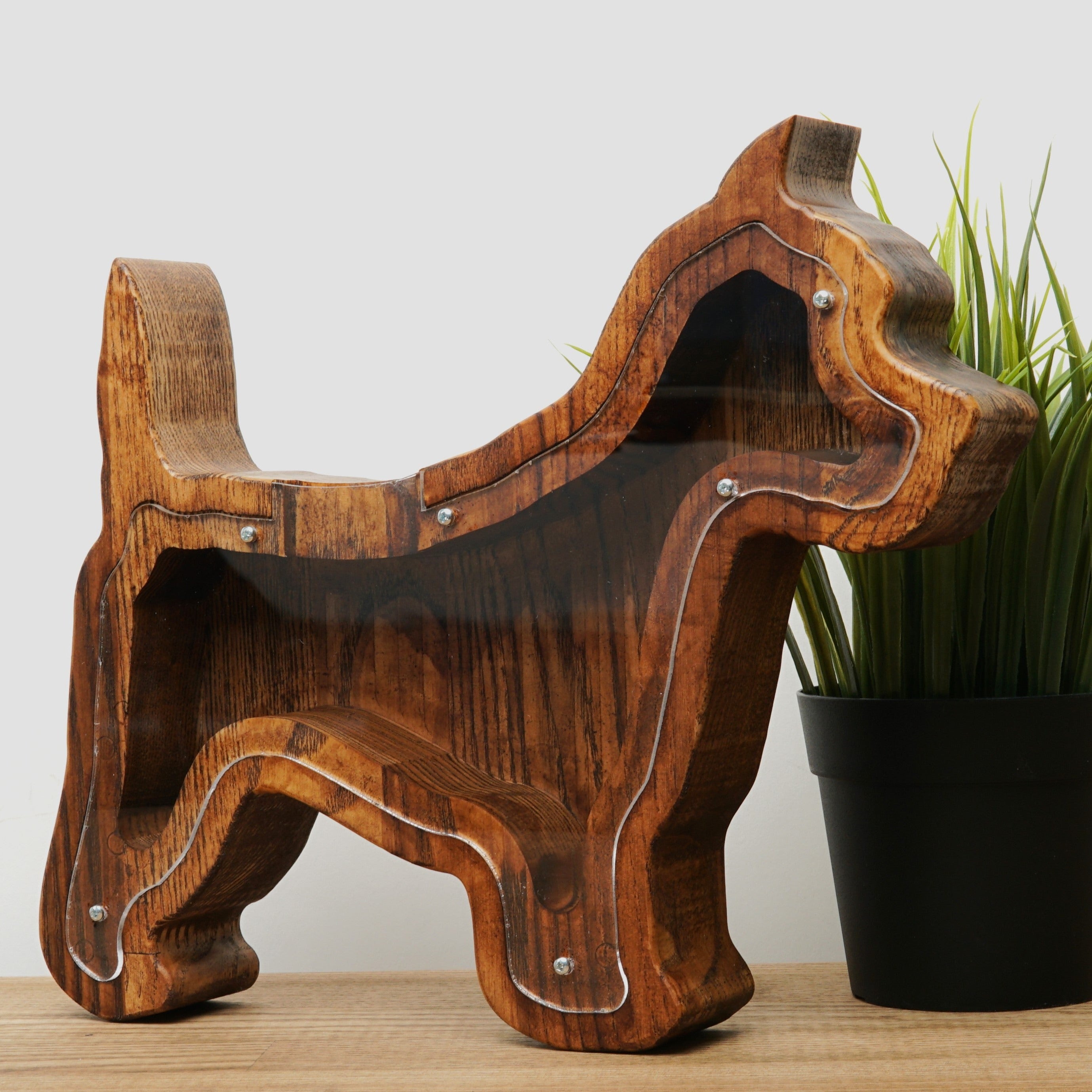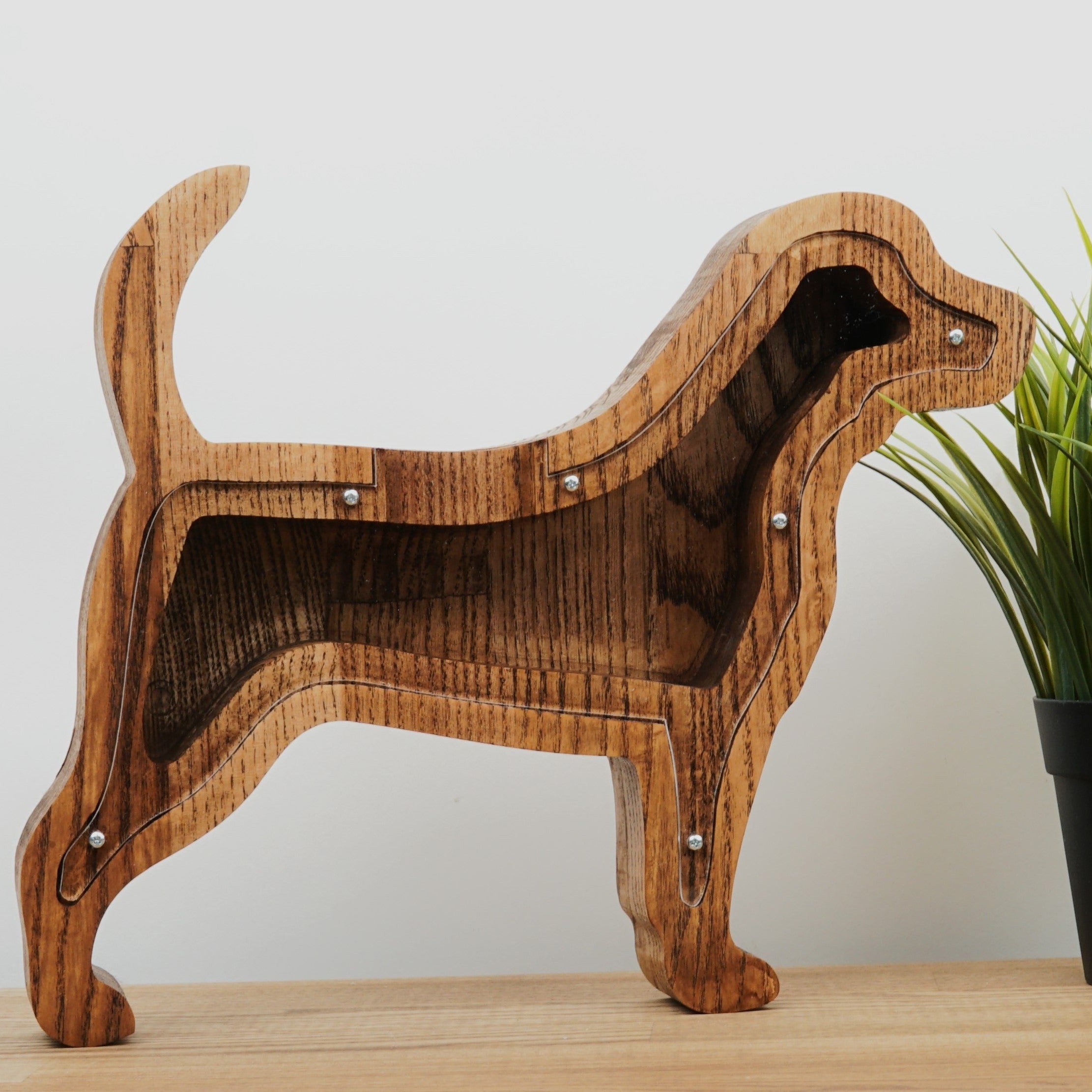 Wooden Piggy Bank Dog (Brown, Engraving)