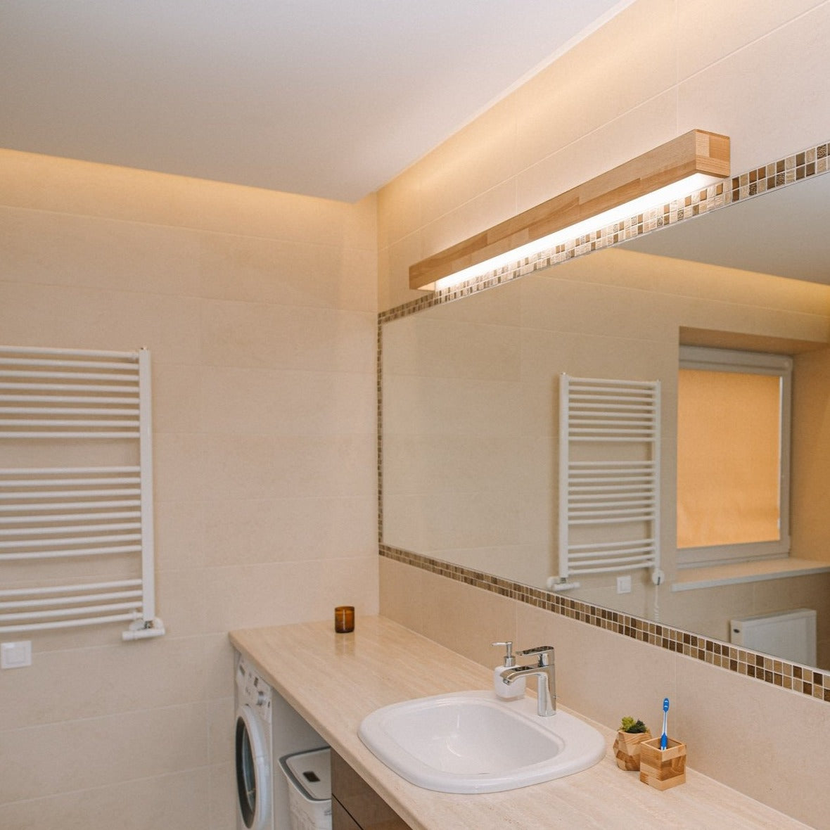 This beautiful and modern style wall light will be a perfect addition to your bathroom or any room in the house. It was designed for the minimalistic interior, however, it might become a real stand-out point to any space. This lamp is a large size, handmade from natural wood.
