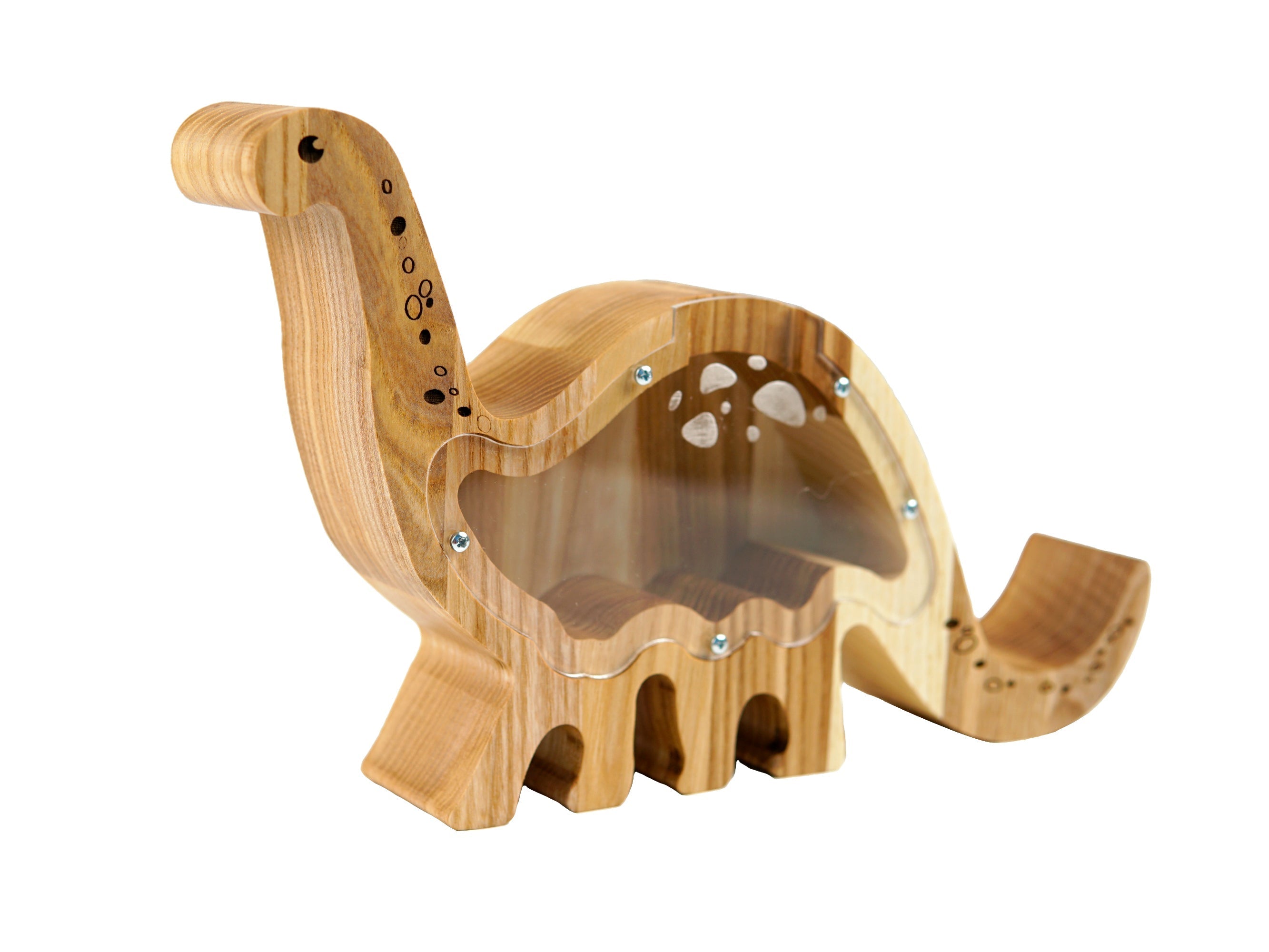 Wooden piggy bank in the shape of a dinosaur. People love dinosaurs, their stories, movies about dinosaurs, and dinosaur toys, so why not have a dinosaur that holds your coins, so you could buy even more dinosaurs? Sounds like a fair deal to us. We offer the dinosaur piggy bank in sizes and colors to pick the one that you think will suit you the best. The piggy bank is made of a natural and FSC-certified Ashwood block, polished, painted with your selected color, and later covered with protective oil and a transparent protective lacquer. The glass or the wooden back of the piggy bank can be personalized and laser engraved with your custom name, text, or words - see the personalization tab for more. This piggy bank can be a perfect gift for a child boy or girl, or a baby for baptism, a birthday gift, first communion, Christmas, New Year, Easter,