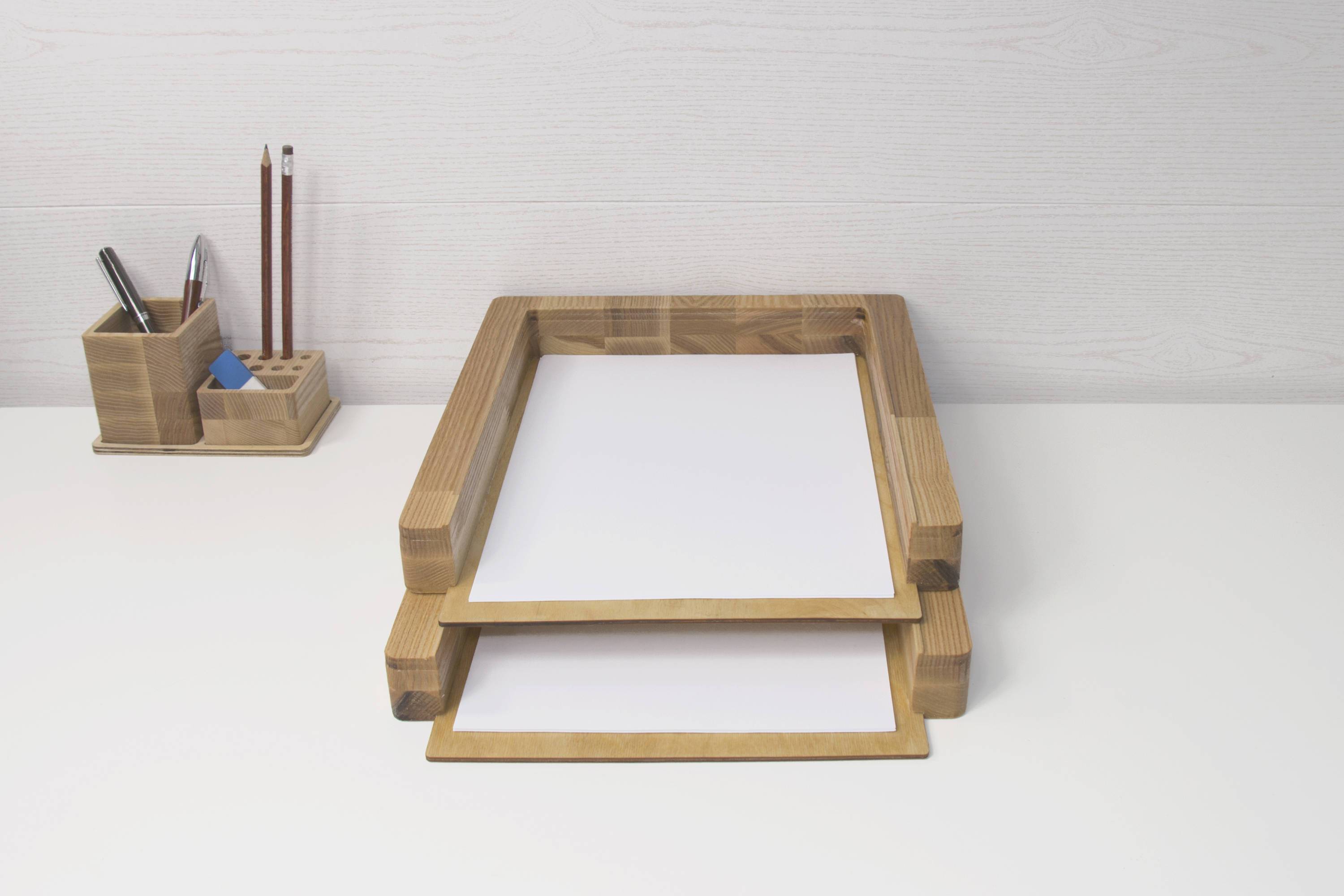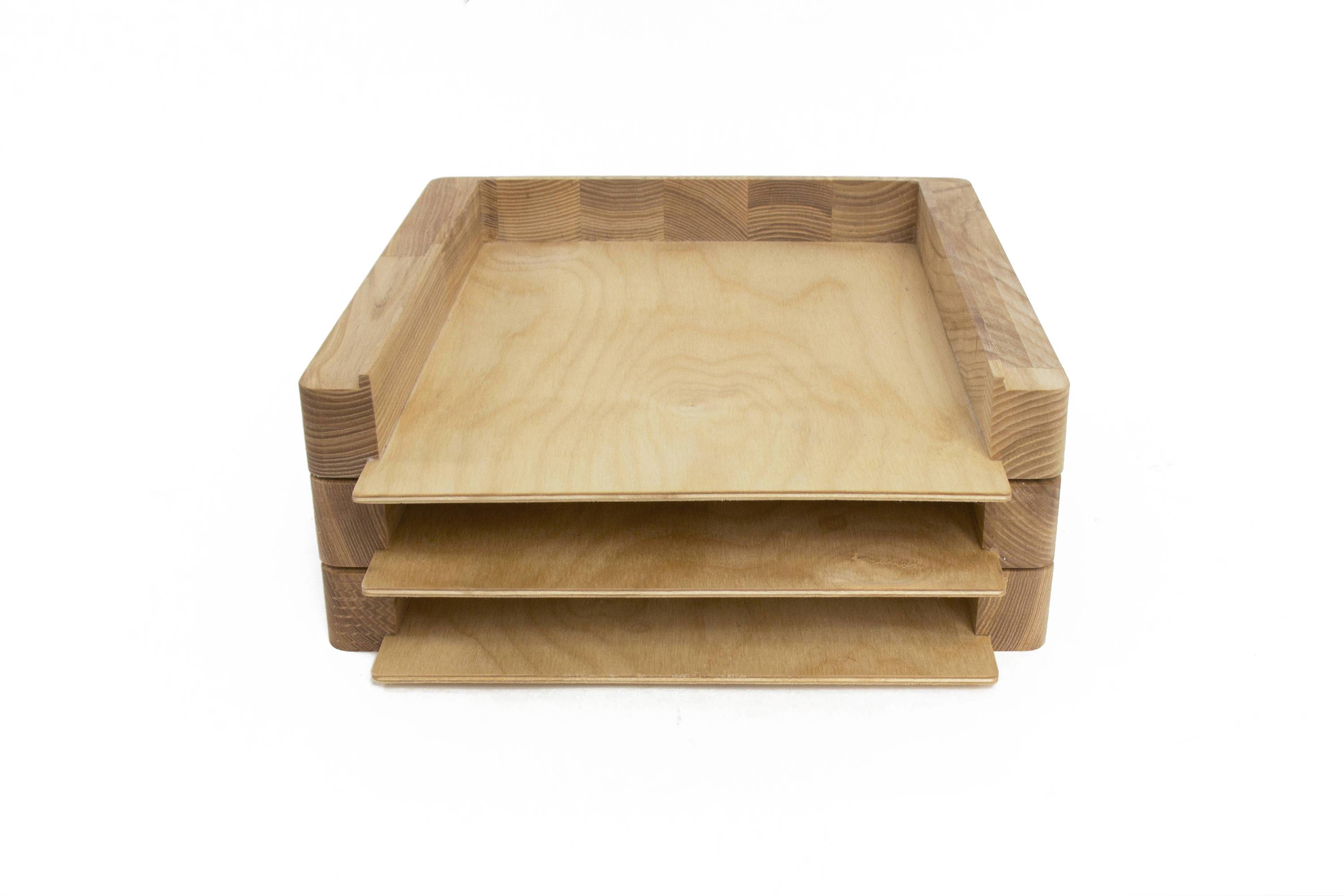 This well-made, solid paper tray with 3 folders will help your desk look stylish and well-organized.  All your papers, documents, etc. will be perfectly stacked in the right order. Besides, this paper tray looks really beautiful. The frame is made from solid ash tree wood and birch plywood s sheet serves as the "floor" of the tray.
