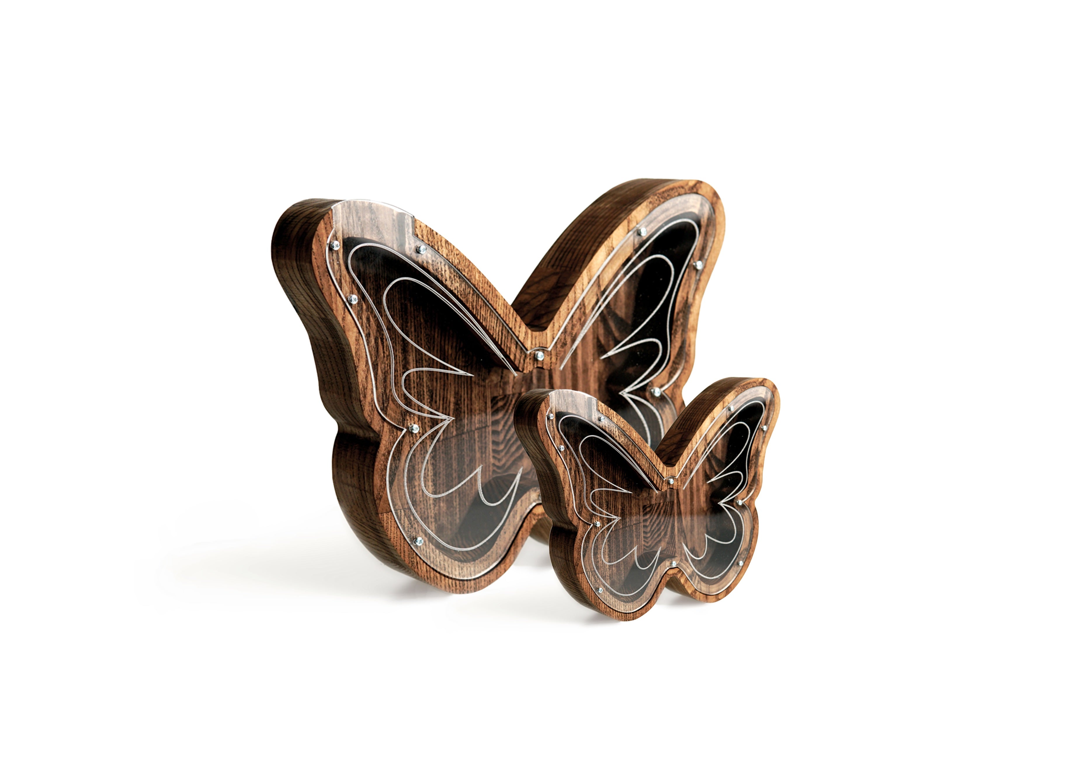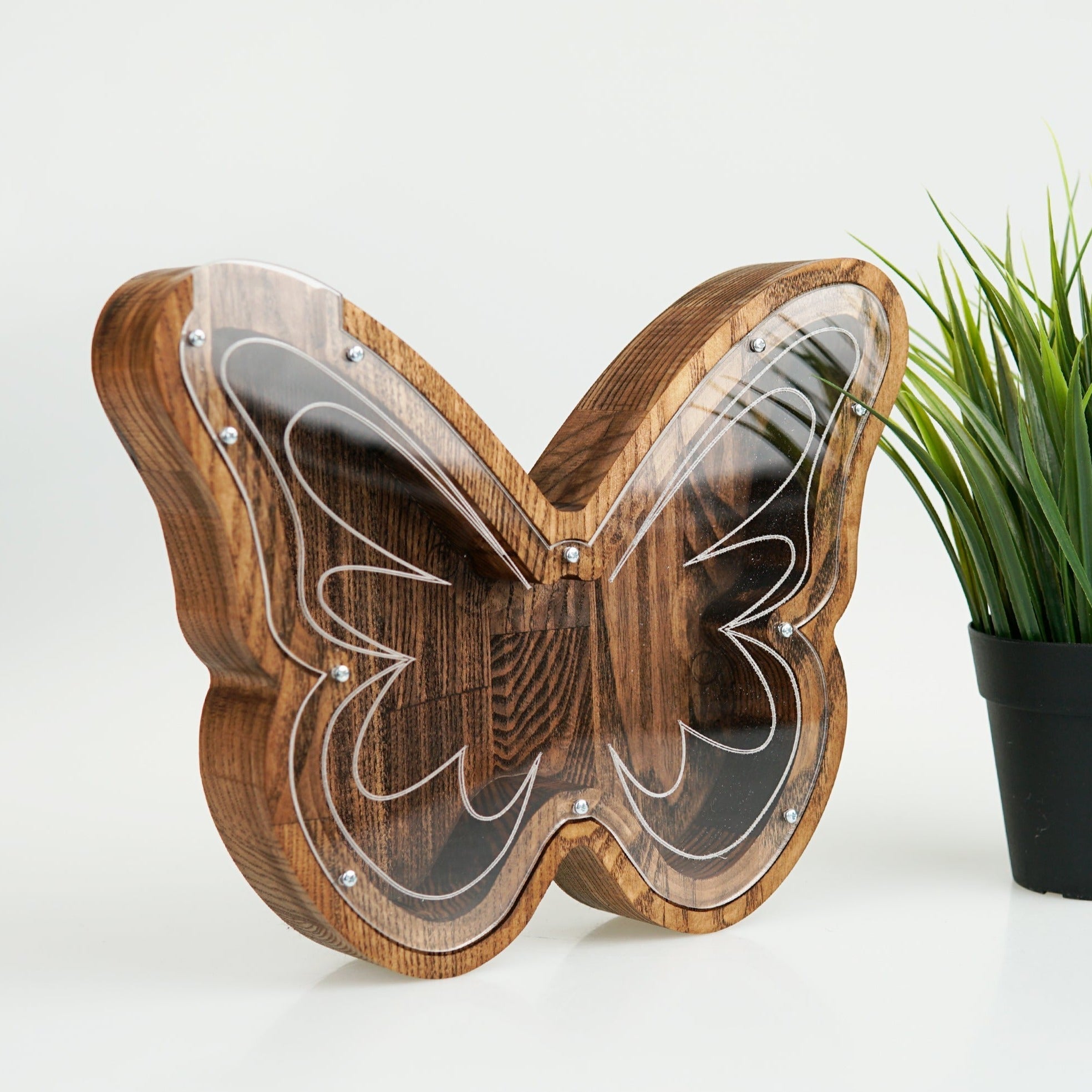 Wooden piggy bank in the shape of a butterfly. Perfect as a gift or home decoration for many occasions, as a birthday or christening gift for a child. The piggy bank is made of solid ash with plexiglass attached to the front. Coins and bills can be dropped through the hole at the top. To withdraw the savings, you can do this by unscrewing the glass.