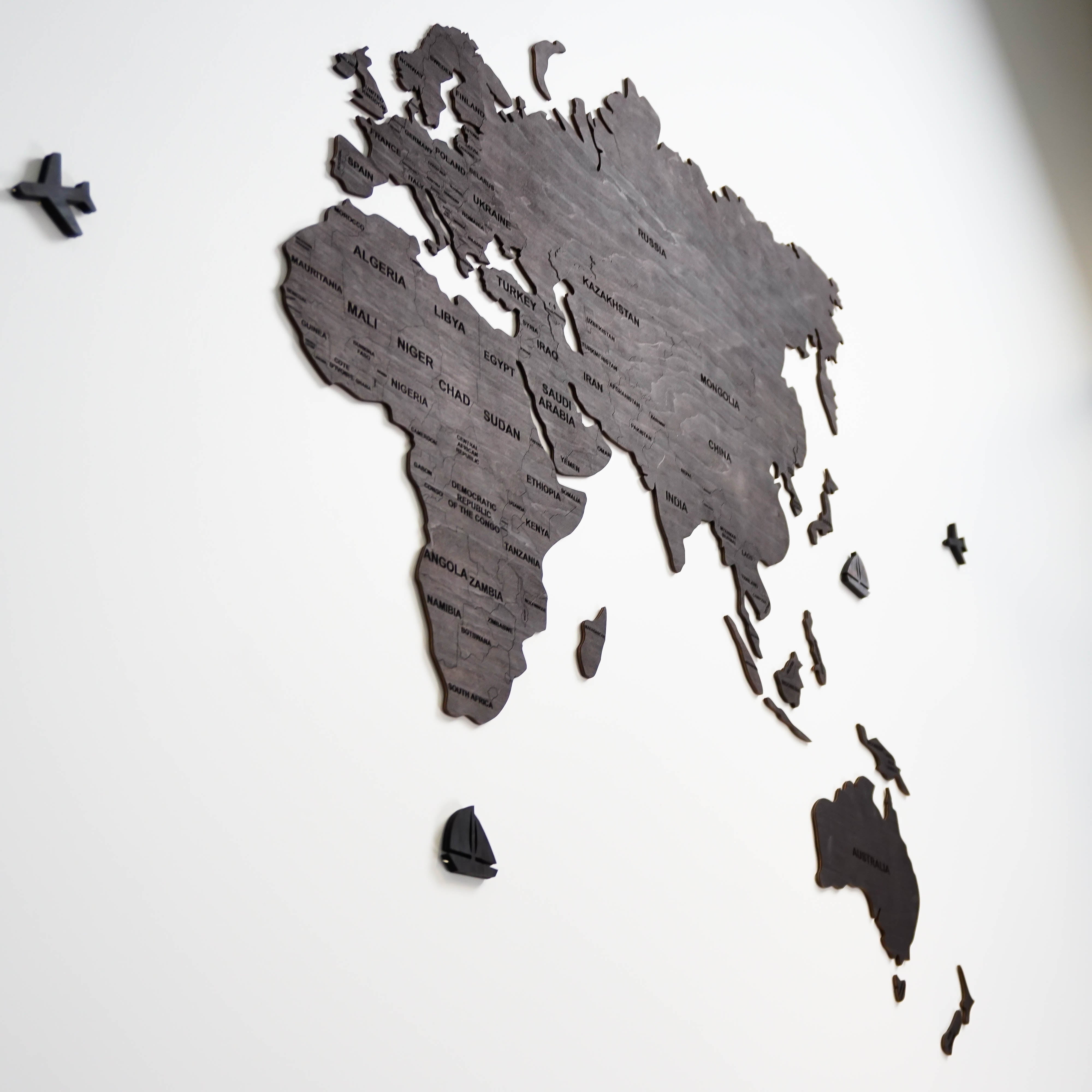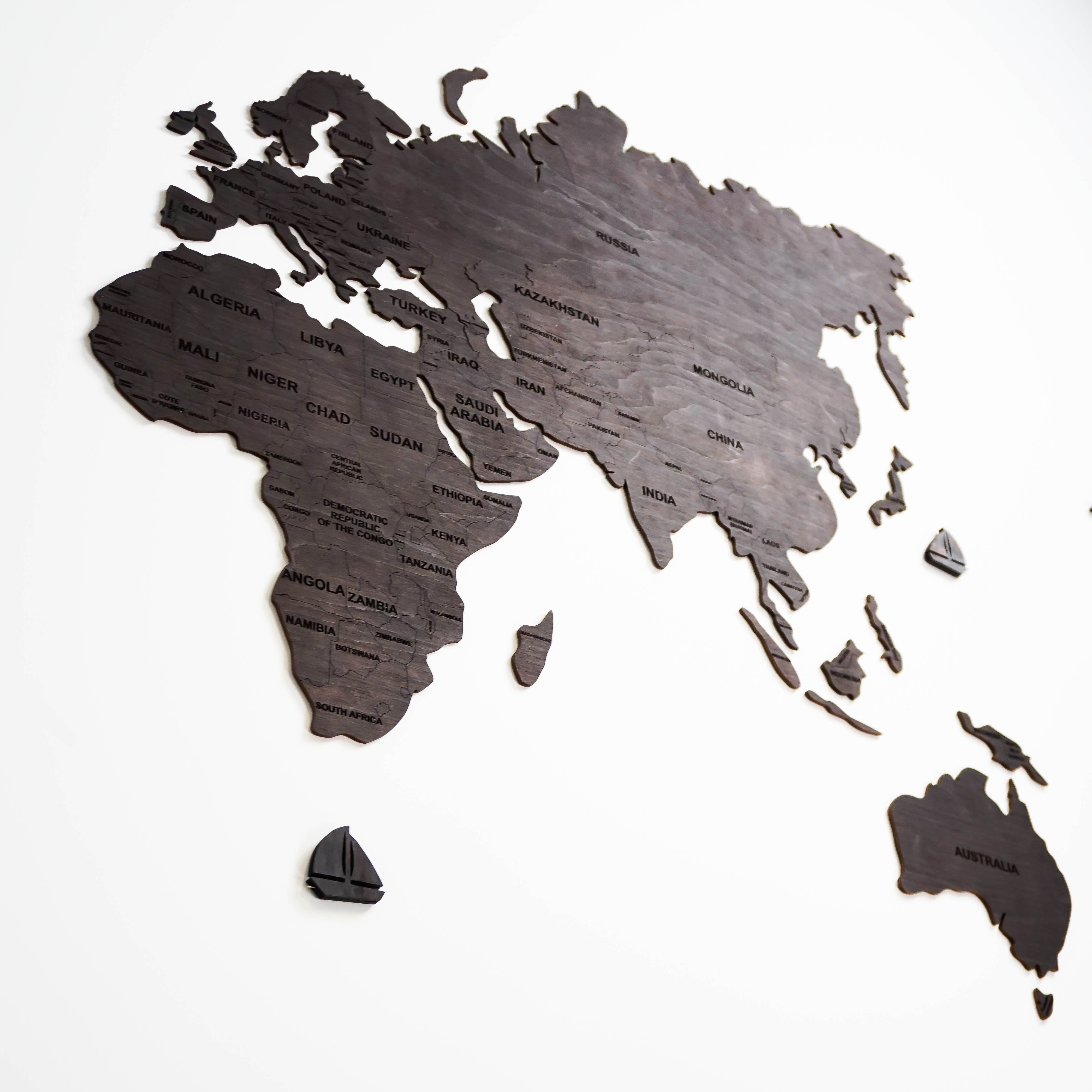 World Map set has 30 details. It can be easily fixed to a wall with double-stick tape which is included in a set, so you don't have to worry about it. And just to make it more special and unique, we are adding cute models of ships and airplanes as a gift, so you can place them on the map as an extra decoration.