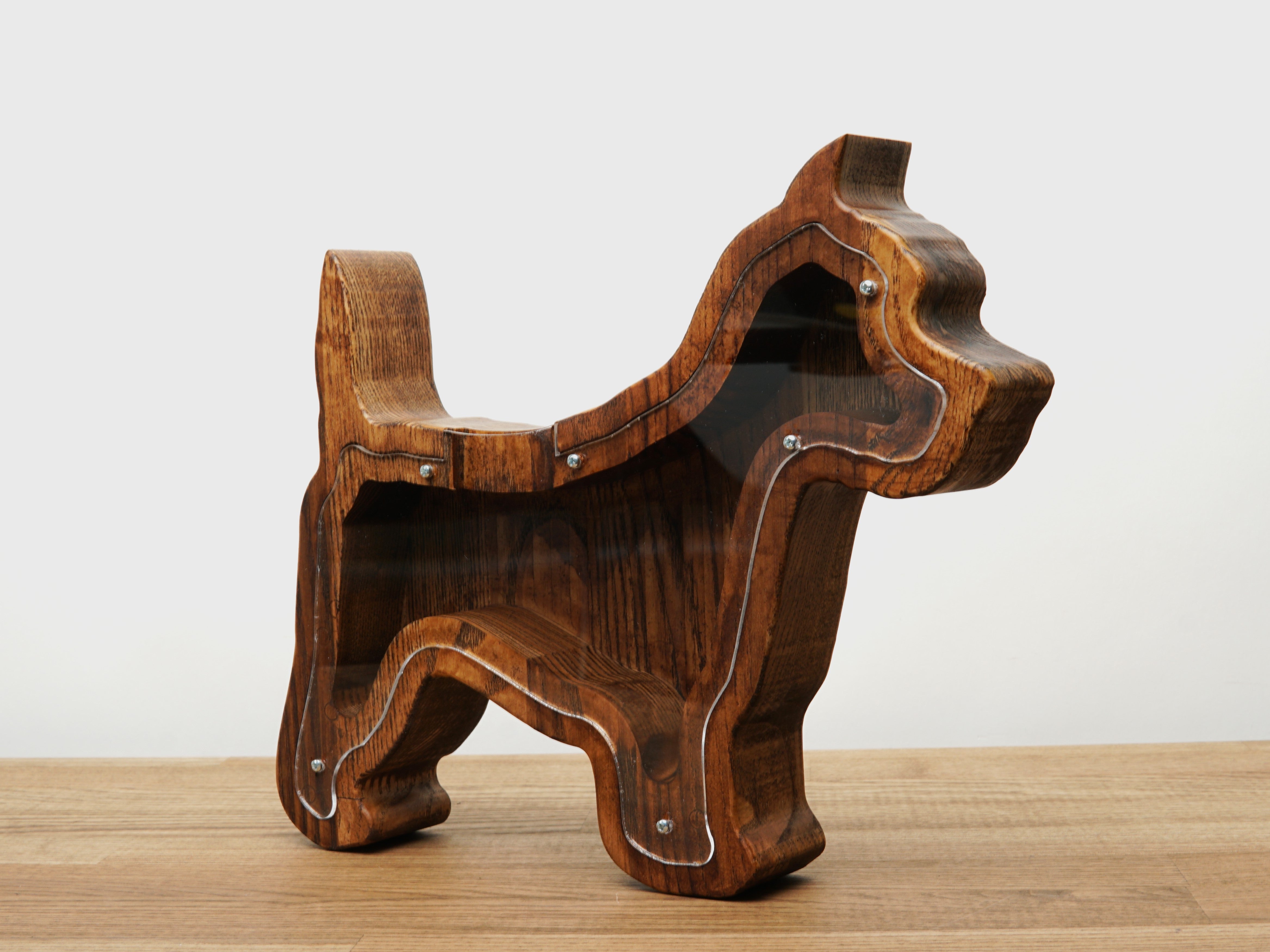 This is a wooden piggy bank dog, painted with brown stain to get the brown color while keeping the wood pattern visible. Coins are thrown through the opening at the top, and the glass must be unscrewed to remove them. The coin box is made of natural and ecological materials and organic glass and is safe for kids.