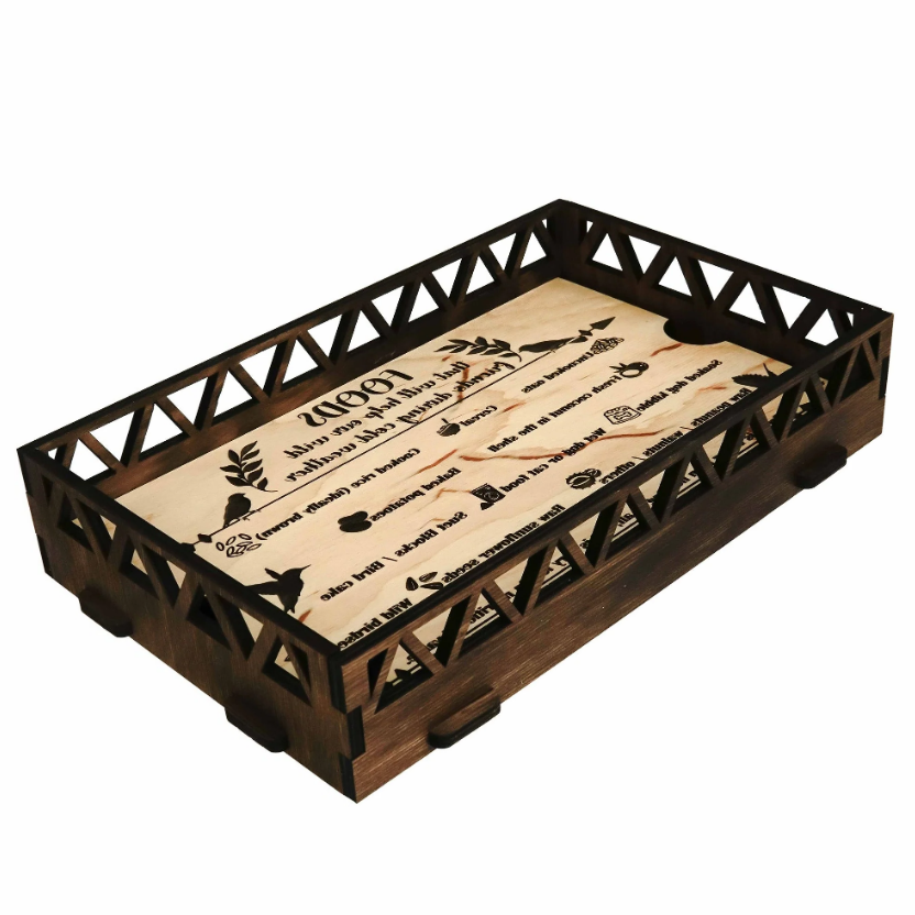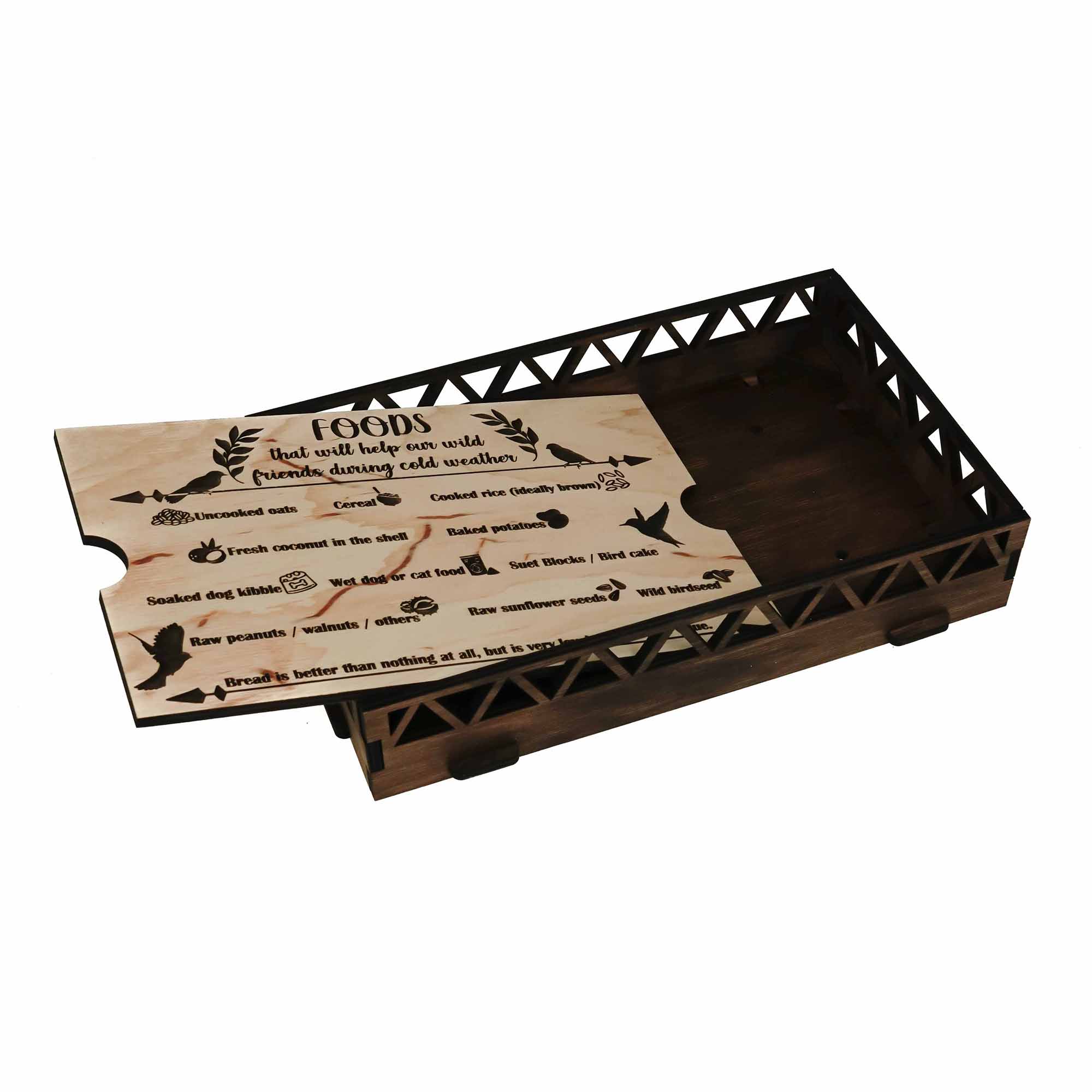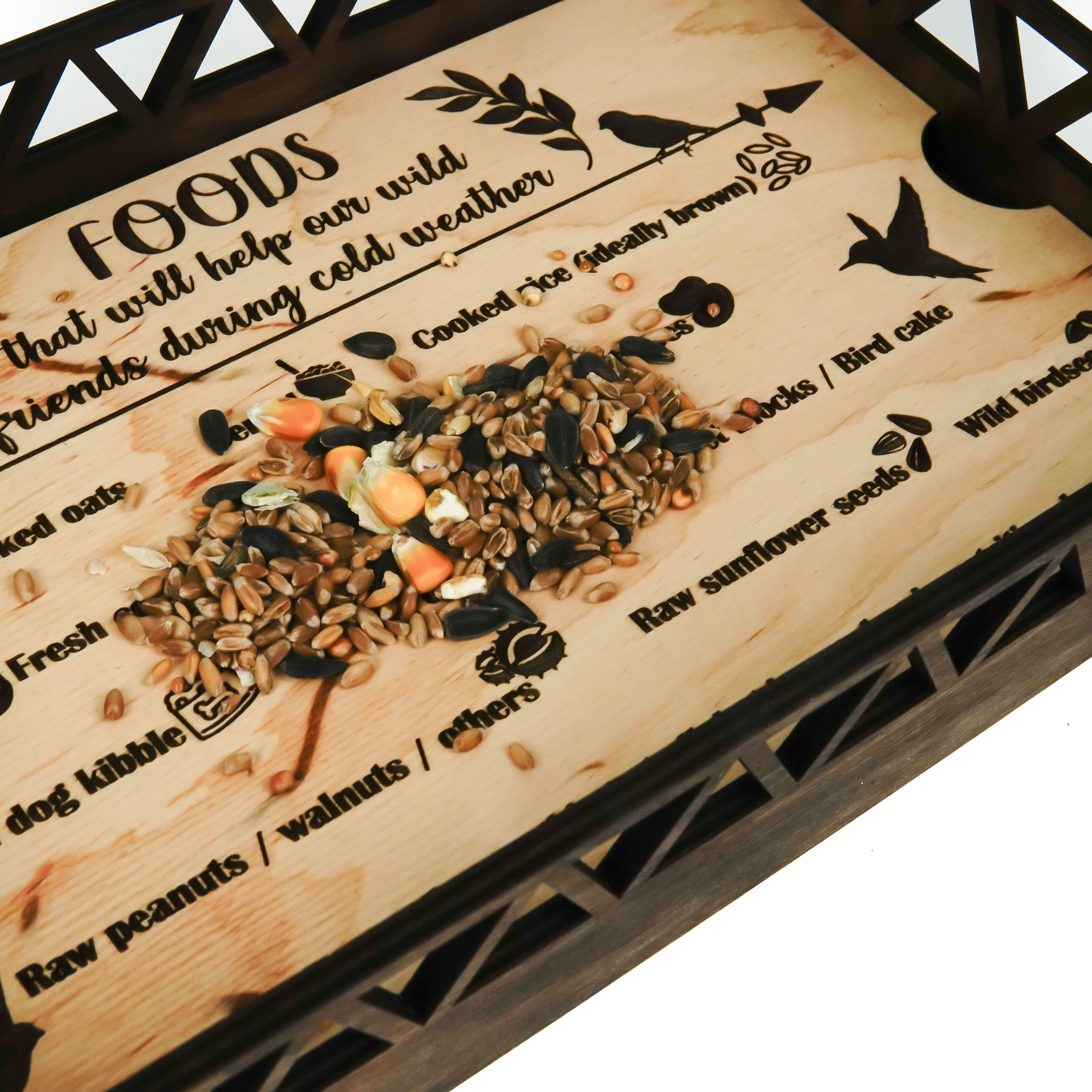Has a list of bird food engraved on the bottom plate. If you do not wish to see it or don't want to be ruined - you can flip it up and have a blank wood piece instead.