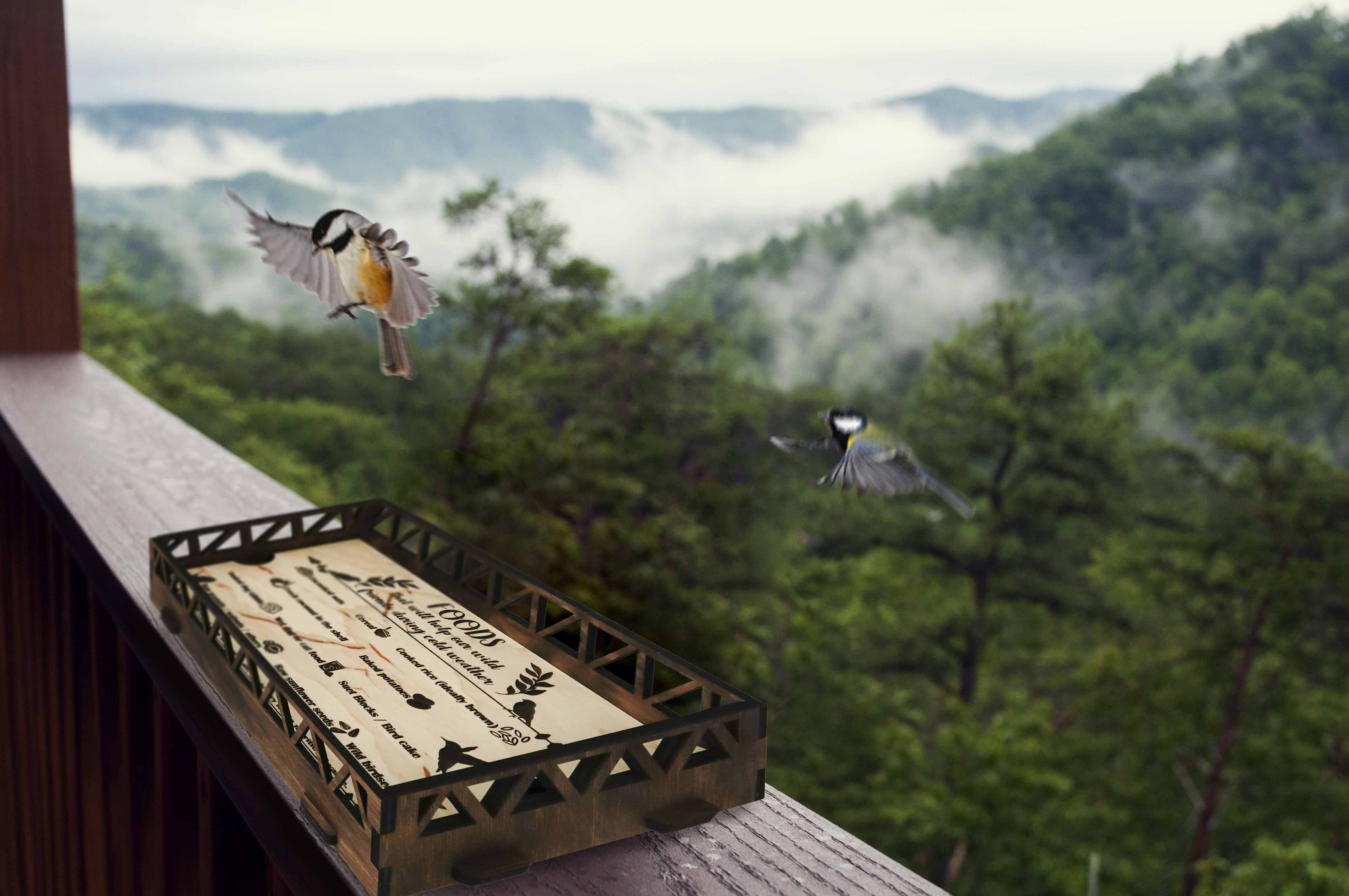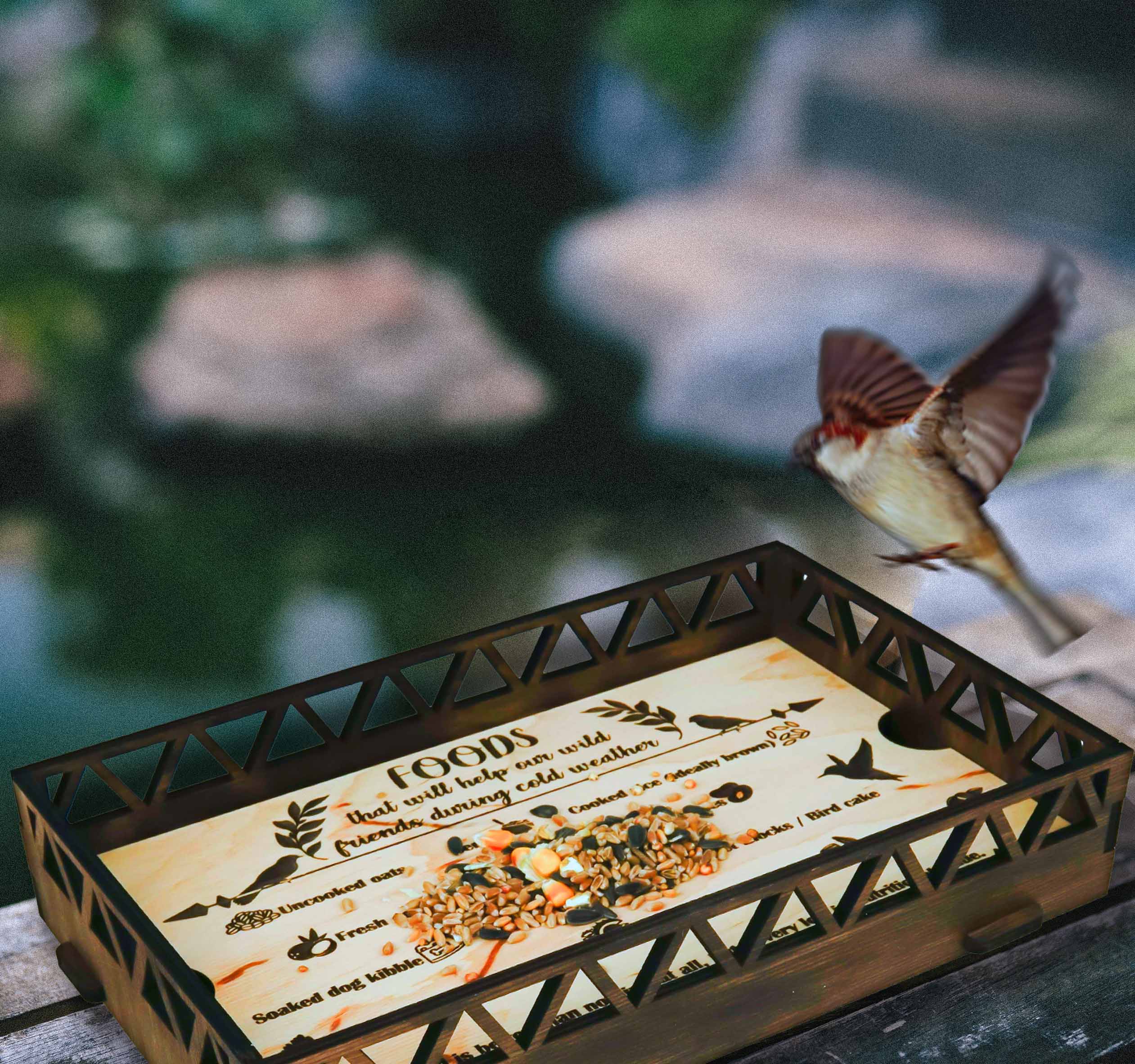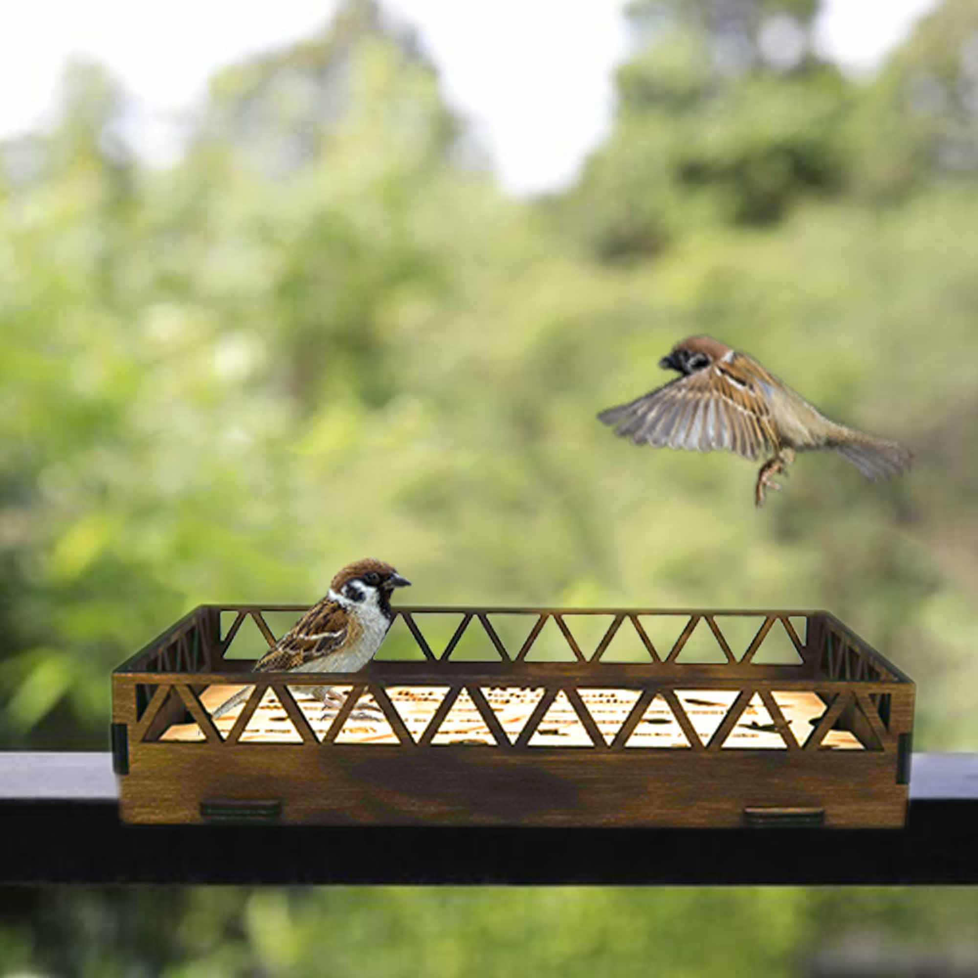 This is a very high quality and very precise laser-cut bird feeder, made of natural and organic birch plywood, painted with a brown stain. It is meant to be attached with zip ties or a rope on the edge of the balcony or loft. It's very attractive for birds, they'll see the food from far away from the sky. The bird feeder comes assembled. The brown stain coating protects the bird feeder from snow, wind, and rain, making it a long-lasting piece in the garden. We use it ourselves and we trust them. The bird feeders can be a great gift for an animal lover or a garden.