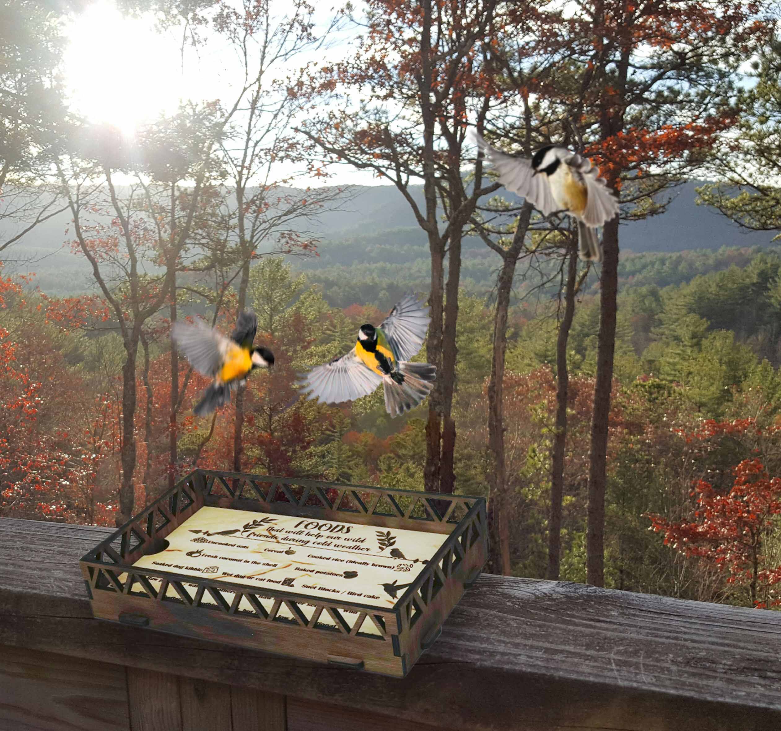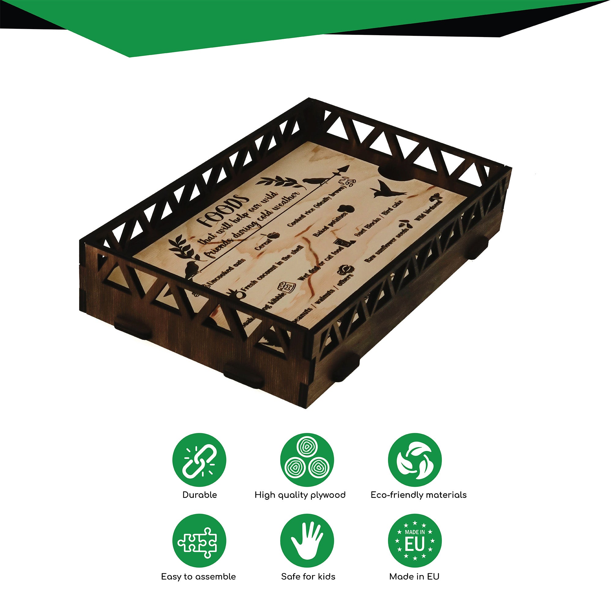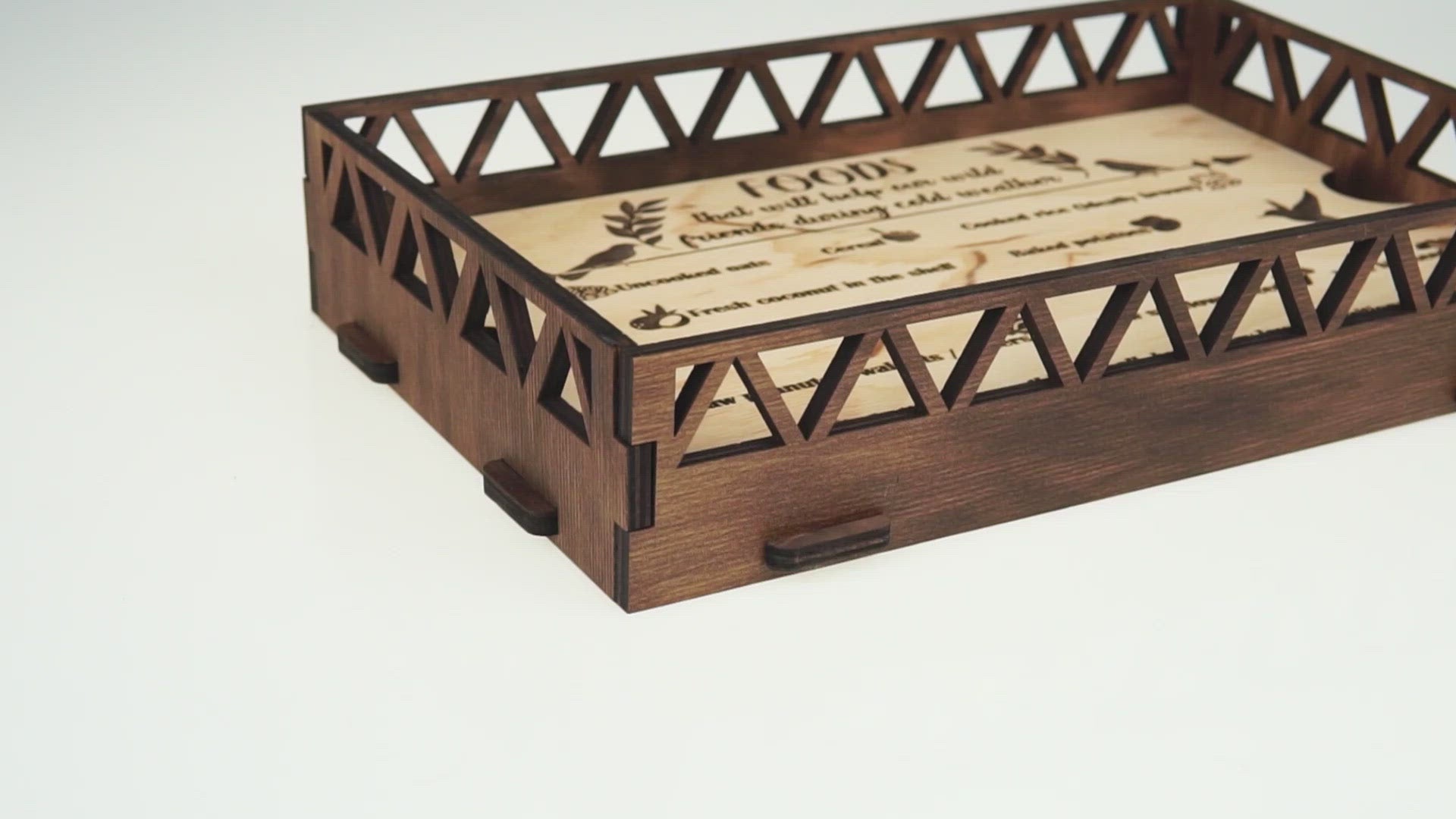 This is a very high quality and very precise laser-cut bird feeder, made of natural and organic birch plywood, painted with a brown stain. It is meant to be attached with zip ties or a rope on the edge of the balcony or loft. It's very attractive for birds, they'll see the food from far away from the sky. The bird feeder comes assembled. The brown stain coating protects the bird feeder from snow, wind, and rain, making it a long-lasting piece in the garden. We use it ourselves and we trust them. The bird feeders can be a great gift for an animal lover or a garden.