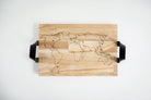 This is one of a kind classical style cutting board suitable for all kitchens! The chopping board has two natural leather handles that are attached with stainless bolts. Thanks to these handles, the cutting board can be served as a serving plate. The cutting board is made from glued solid wood, the wooden pattern looks stylish and beautiful. On the top - engraving of a world map. It has oil covering that adds durability and helps to keep it safe from water effects and makes it a long-lasting kitchen accessory.