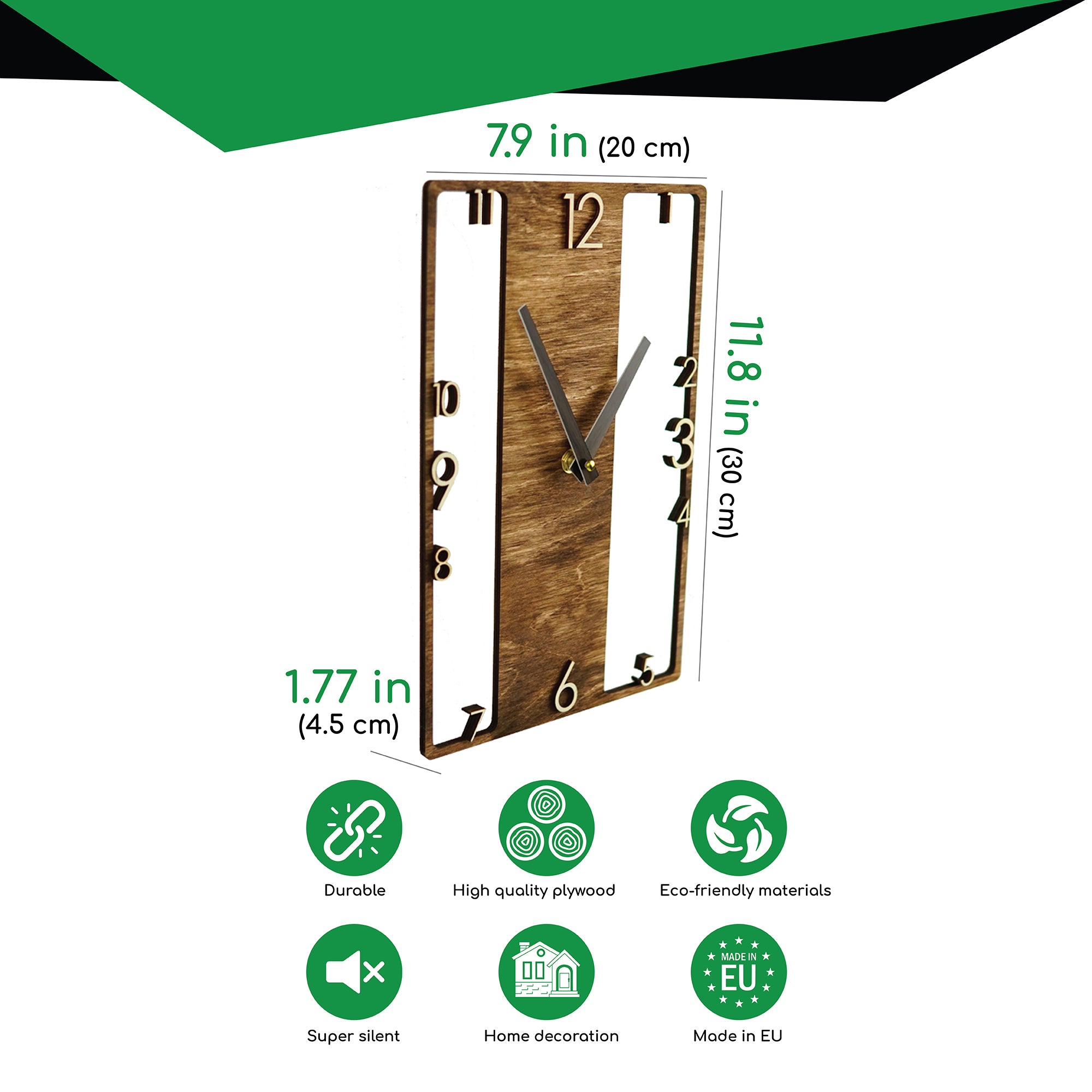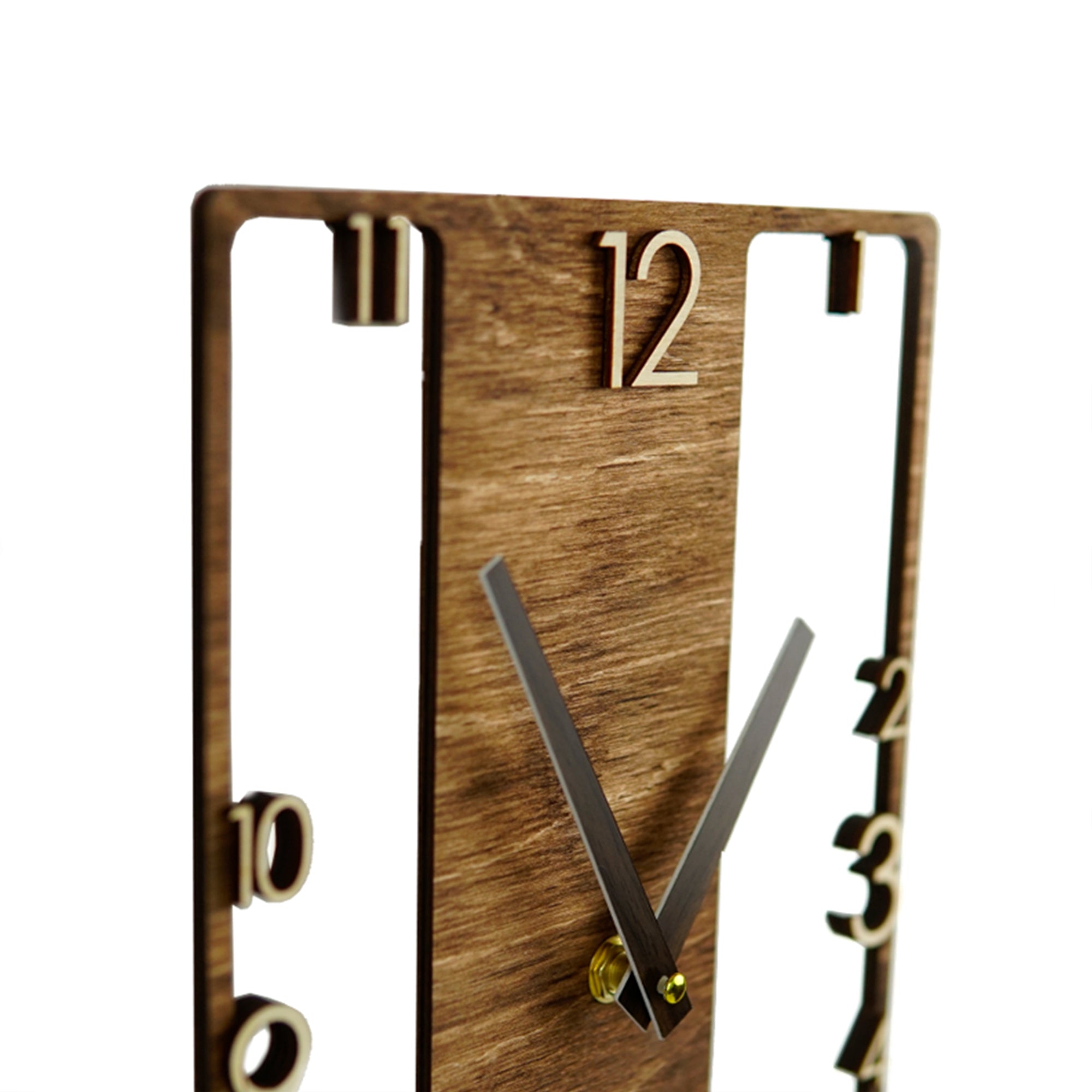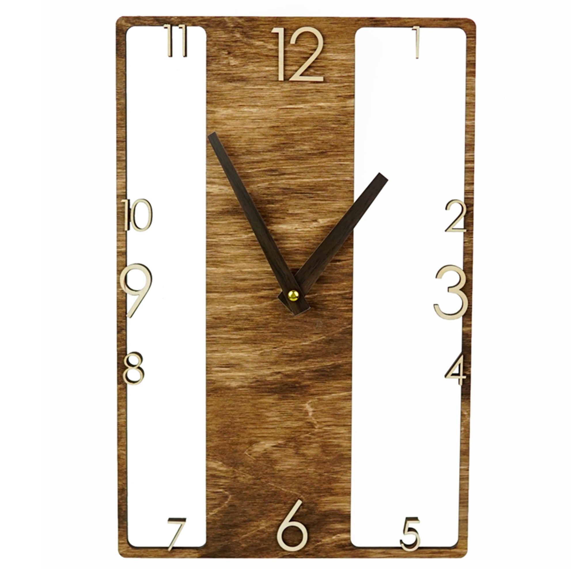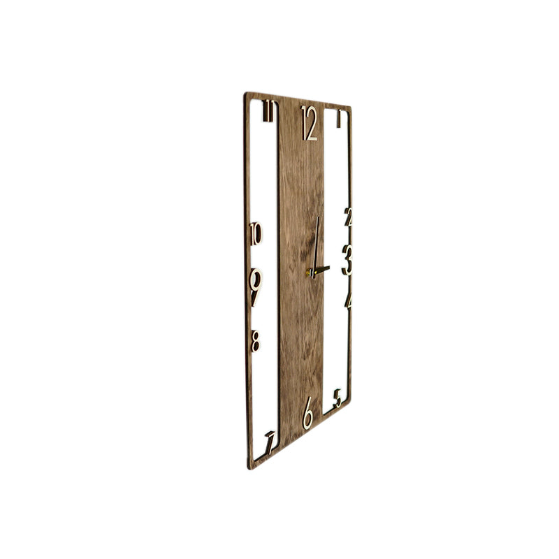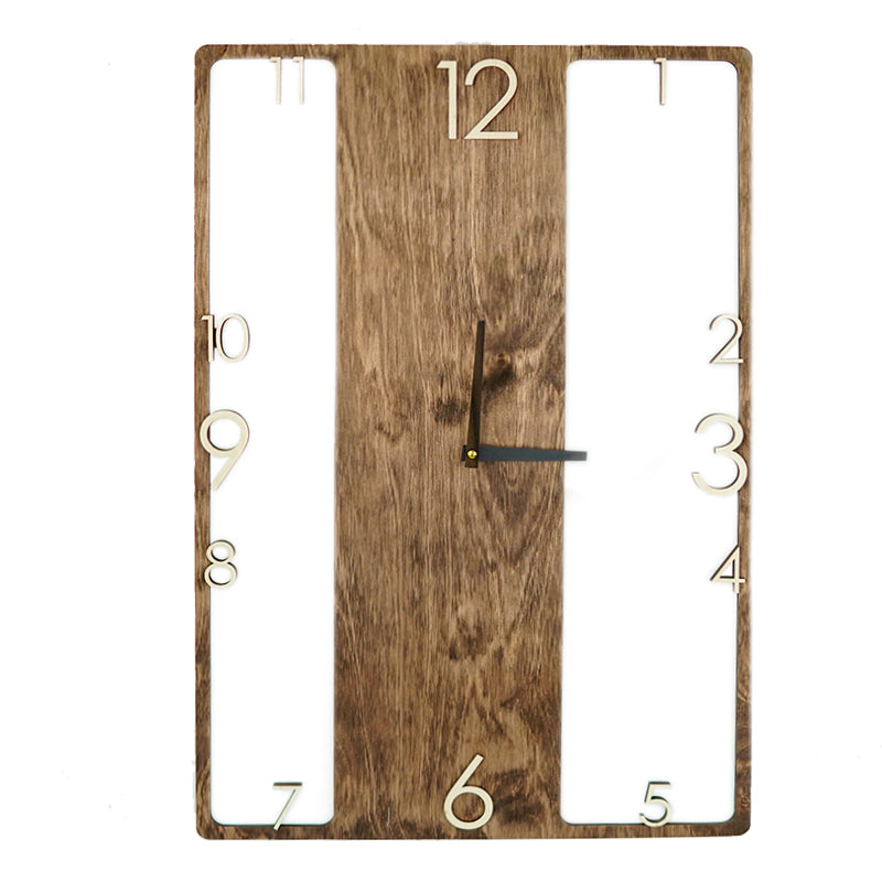 Wooden wall clock with a distinctive design that adds character to any room. The silent, non-ticking mechanism ensures a quiet environment, making it suitable for bedrooms, living rooms, or offices. Easy to hang on the wall on a hook or nail, this clock combines functional timekeeping with an original design, fitting naturally into any interior.