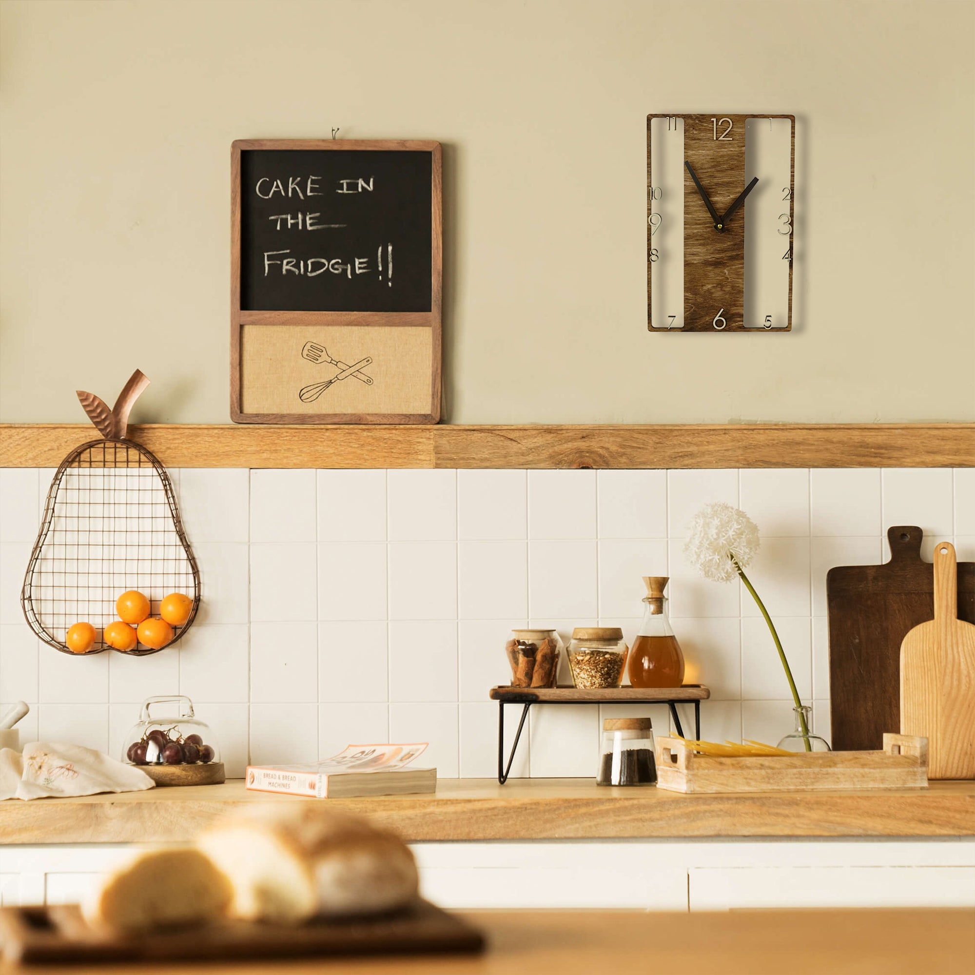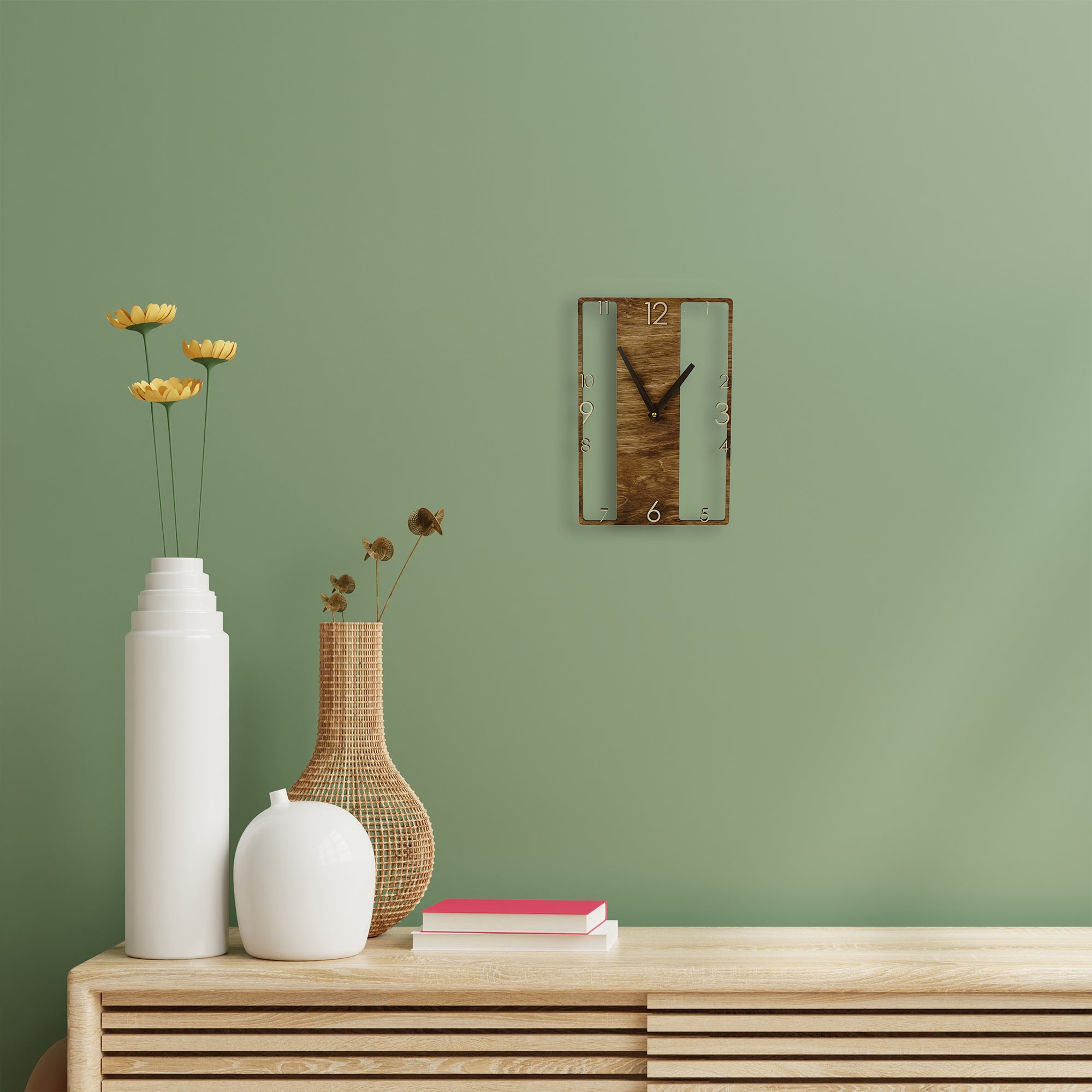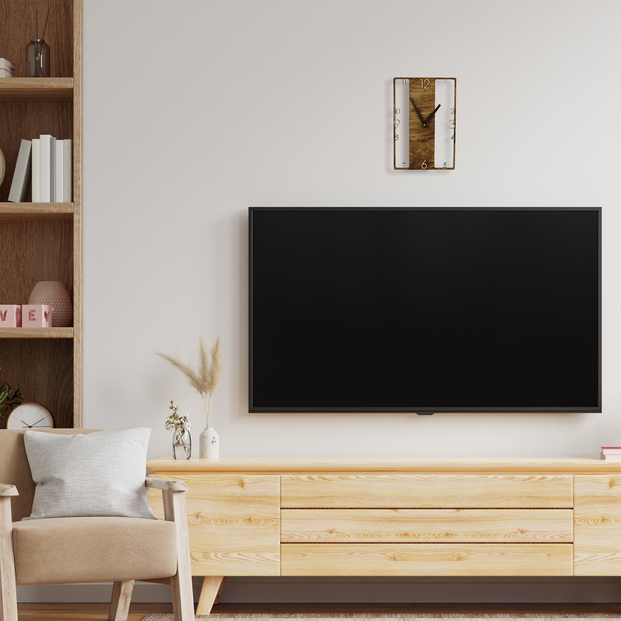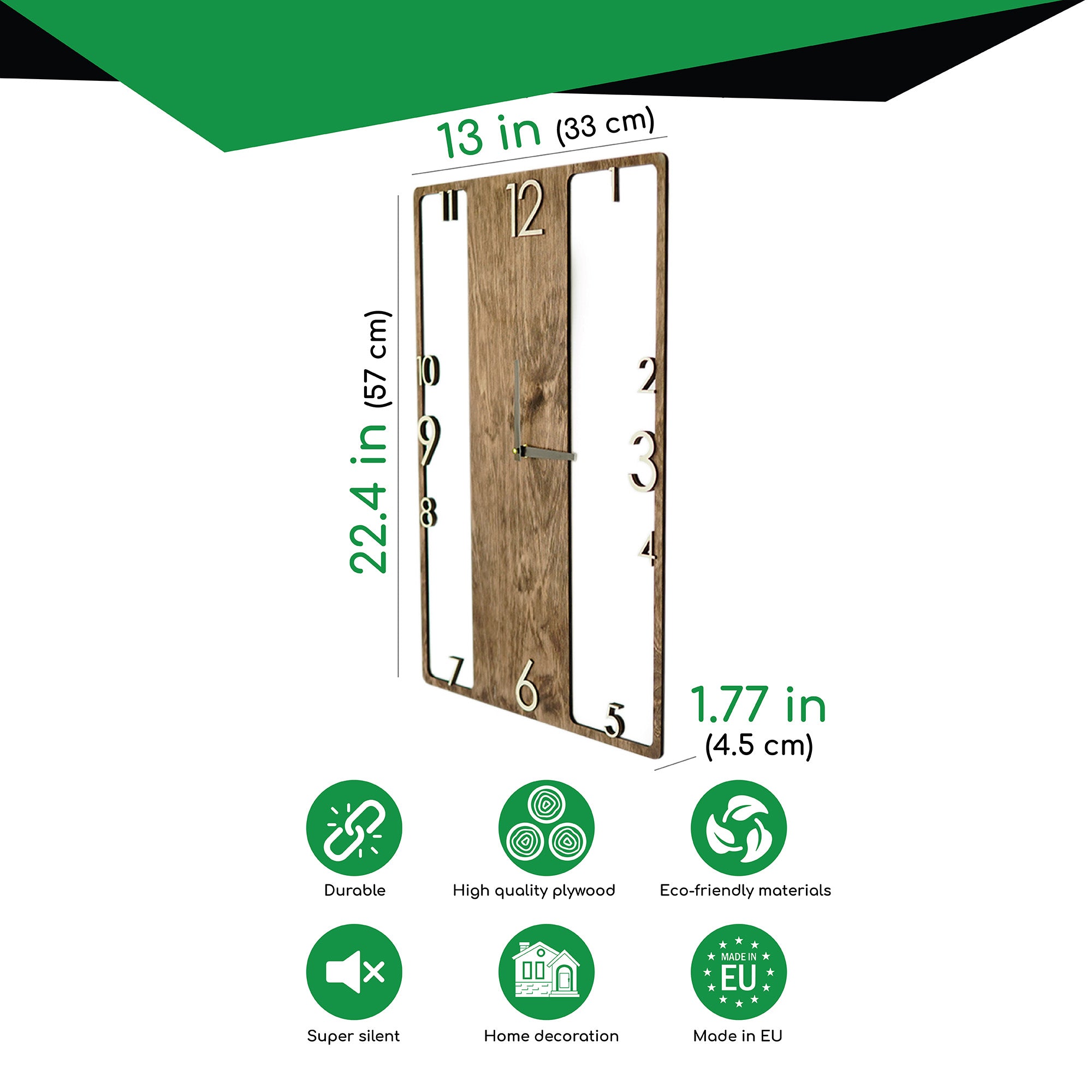 Wooden wall clock with a distinctive design that adds character to any room. The silent, non-ticking mechanism ensures a quiet environment, making it suitable for bedrooms, living rooms, or offices. Easy to hang on the wall on a hook or nail, this clock combines functional timekeeping with an original design, fitting naturally into any interior.
