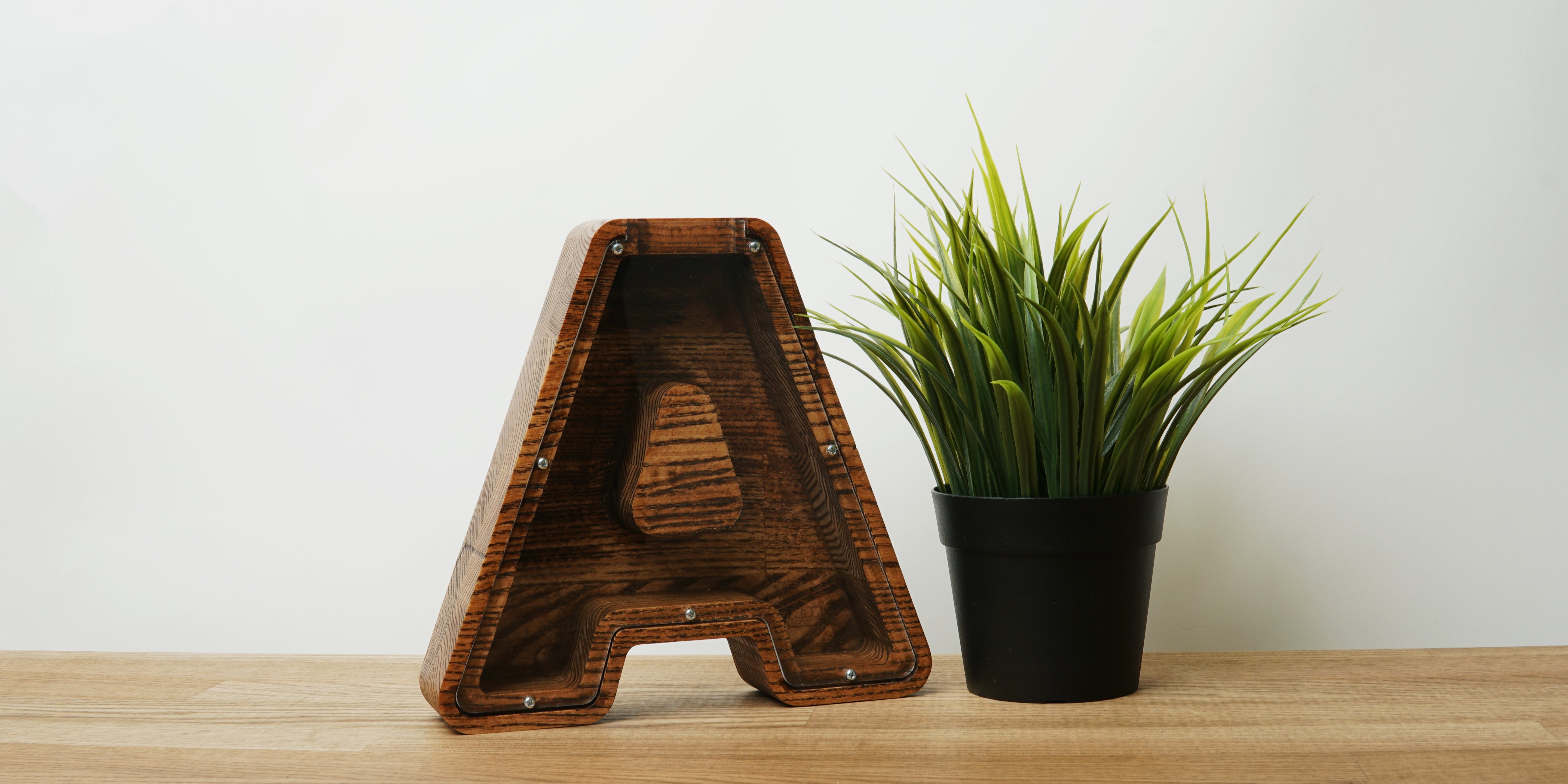 Custom letter wooden piggy bank with a transparent organic glass. Made of natural Ashwood block and painted with a brown color stain. The piggy bank can be a great and memorable gift for a child, baby, or adult, and with the personalized engraving on the glass, it will look even more beautiful and unique.