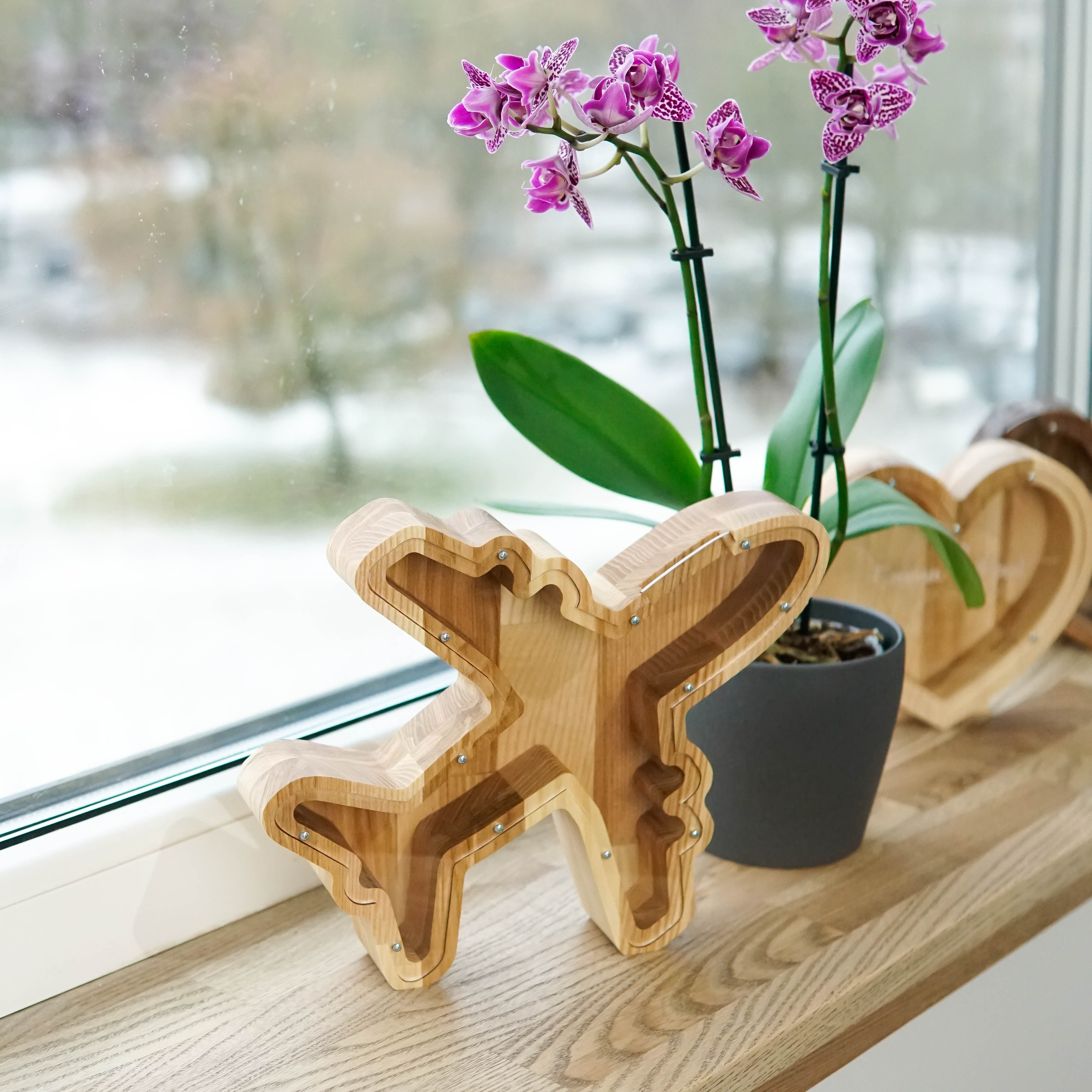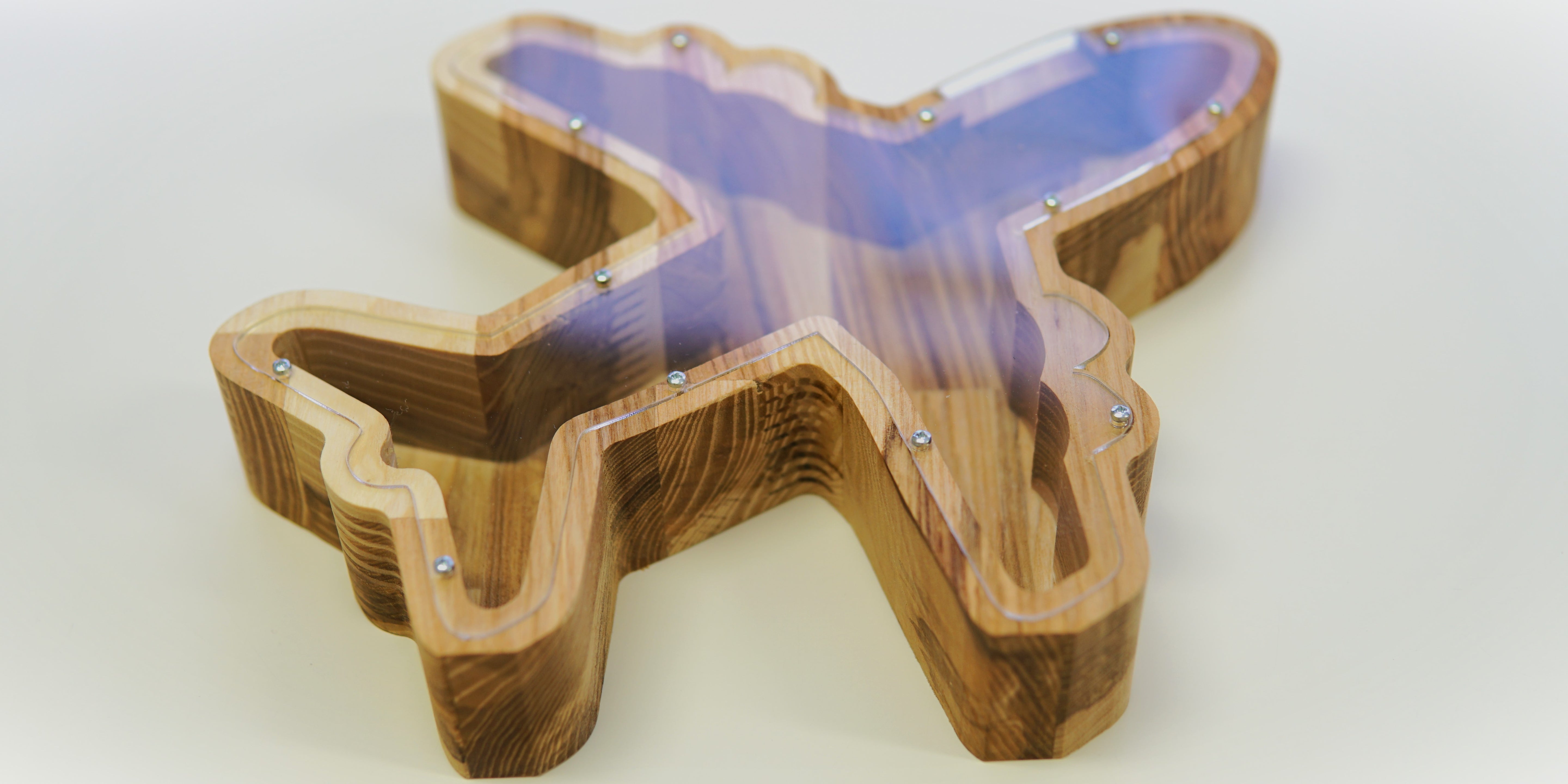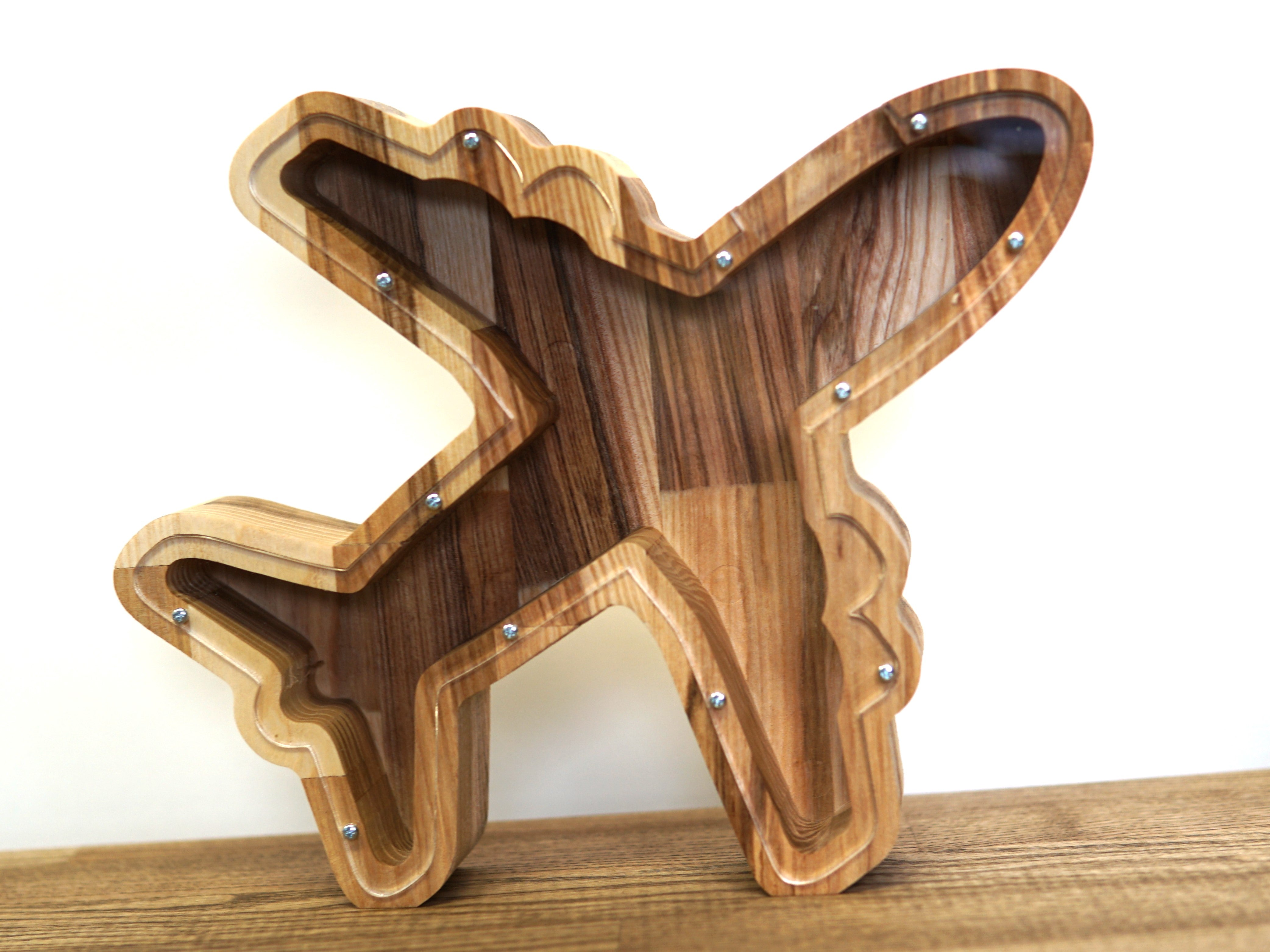 This is a wooden piggy bank in a shape of a plane, crafted from a single piece of ashwood. Perfect gift for a baby boy, girl, or just any person that loves planes and saving money. Could be a great gift for a birthday, a present for Christmas, or just a cool addition and decoration for home. We can also engrave your wanted name on the glass.