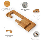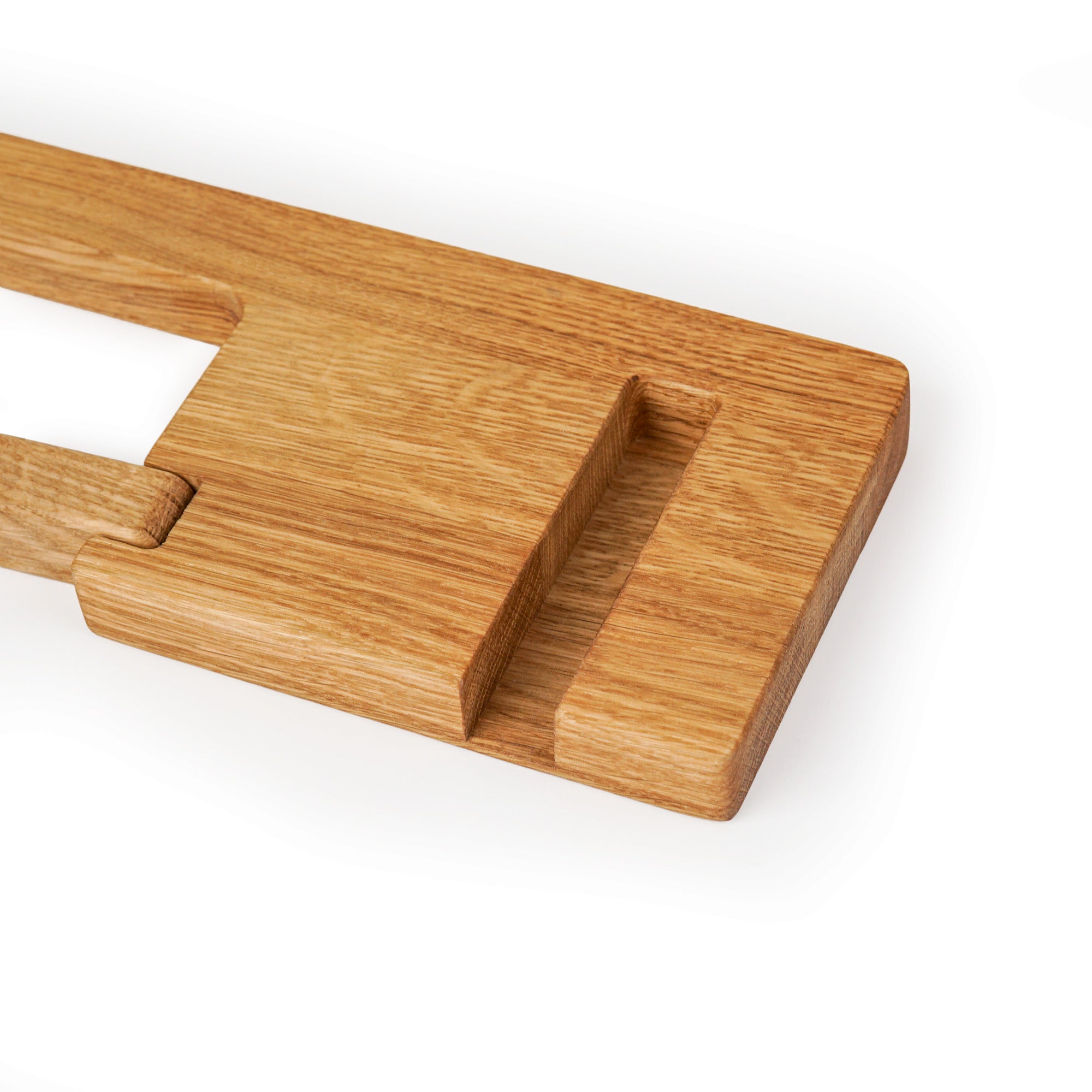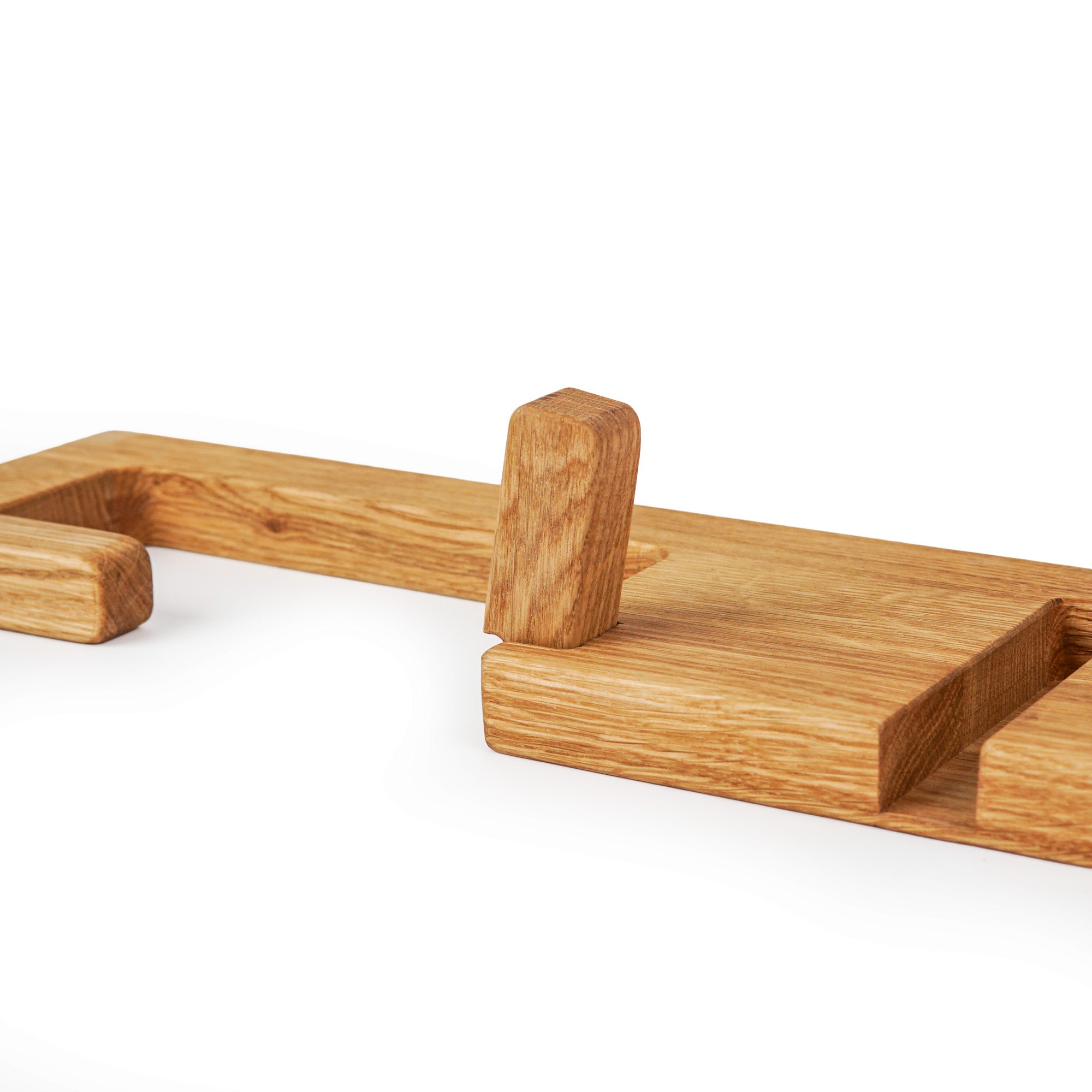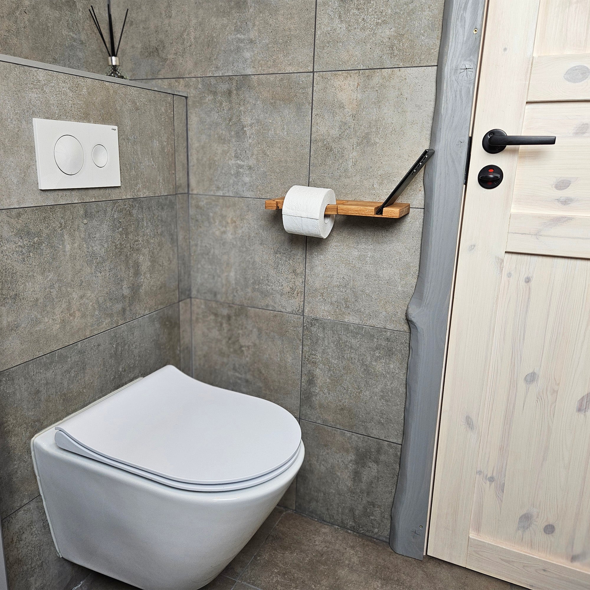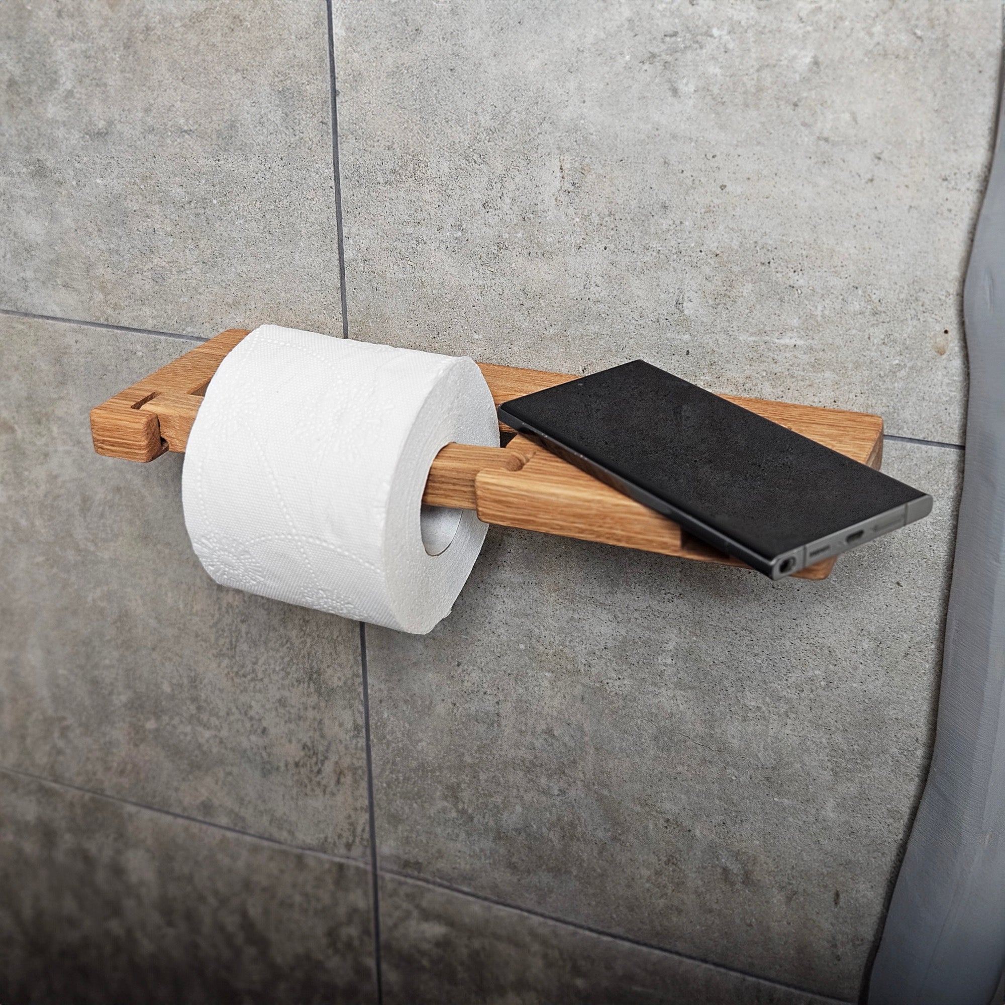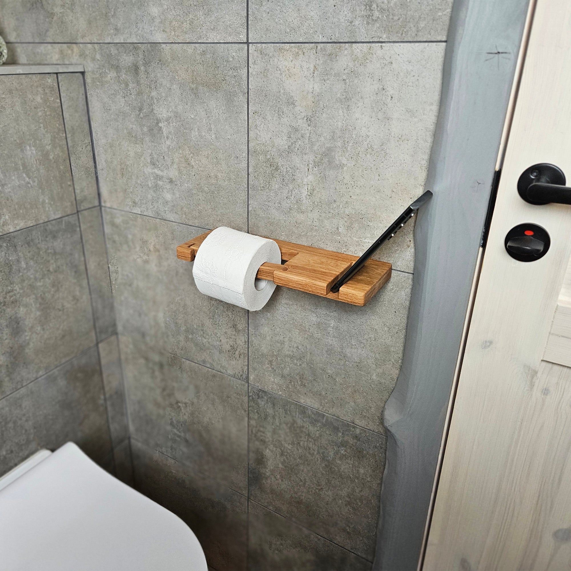 This wall-mounted toilet paper holder is made from solid oak wood and features an integrated shelf with a built-in slot designed to hold a smartphone, tablet, or other small electronic devices. The compact design saves space while adding practical convenience to your bathroom. Ideal for modern and minimalist interiors.