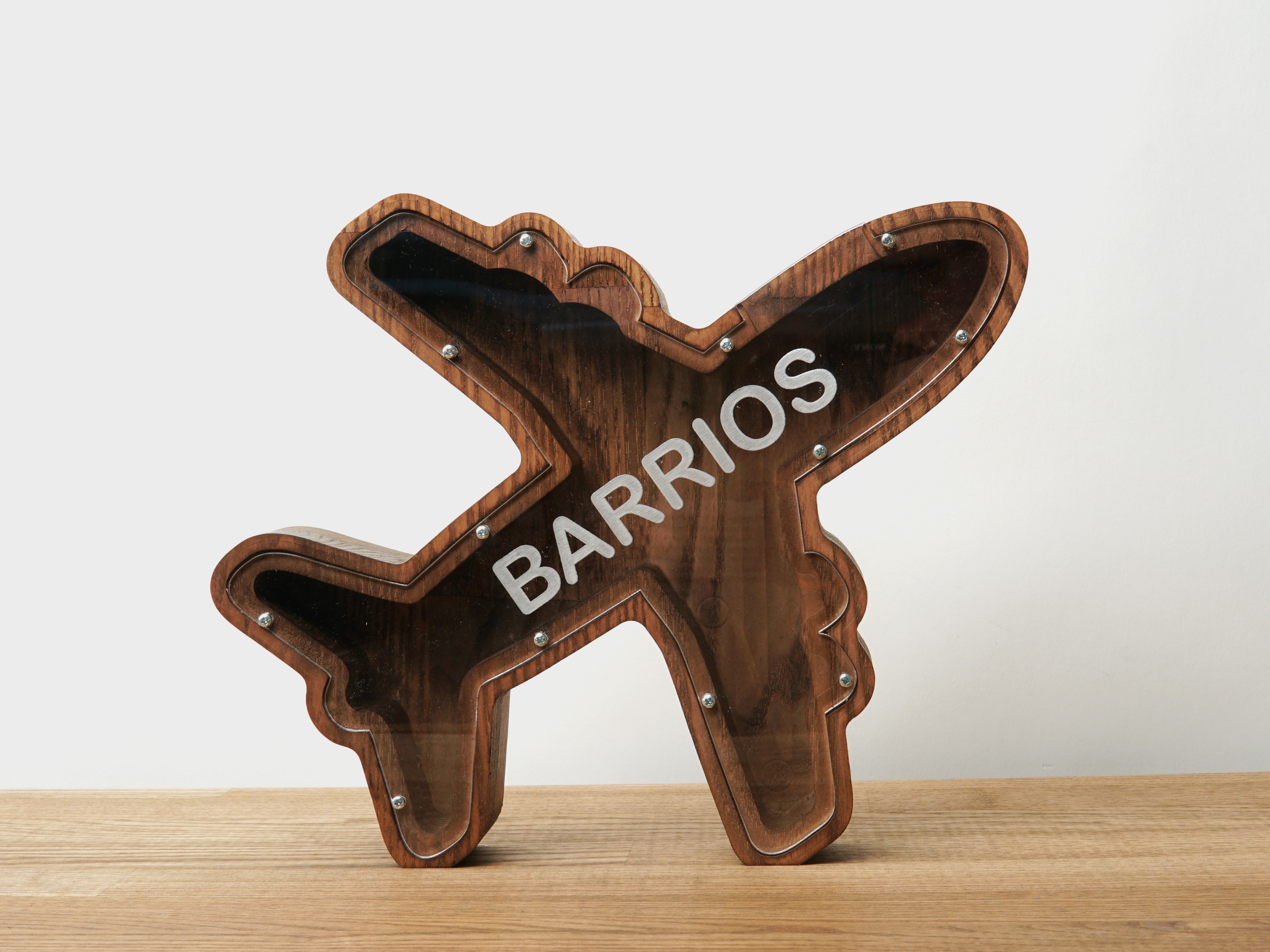 A plane-shaped piggy bank designed for children or as a decorative coin bank for the home or office. Perfect for a kids’ room, desk accessory, or toy bank, it encourages saving money while adding a playful touch. Its airplane design makes it suitable as a children's gift, home decor item, or for plane enthusiasts.