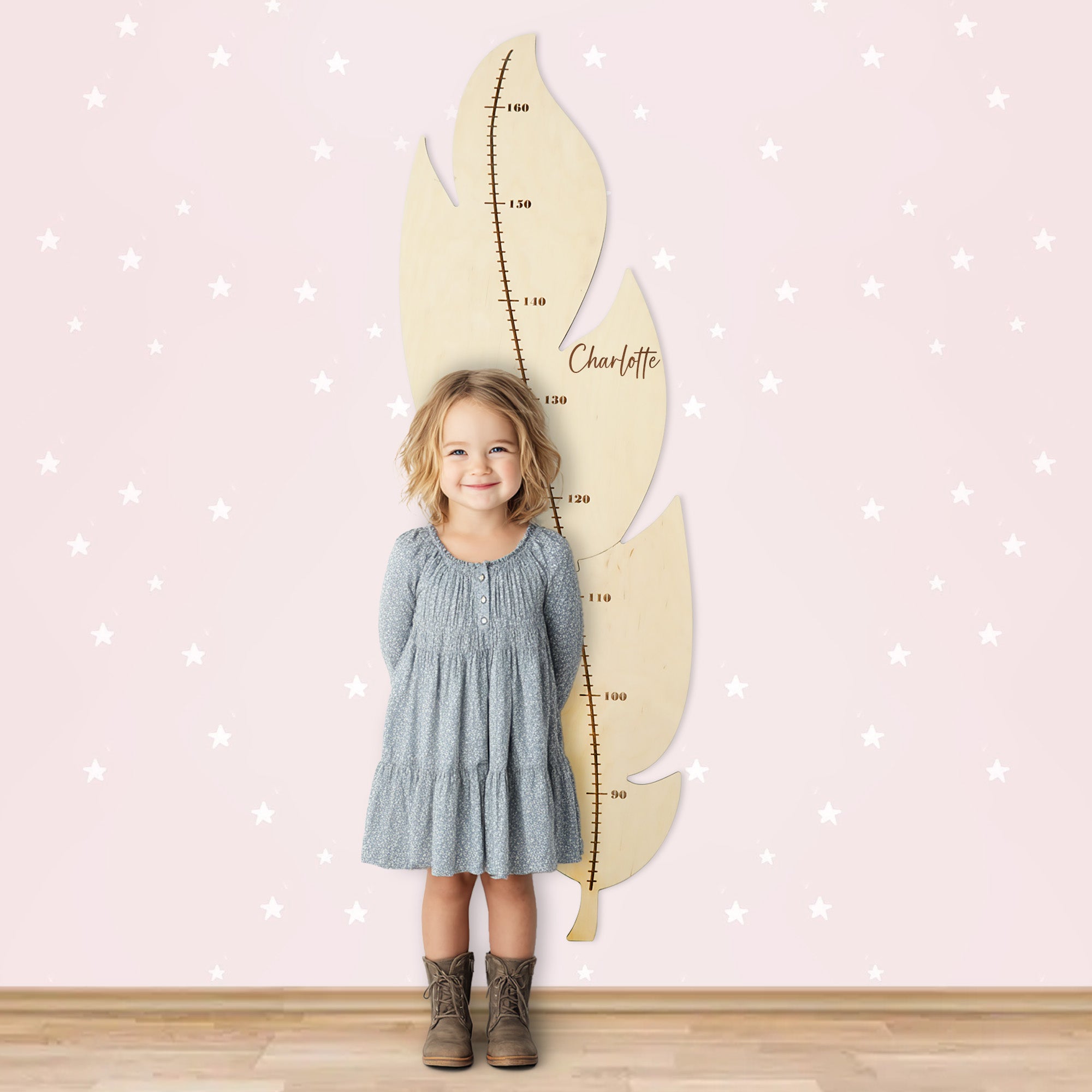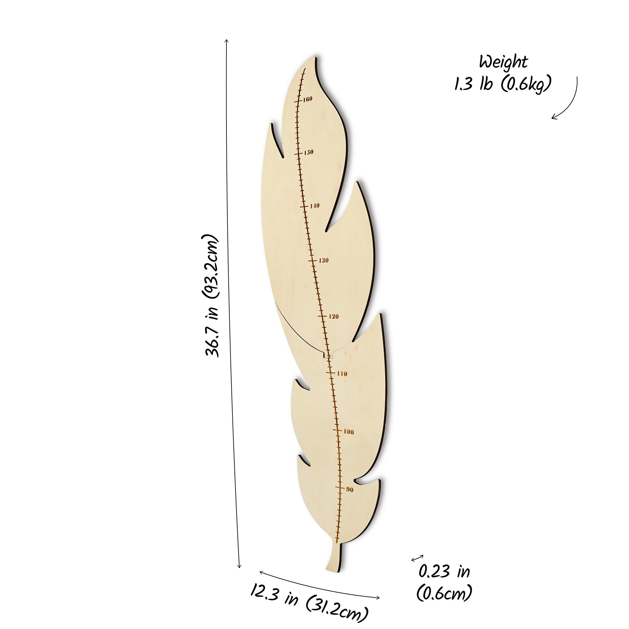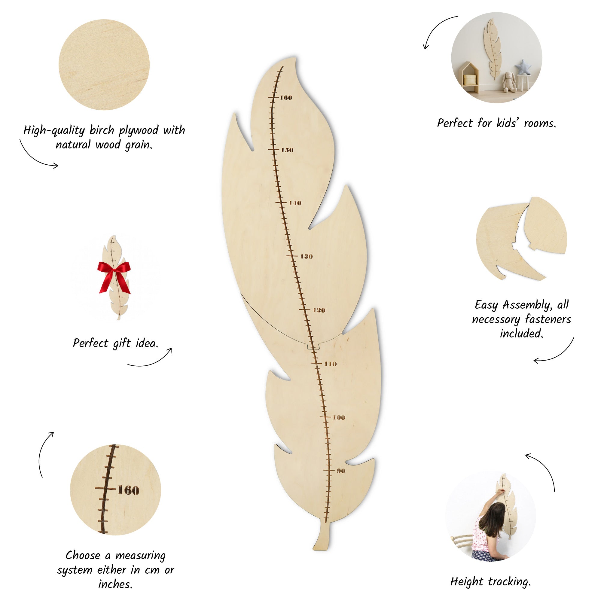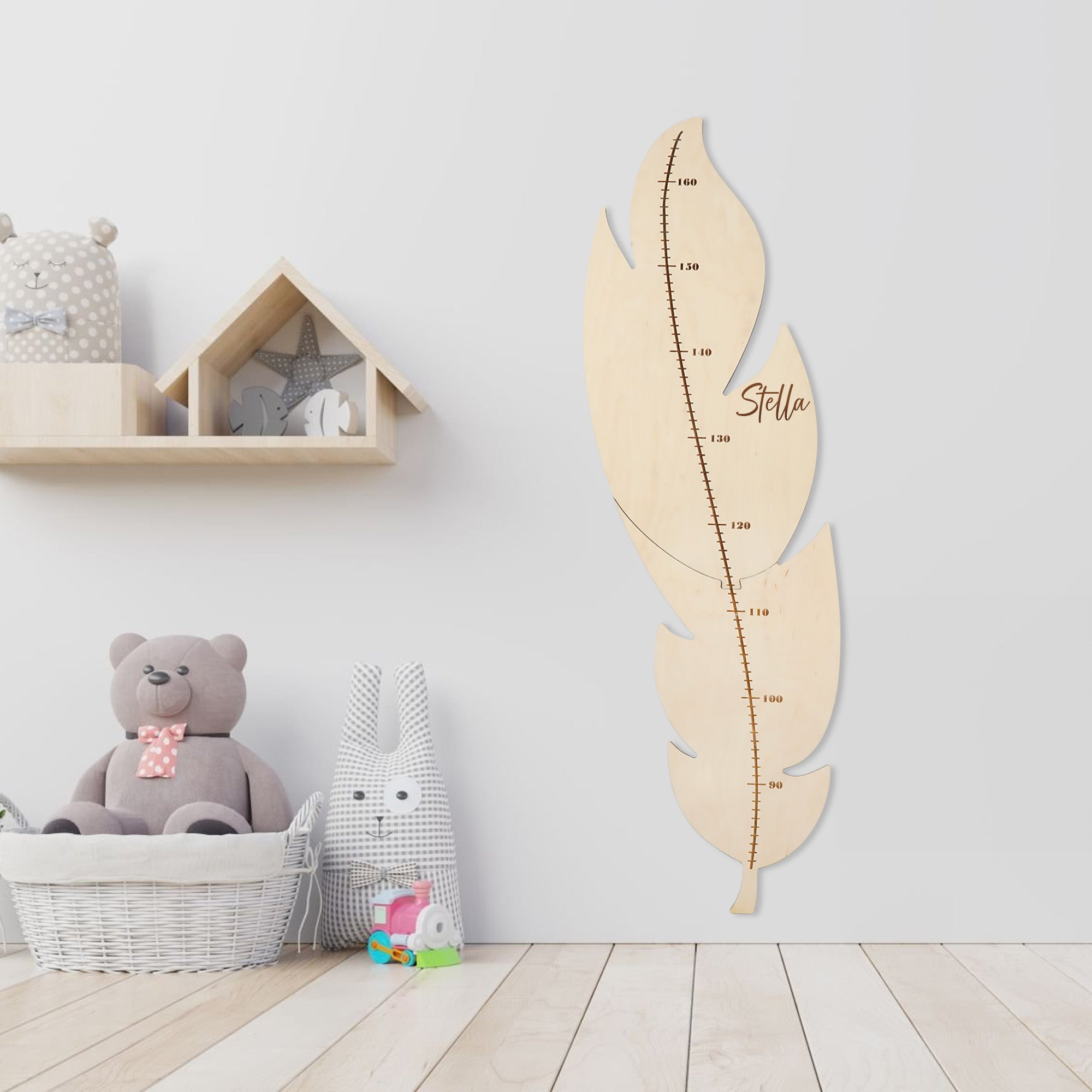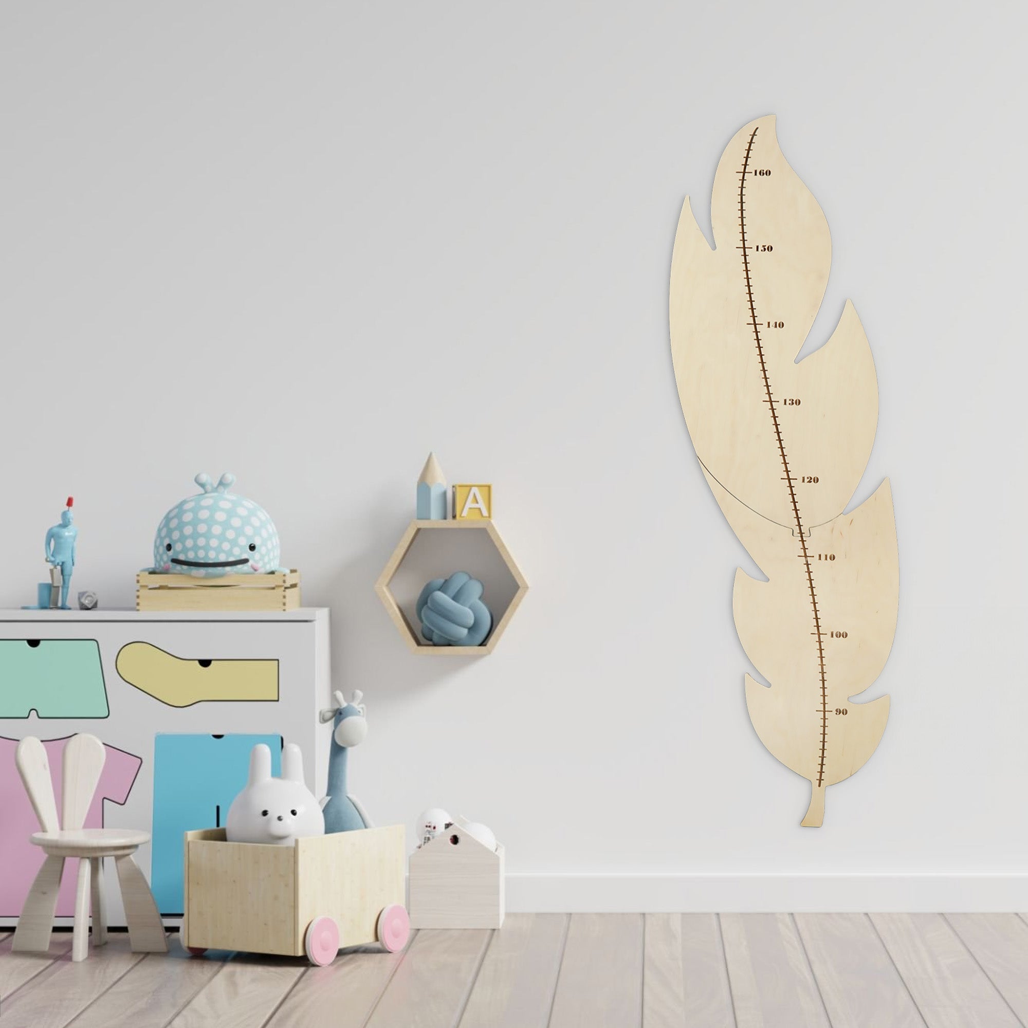 This feather-shaped growth chart is a functional and stylish addition to any nursery, suitable for both boys and girls. Designed in two interlocking pieces, it is easy to assemble and allows for a seamless, clean look on the wall. Its minimalist design makes it a versatile decorative element, fitting well with a variety of interior styles while providing a practical way to track your child’s growth over time.