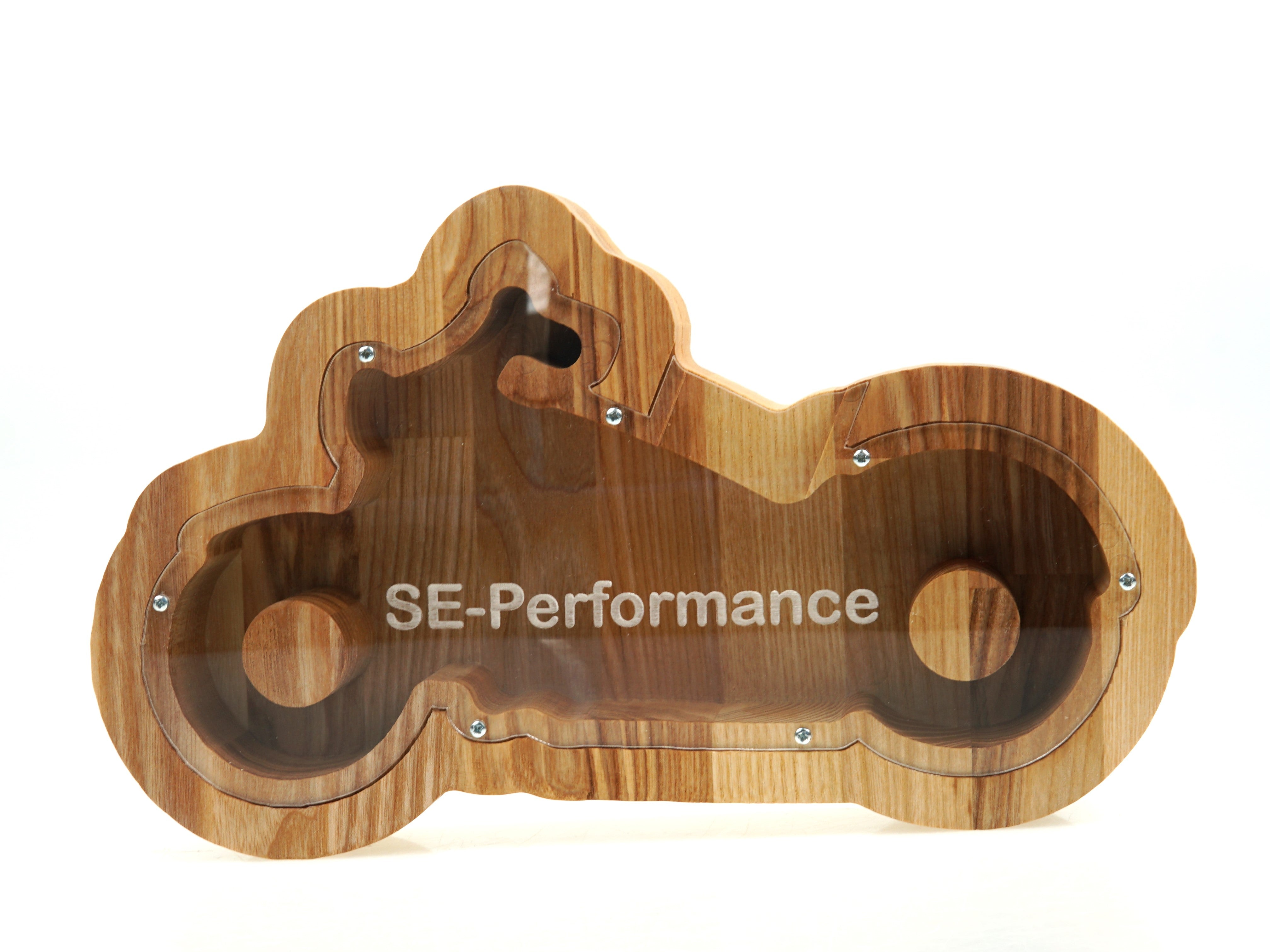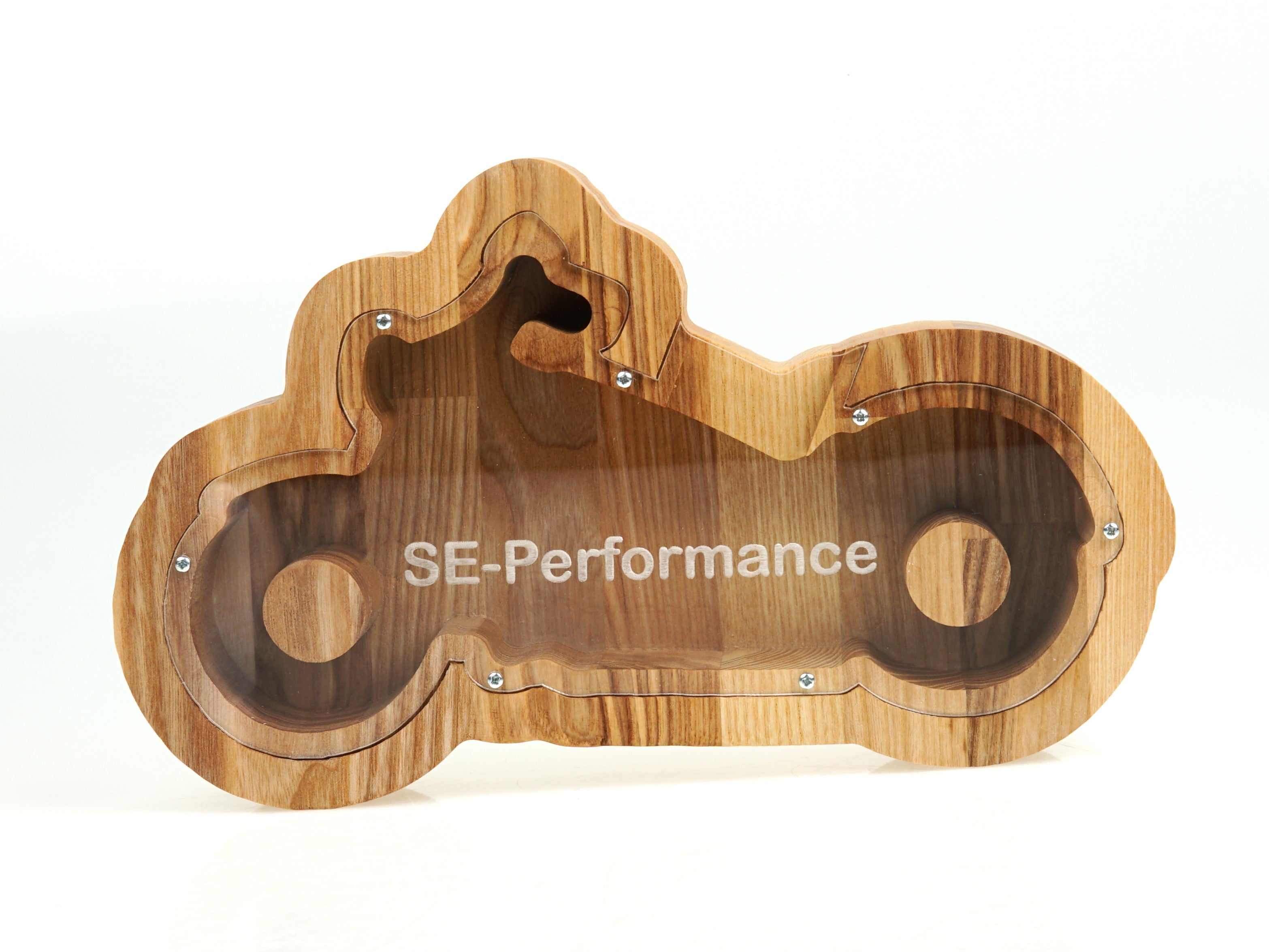 This Motorcycle piggy bank is crafted from a single piece of ashwood. Perfect gift for a baby boy or any person that loves bikes and motorcycles. Can be the perfect gift for a birthday or a present for Christmas. We can engrave your wanted name on the glass to make it different and unique.