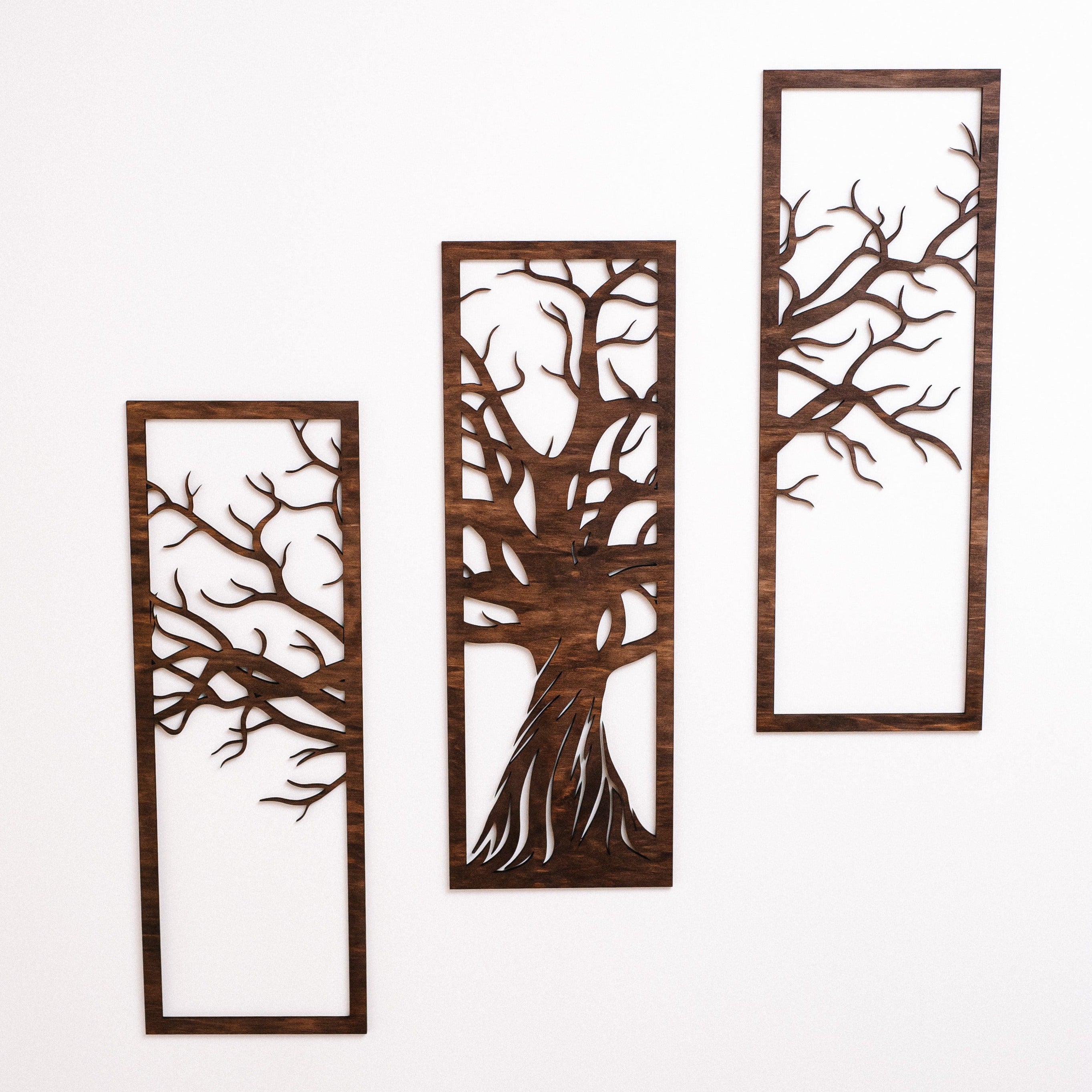 This wall art is an excellent addition to your home decor! Large wooden 3 panel picture is made of high-quality birch plywood and is completely environmentally friendly, we use only certified materials and high-precision equipment for cutting products. You can put all three parts close together or adjust them as per your taste. Panels are coated with a beautiful brown finish, that resembles the natural bark of the tree. Easy to attach to any wall. Could be bought as a nice housewarming gift.