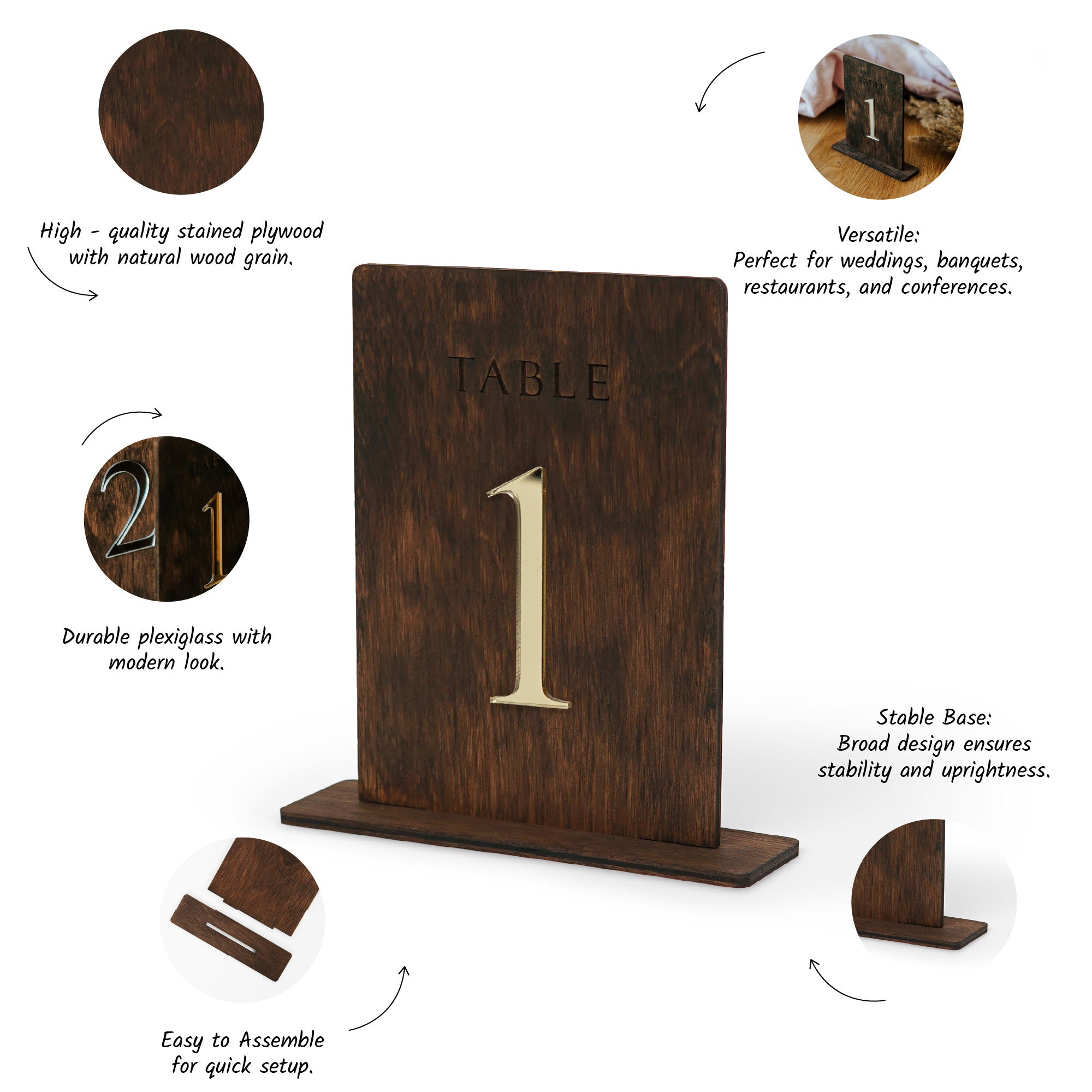 - Each number features a minimalist arch-shaped design. Its simple, modern look makes it easy to place on any table without additional support. The design is perfect for adding an elegant touch to any event or wedding decor.