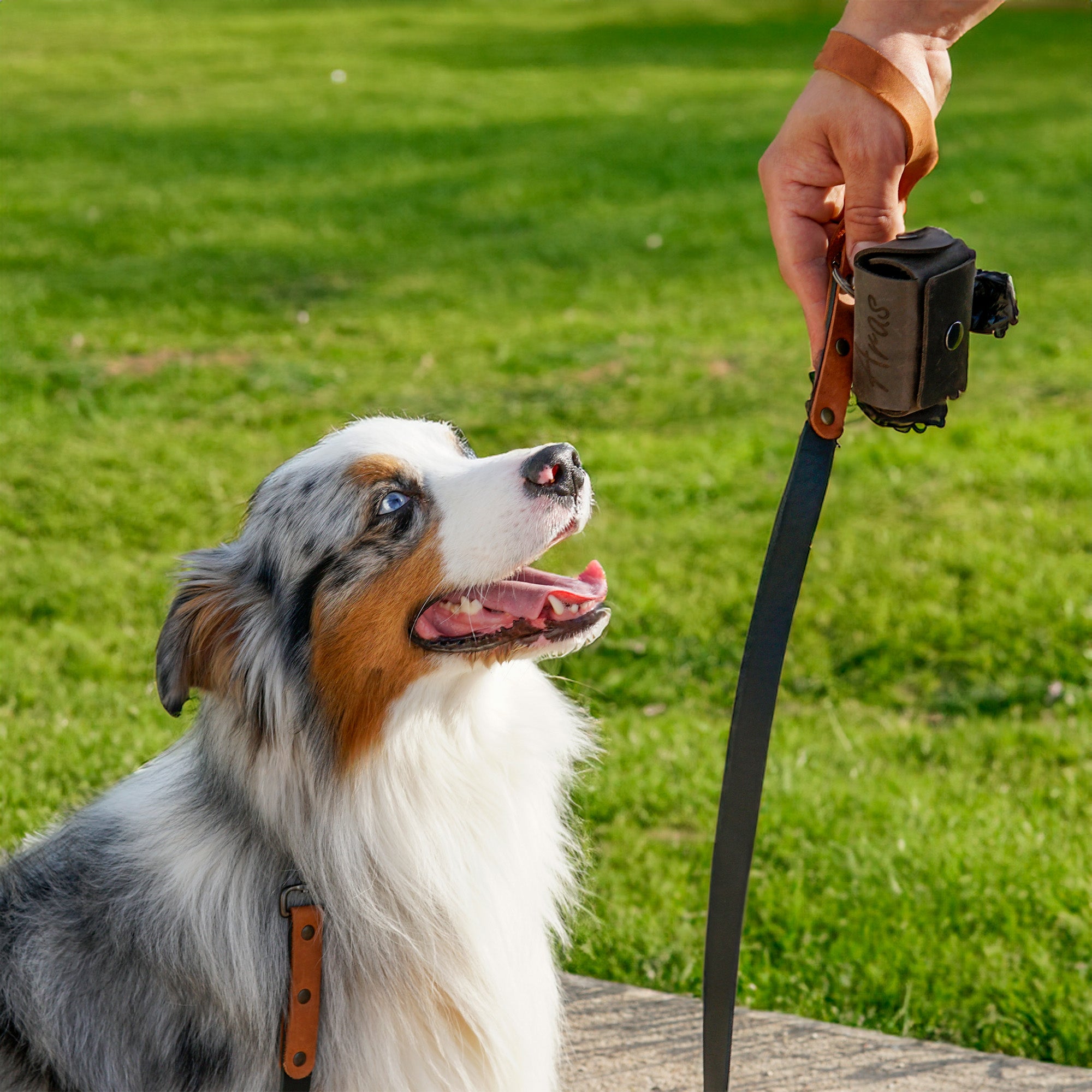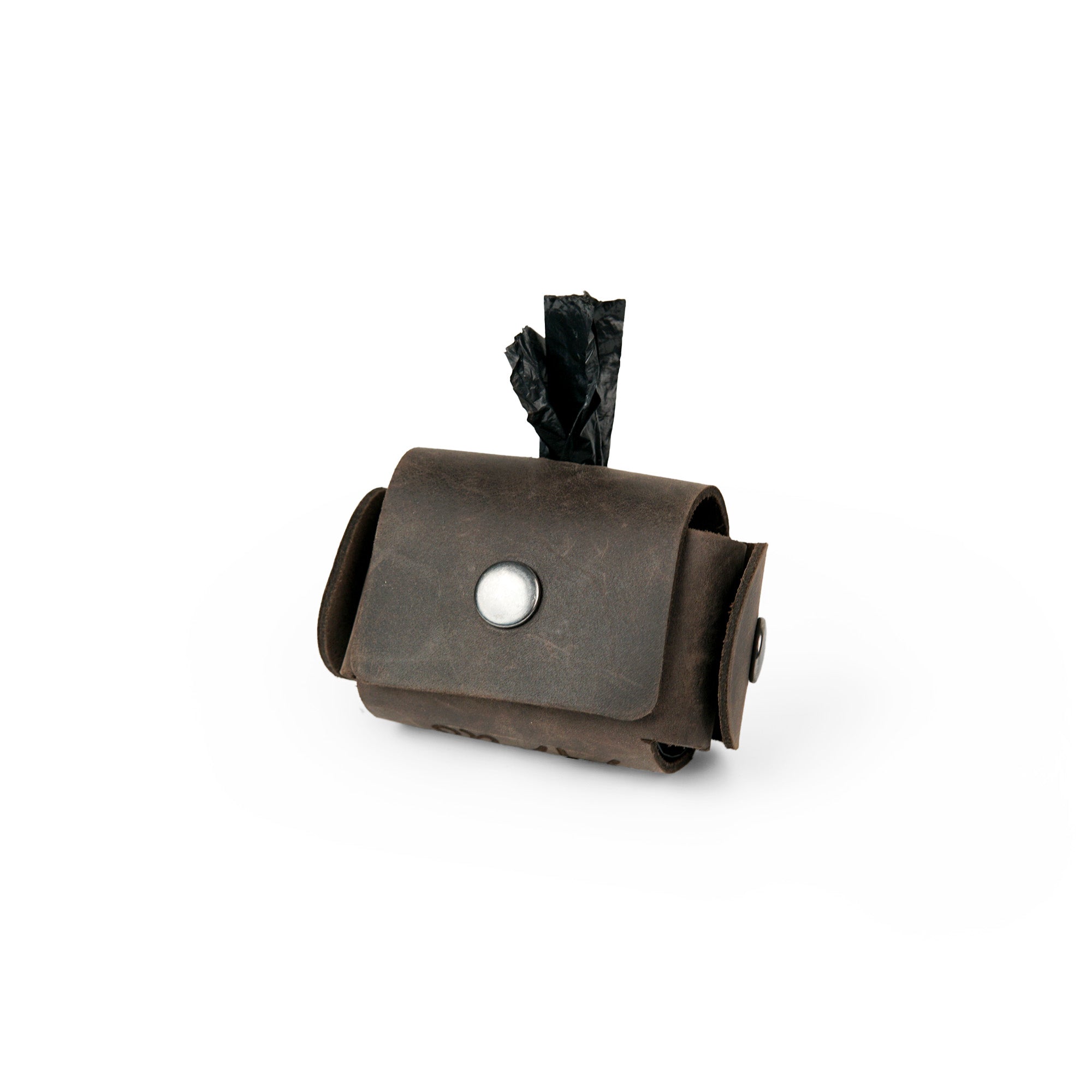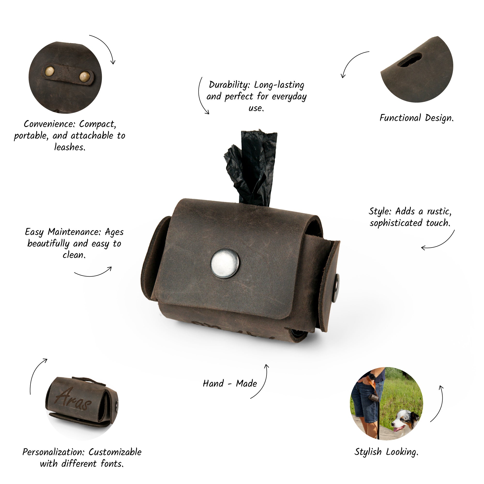 Handmade from soft, saddle leather, it securely holds a standard roll of bags. The snap closure ensures bags won’t tear, and it easily attaches to a leash for hands-free carrying.