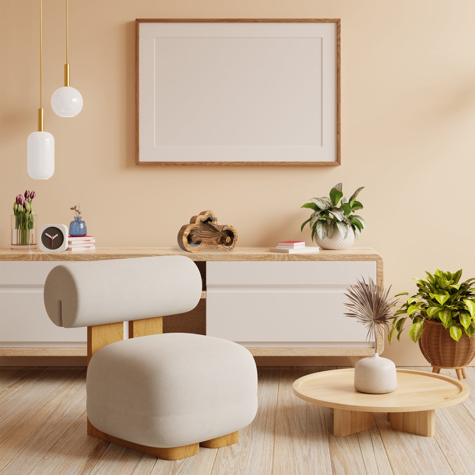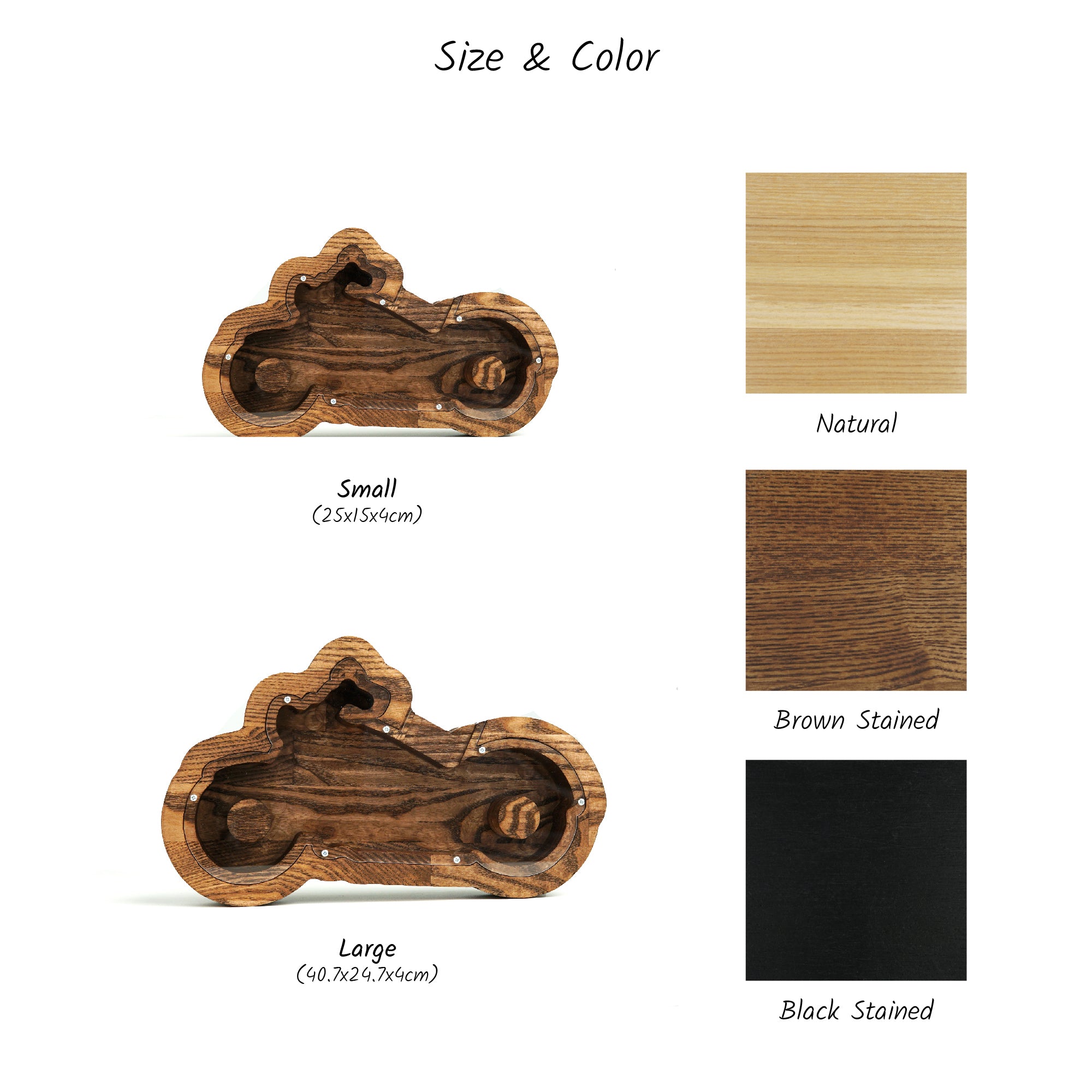 In summary, our Wooden Piggy Bank Motorcycle is more than just a savings tool; it's a conversation starter, a symbol of craftsmanship, and a personal canvas for your unique touch. With sizes to fit any space and the option to engrave custom words, it's a versatile gift that suits a multitude of occasions and brings timeless charm to your home. Elevate your savings game and home decor with this exceptional wooden masterpiece.