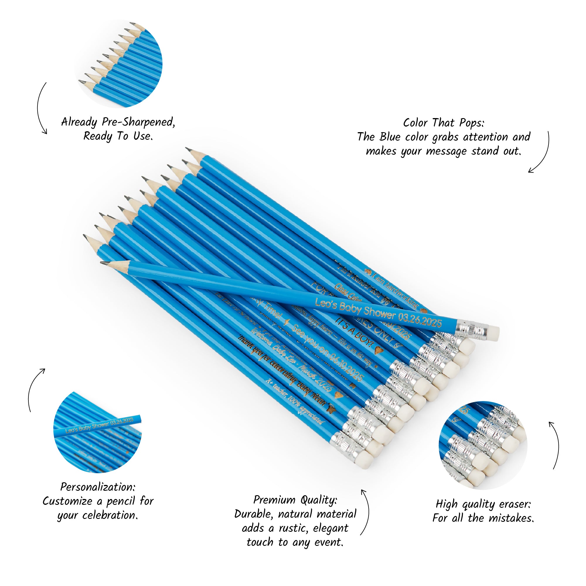 Please write the text you'd like on the pencils in the 'additional comment' section.
