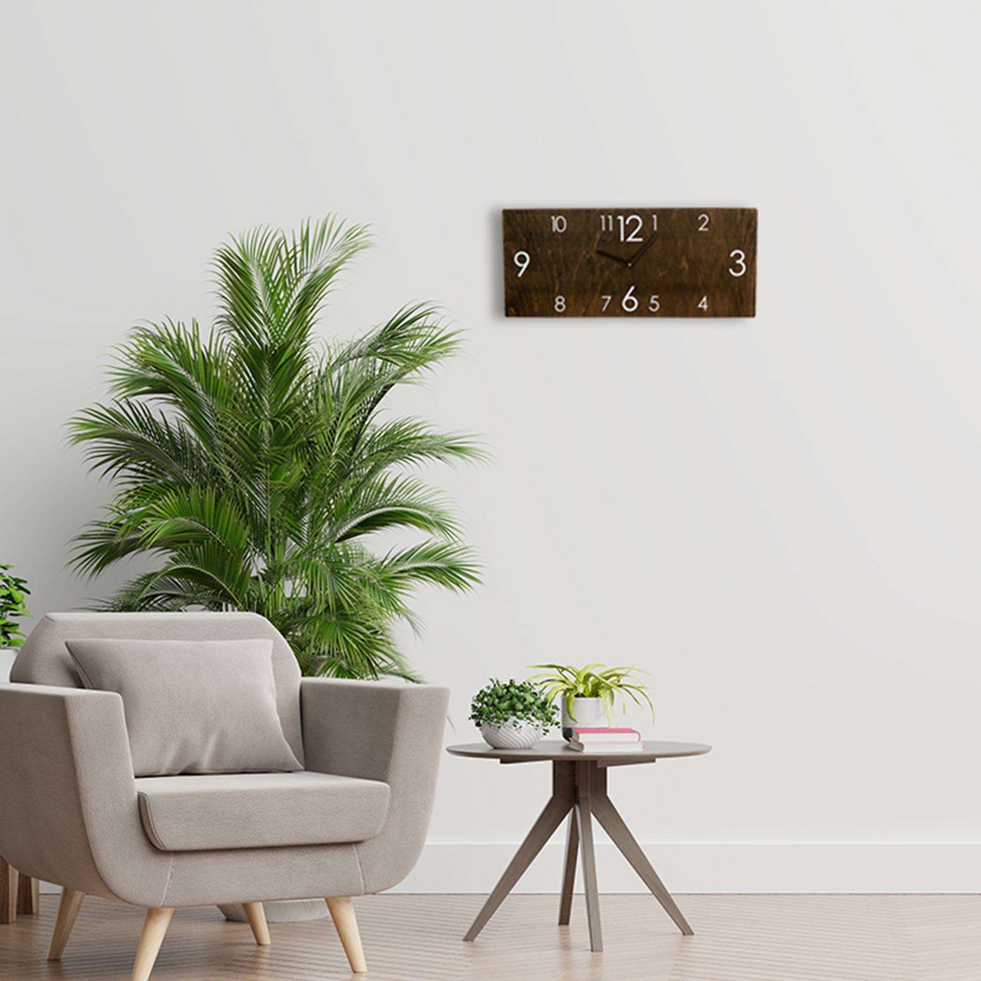 This is a wonderful brown rectangular wooden wall clock with acrylic glass white figures. This medium-sized clock will look fashionable on your wall and will be a great and practical wall decoration for any room in your home, office, or workplace. In addition, it does not make any ticking sound, so it will not irritate you when you want silence and rest.