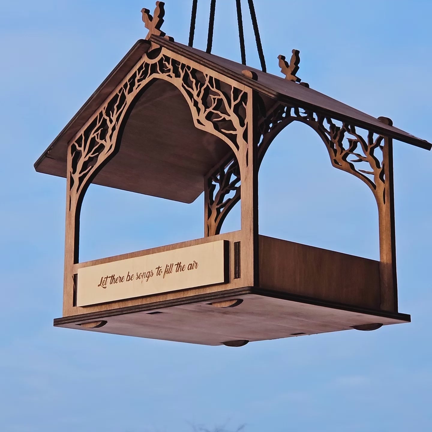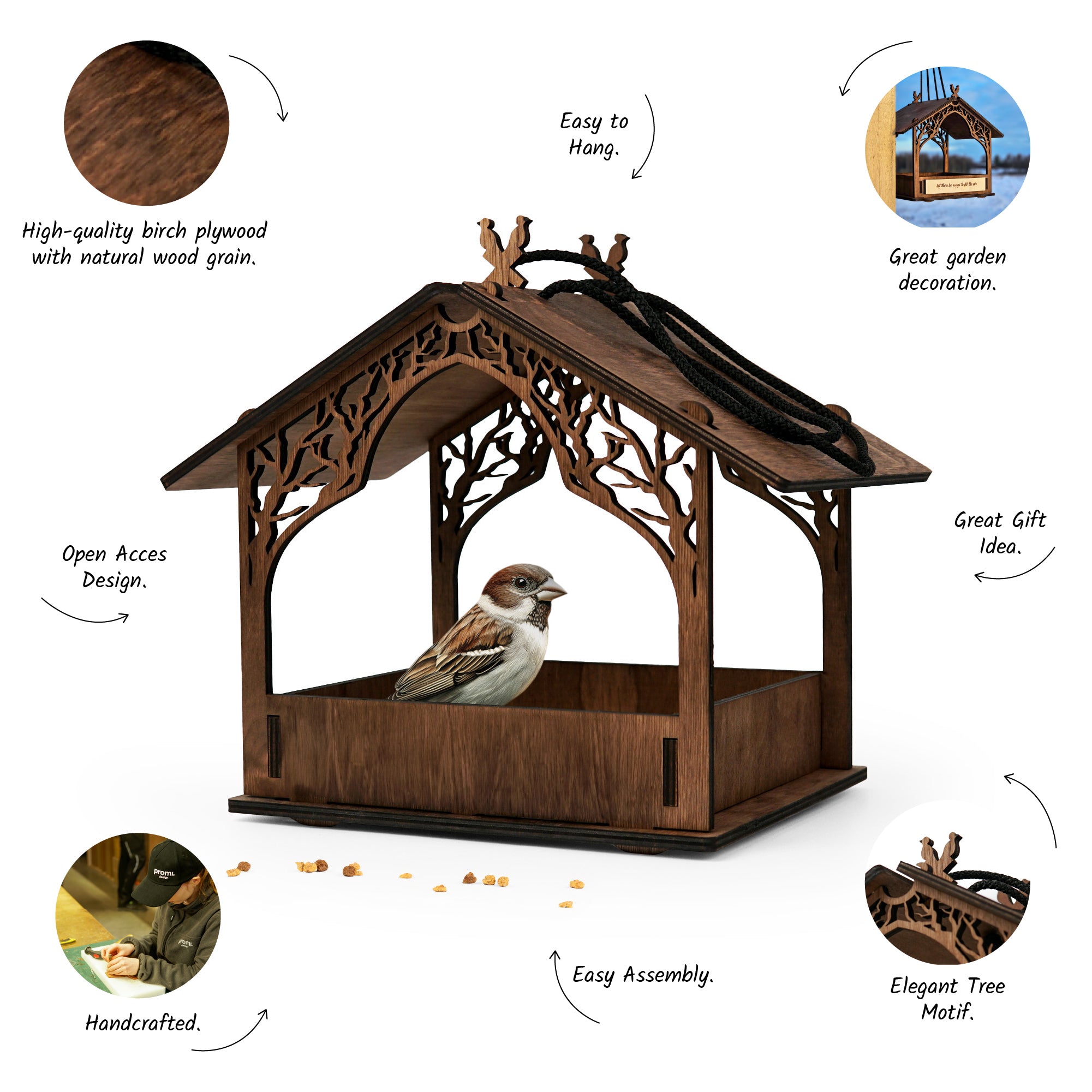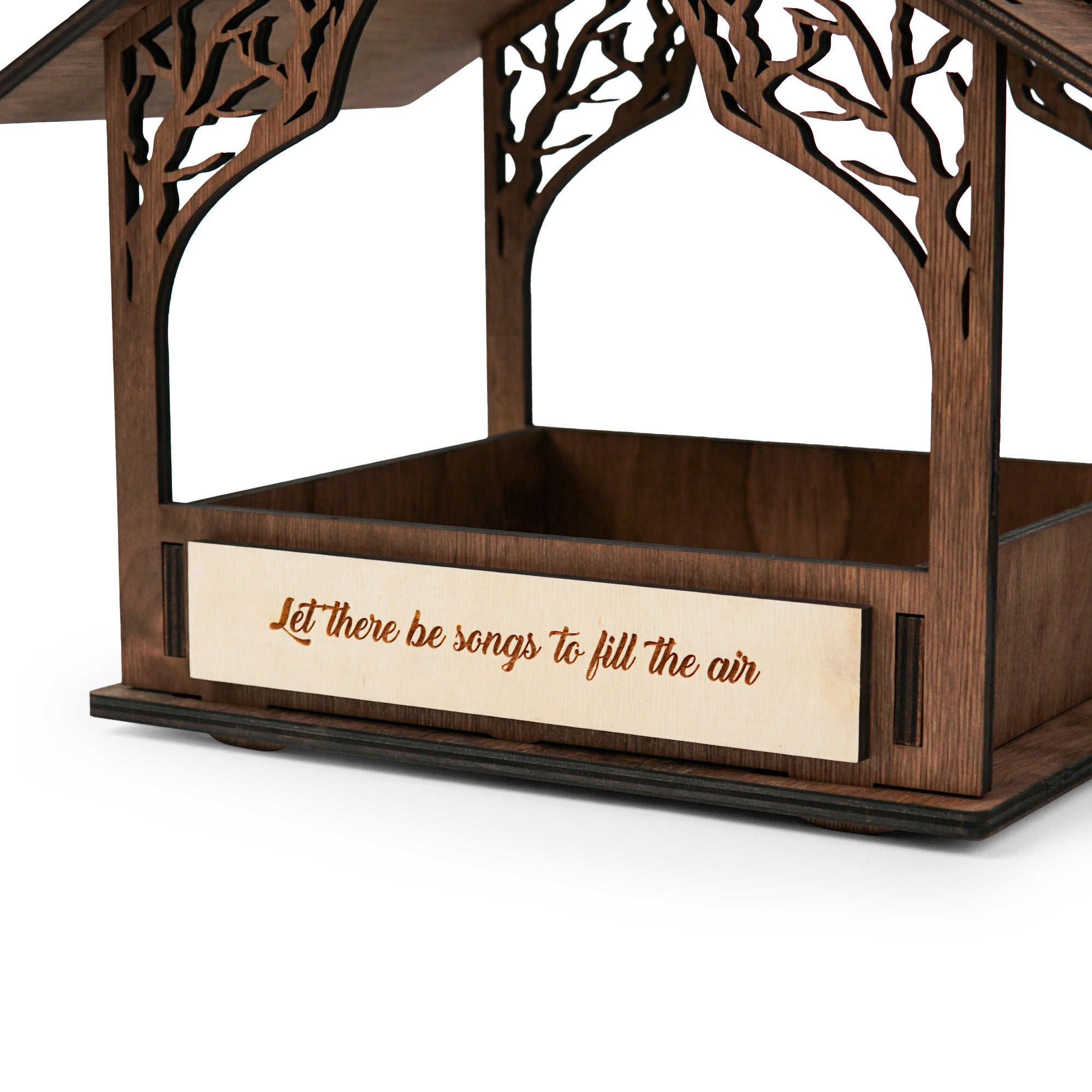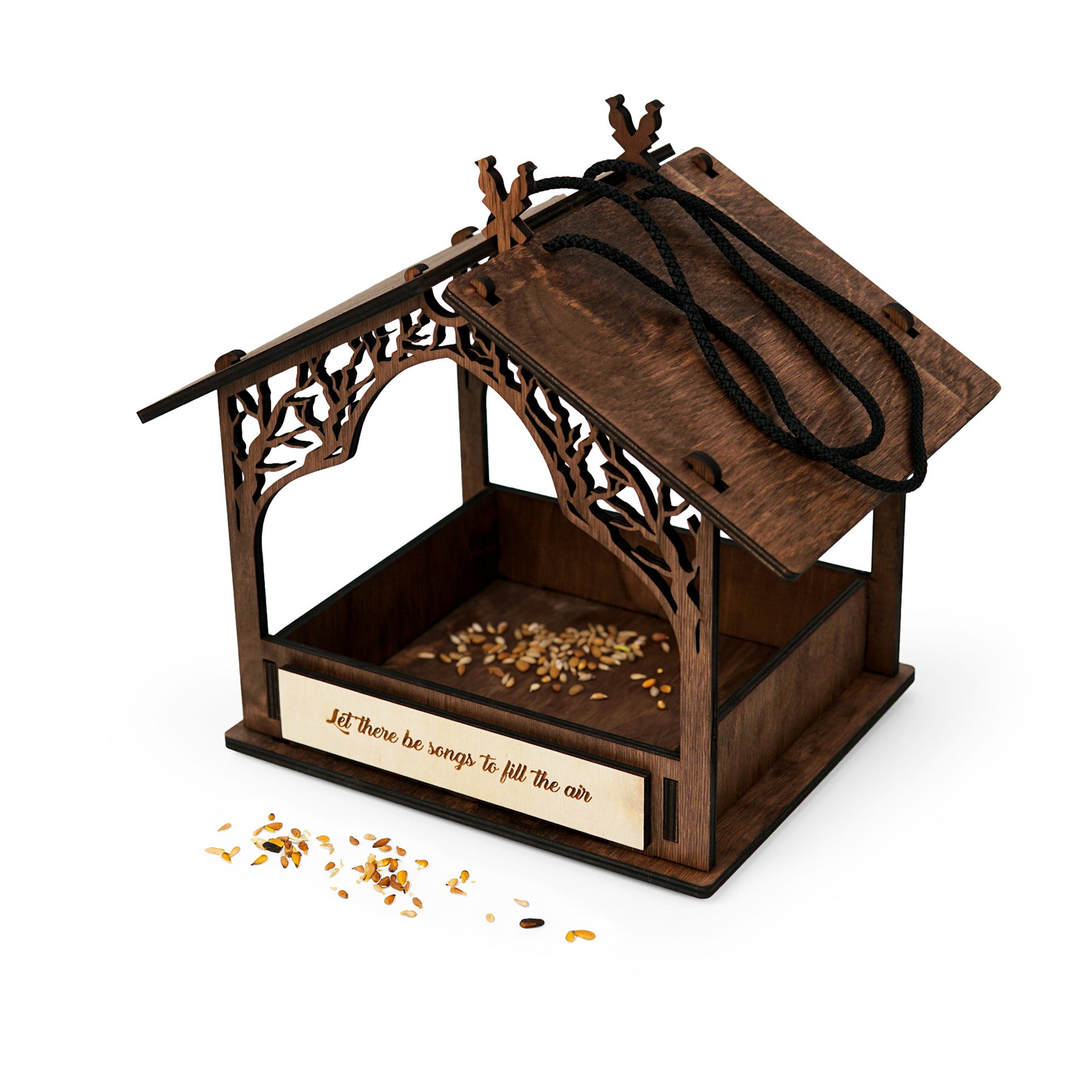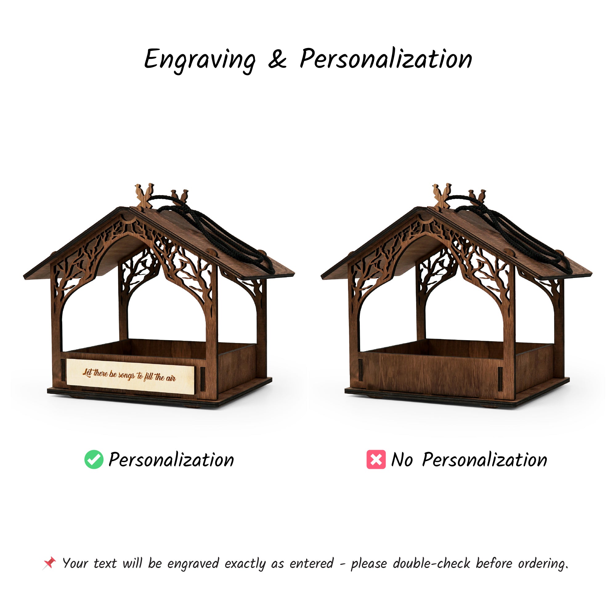 This personalized bird feeder is a handcrafted wooden piece made from durable birch plywood, featuring a detailed laser-cut tree design. Combining both style and function, it serves as a beautiful addition to any outdoor space. Its natural wood finish and rustic charm make it an ideal choice for gardens, porches, balconies, or yards. Whether you use it as a birdhouse or a decorative accent, this piece brings a touch of nature to your surroundings while offering a practical solution for bird feeding.